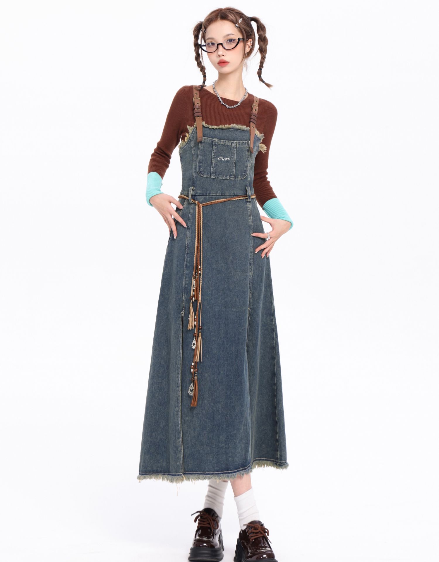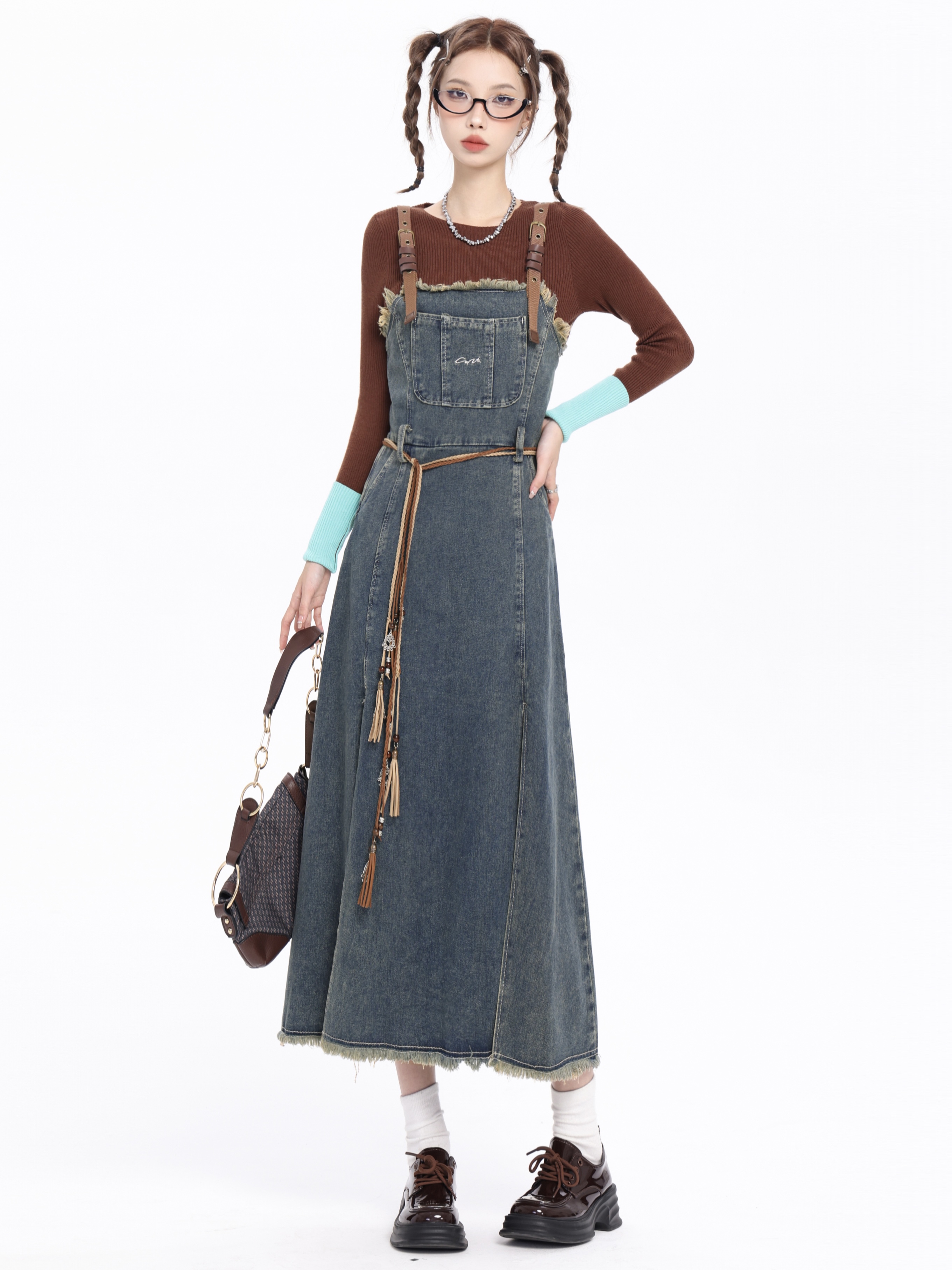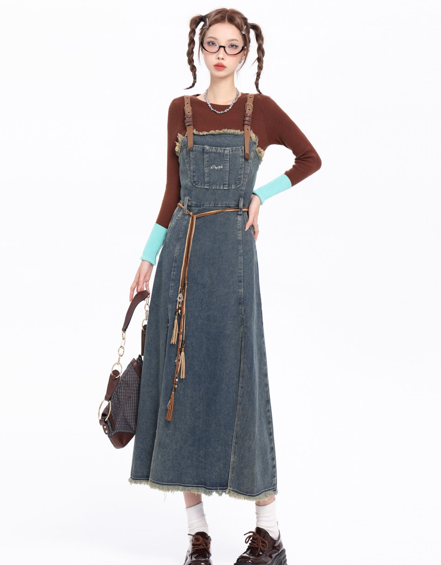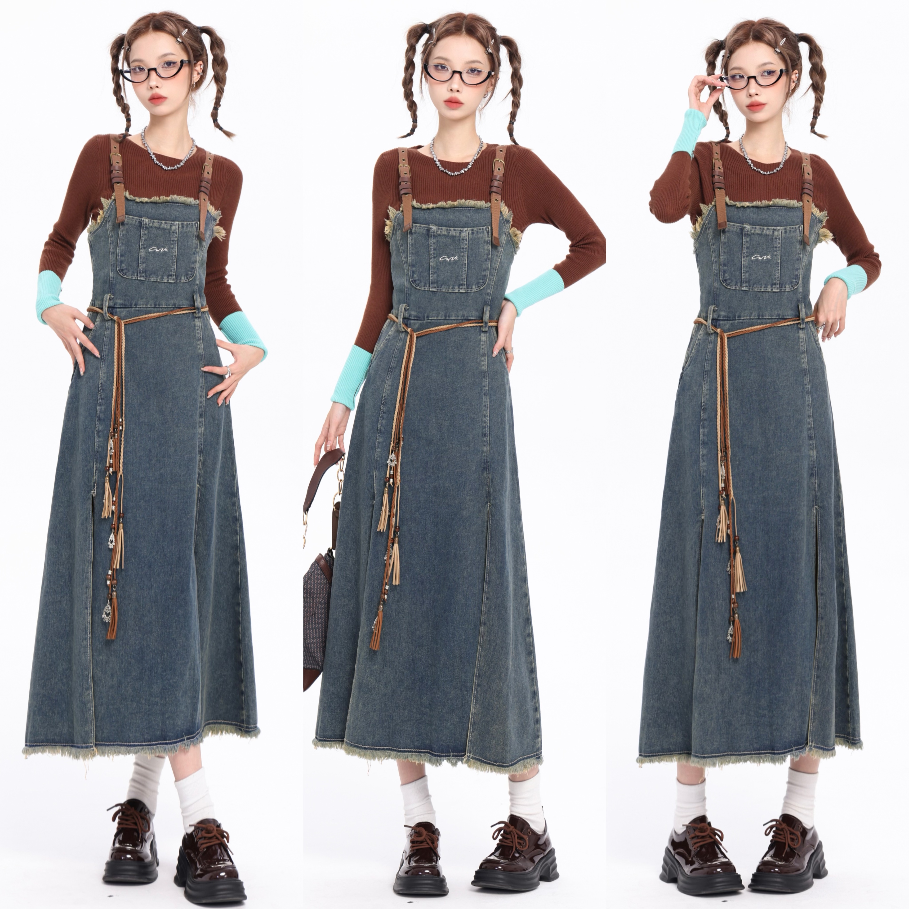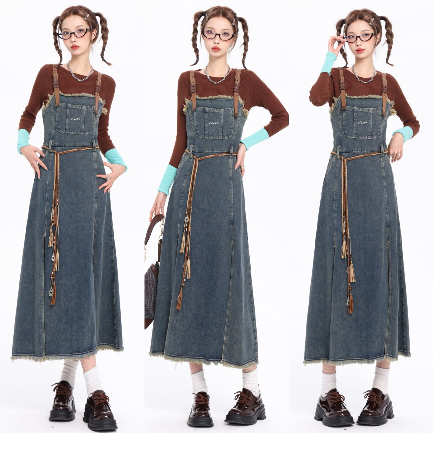 Chic韓搭復古皮扣收腰顯瘦牛仔抱嬰袋裙小眾設計流蘇吊帶長裙洋裝