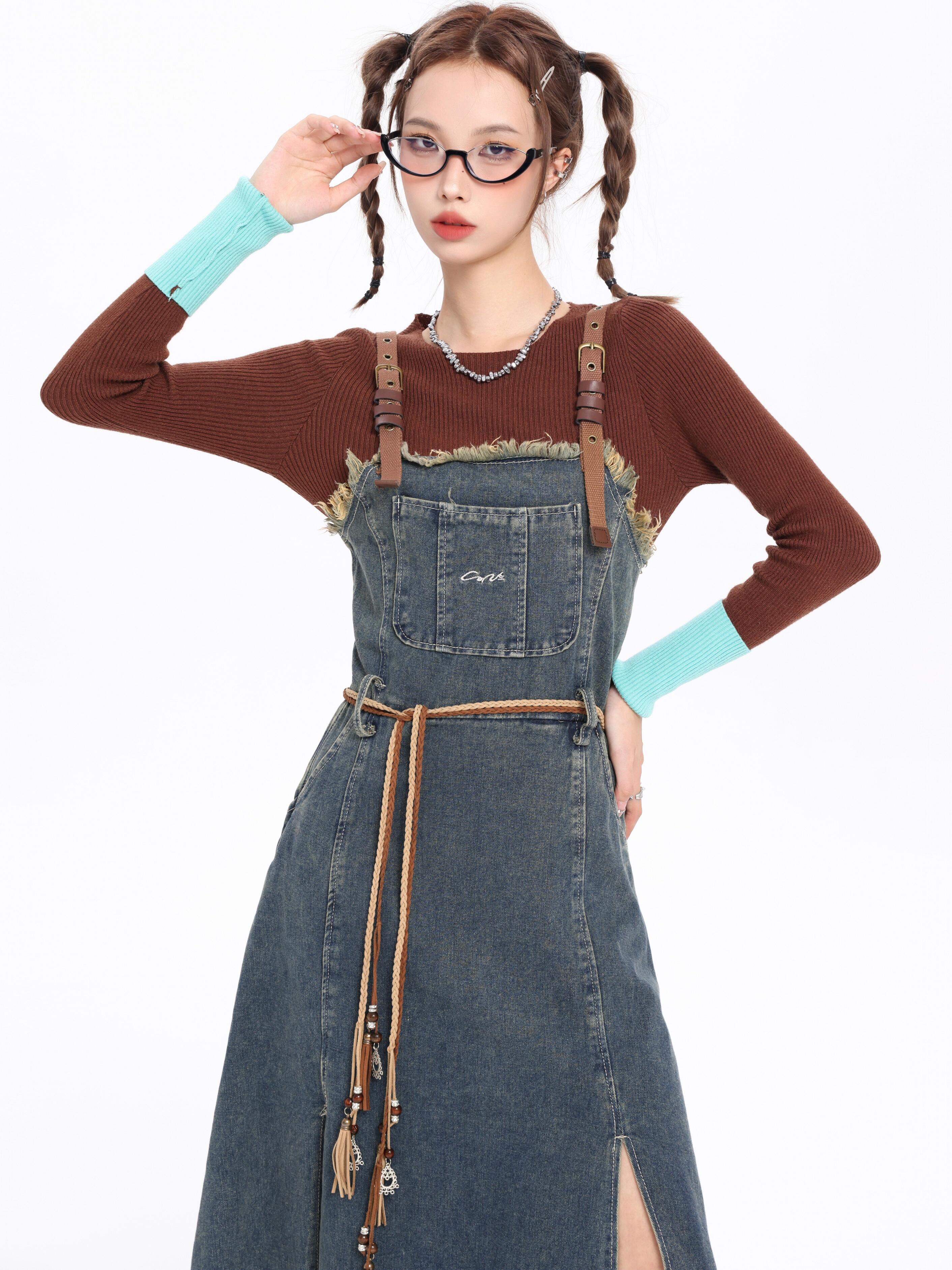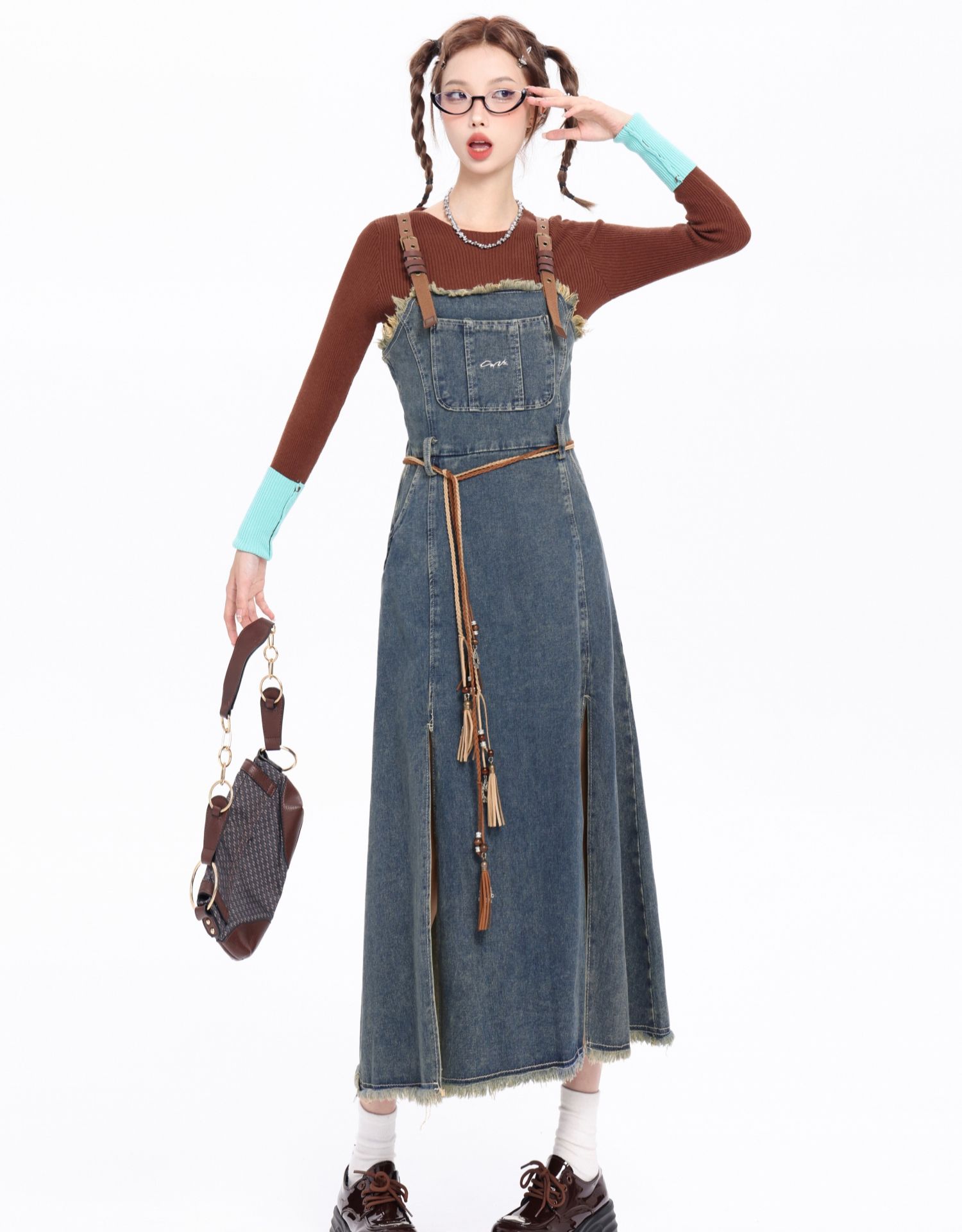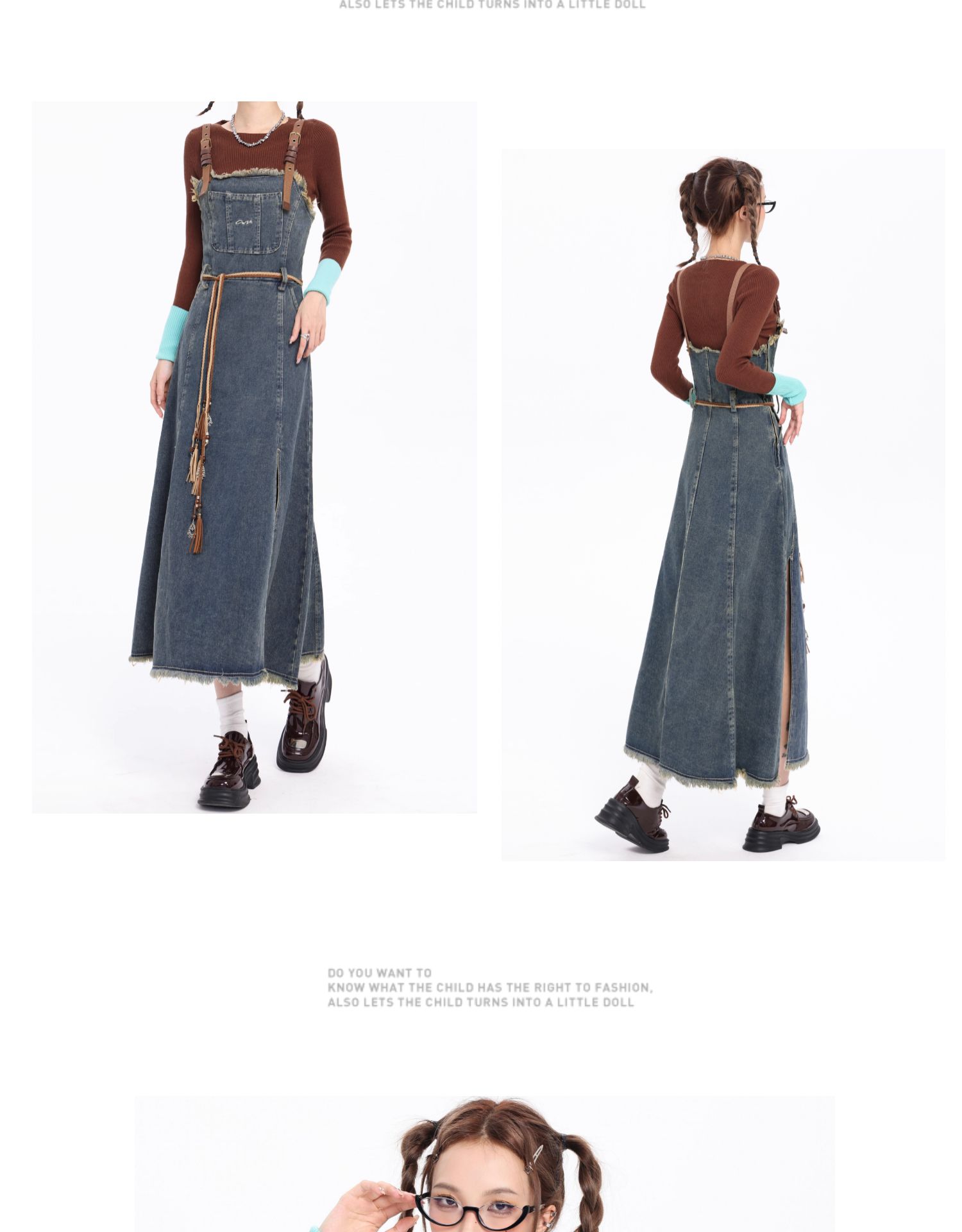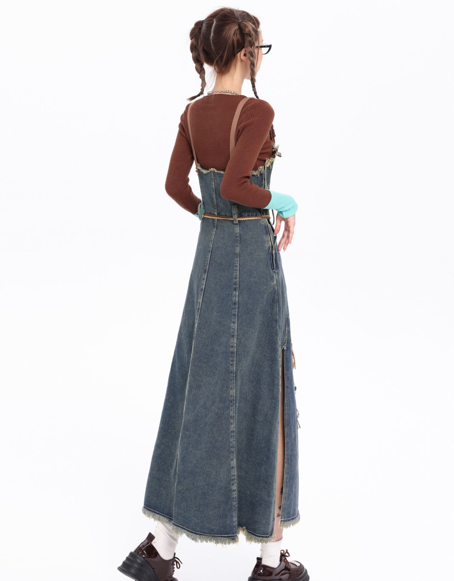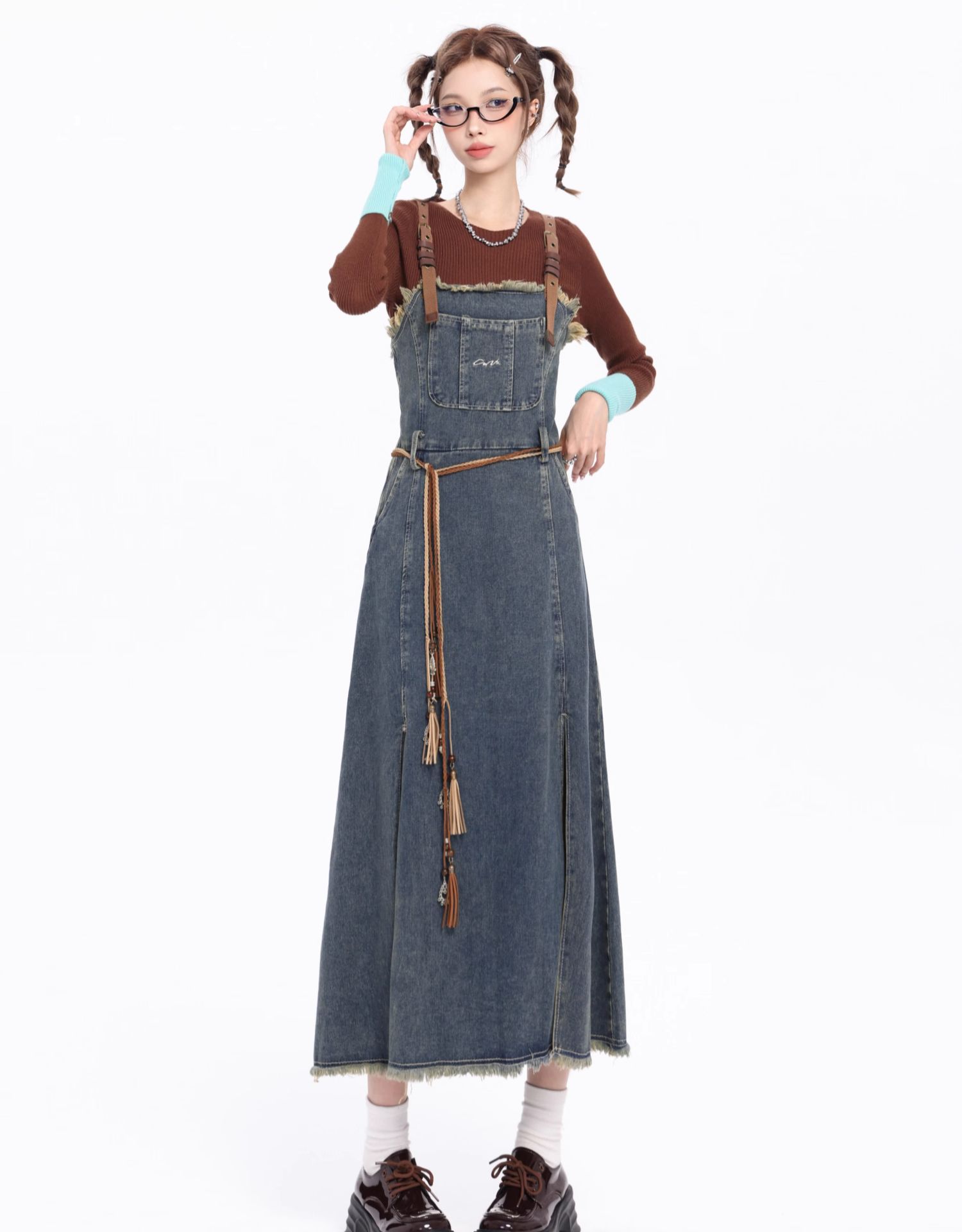 Chic韓搭復古皮扣收腰顯瘦牛仔抱嬰袋裙小眾設計流蘇吊帶長裙洋裝