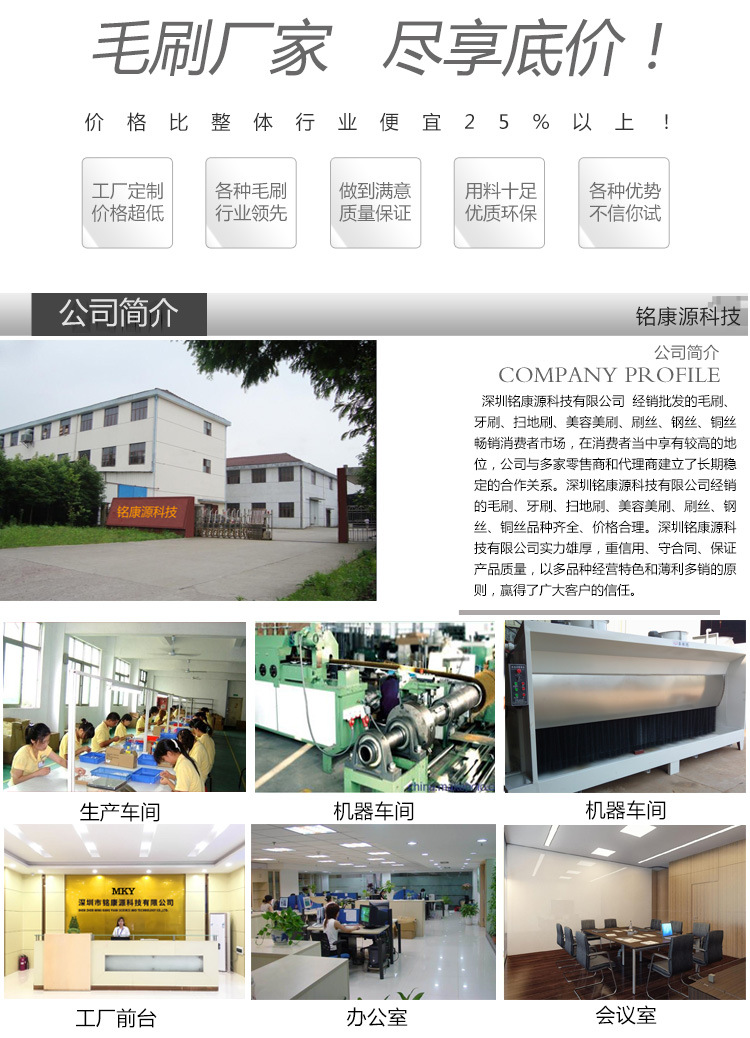深圳市铭康毛刷厂成立于2008年。是一家专业生产.加工.牙刷.扫把.工业刷.洗面刷.铜丝刷.高尔夫球刷.按摩刷.木柄刷等的个体经营,公司总部设在深圳市龙岗区,深圳市铭康毛刷厂拥有完整、科学的质量管理体系。本公司还包括设计开模注塑一条龙服务。工厂以诚信、实力和产品质量获得业界的认可。欢迎各界朋友莅临本厂参观、指导和业务洽谈。