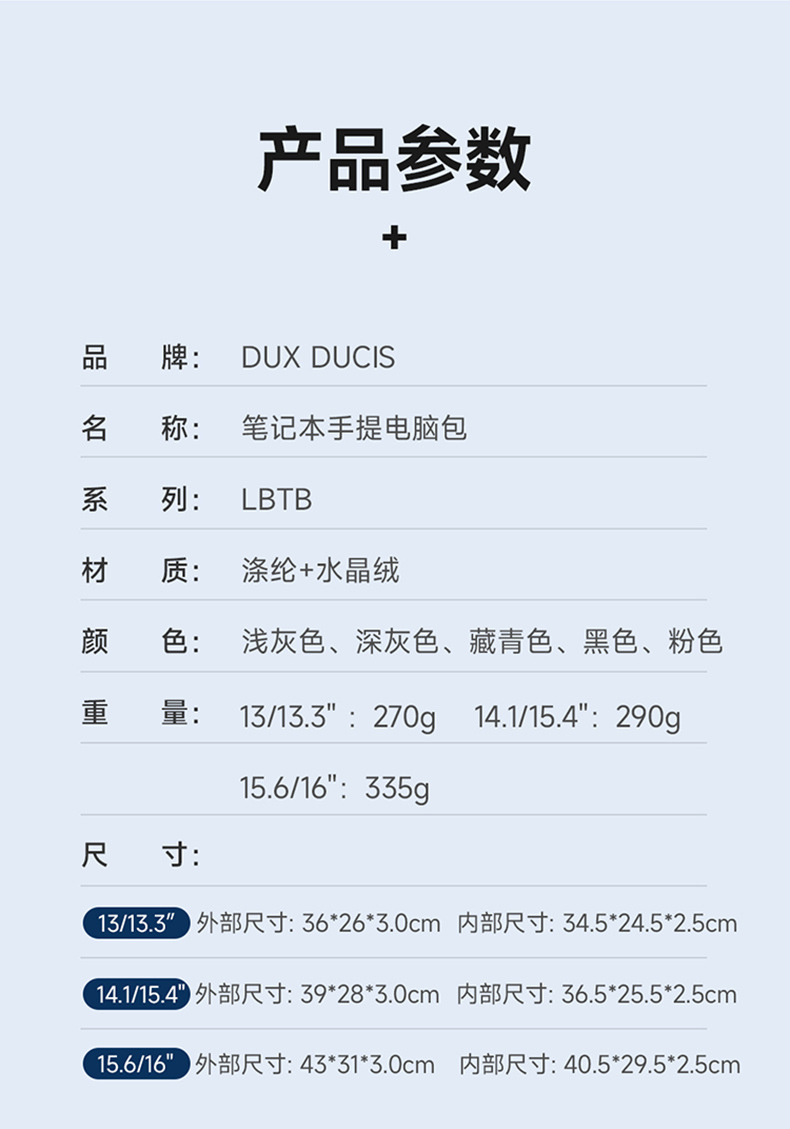 颜色 (13-13.9寸)手提电脑包 深灰色,(13-13.9寸)手提电脑包 浅灰色,(13-13.9寸)手提电脑包 黑色,(13-13.9寸)手提电脑包 藏青色,(13-13.9寸)手提电脑包 粉色,(14-15.4寸)手提电脑包 深灰色,(14-15.4寸)手提电脑包 浅灰色,(14-15.4寸)手提电脑包 黑色,(14-15.4寸)手提电脑包 藏青色,(14-15.4寸)手提电脑包 粉色,(15.5-16寸)手提电脑包 深灰色,(15.5-16寸)手提电脑包 浅灰色,(15.5-16寸)手提电脑包 黑色,(15.5-16寸)手提电脑包 藏青色,(15.5-16寸)手提电脑包 粉色