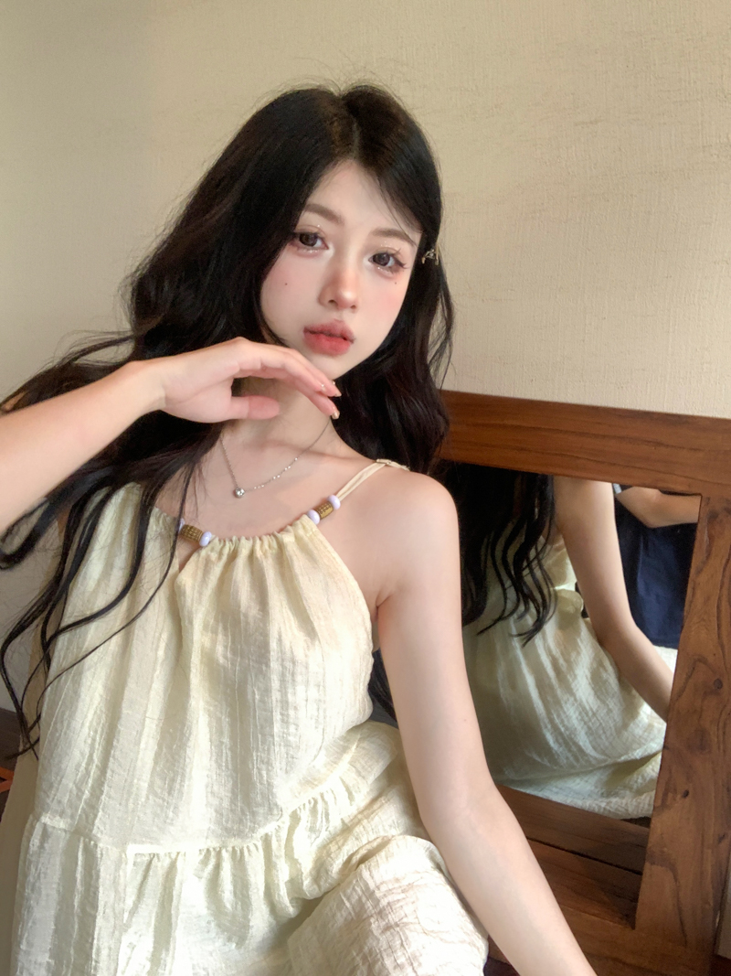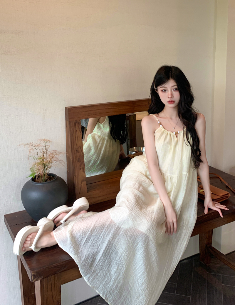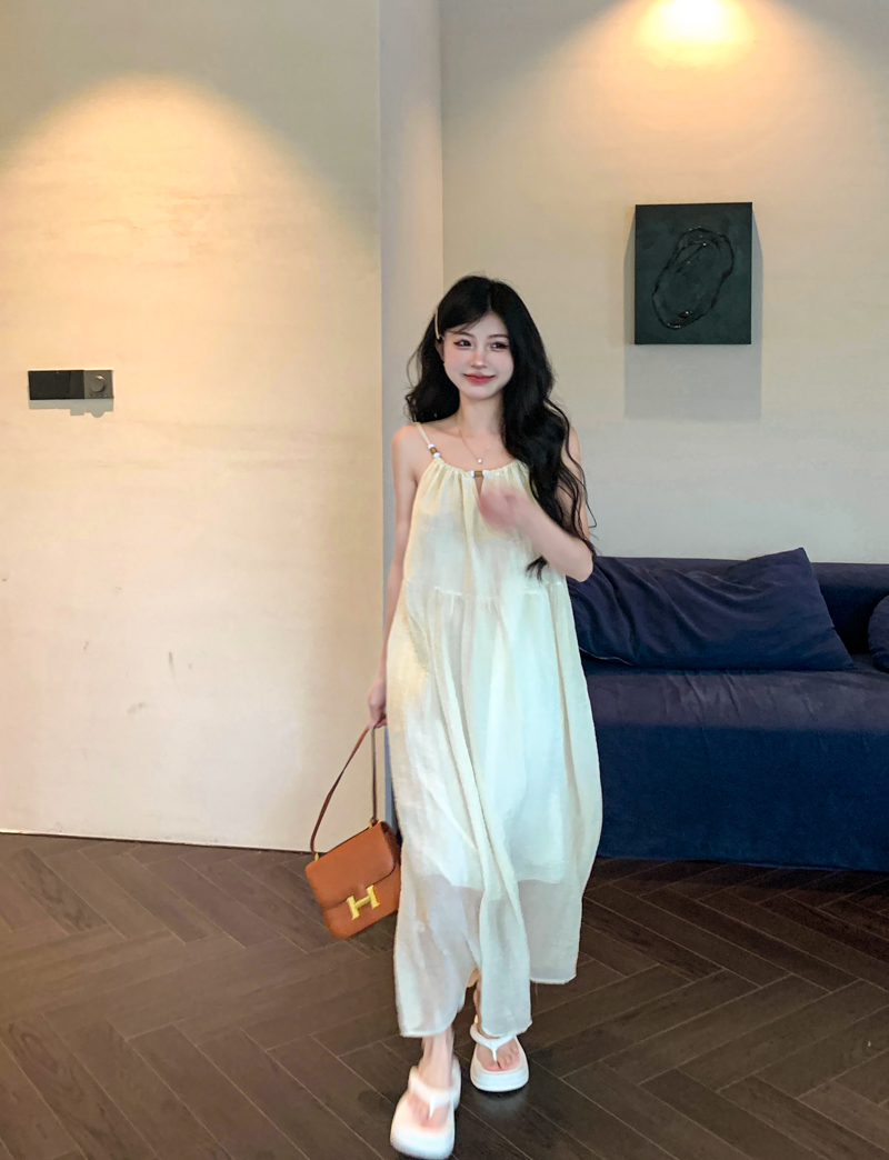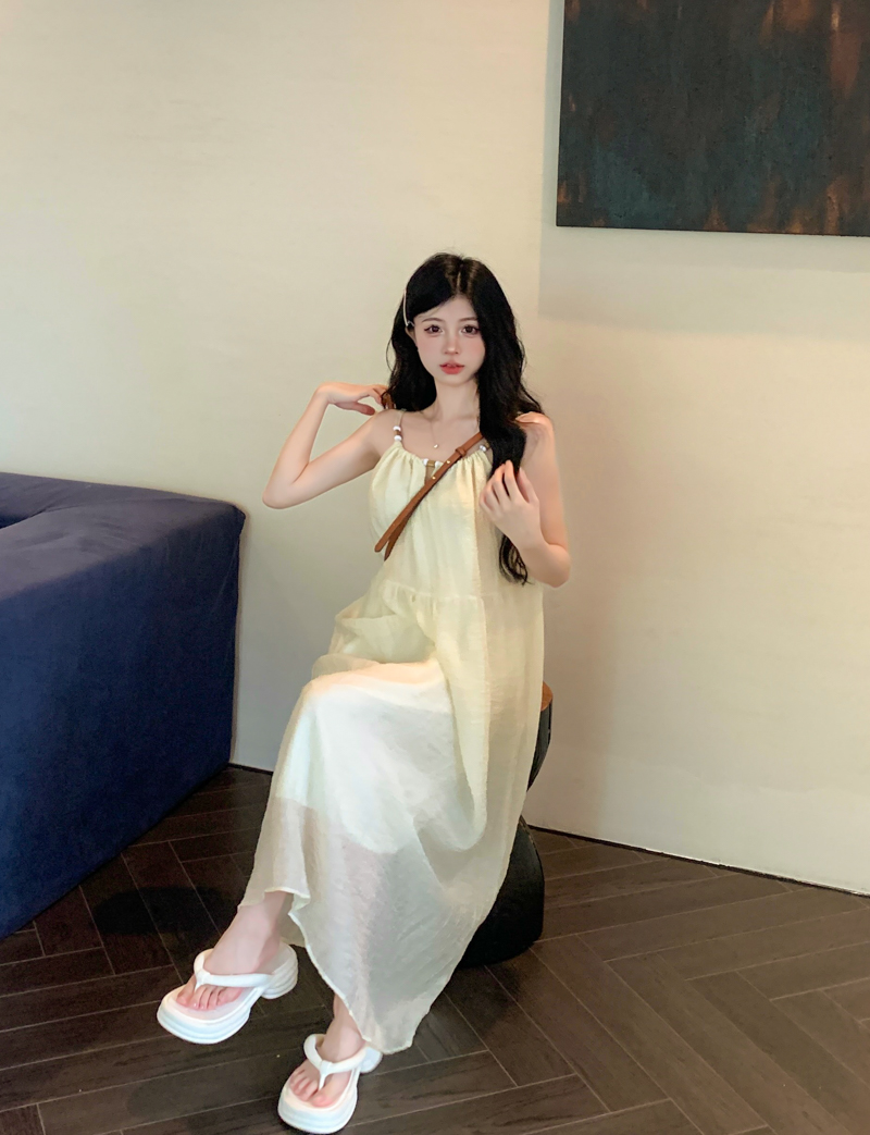 PPHOME甜美系花~海邊度假風顯瘦無袖吊帶洋裝夏季高級A字裙長裙