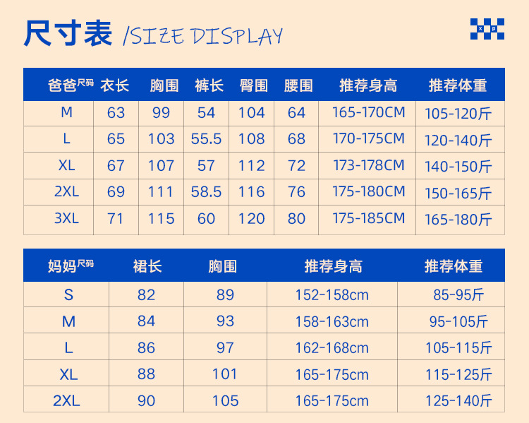 适合身高 妈妈S,妈妈M,妈妈L,妈妈XL,妈妈2XL,爸爸M,爸爸L,爸爸XL,爸爸2XL,爸爸3XL,男宝90,男宝100,男宝110,男宝120,男宝130,男宝140,男宝150,男宝160,女宝90,女宝100,女宝110,女宝120,女宝130,女宝140,女宝150
