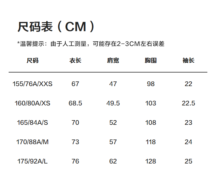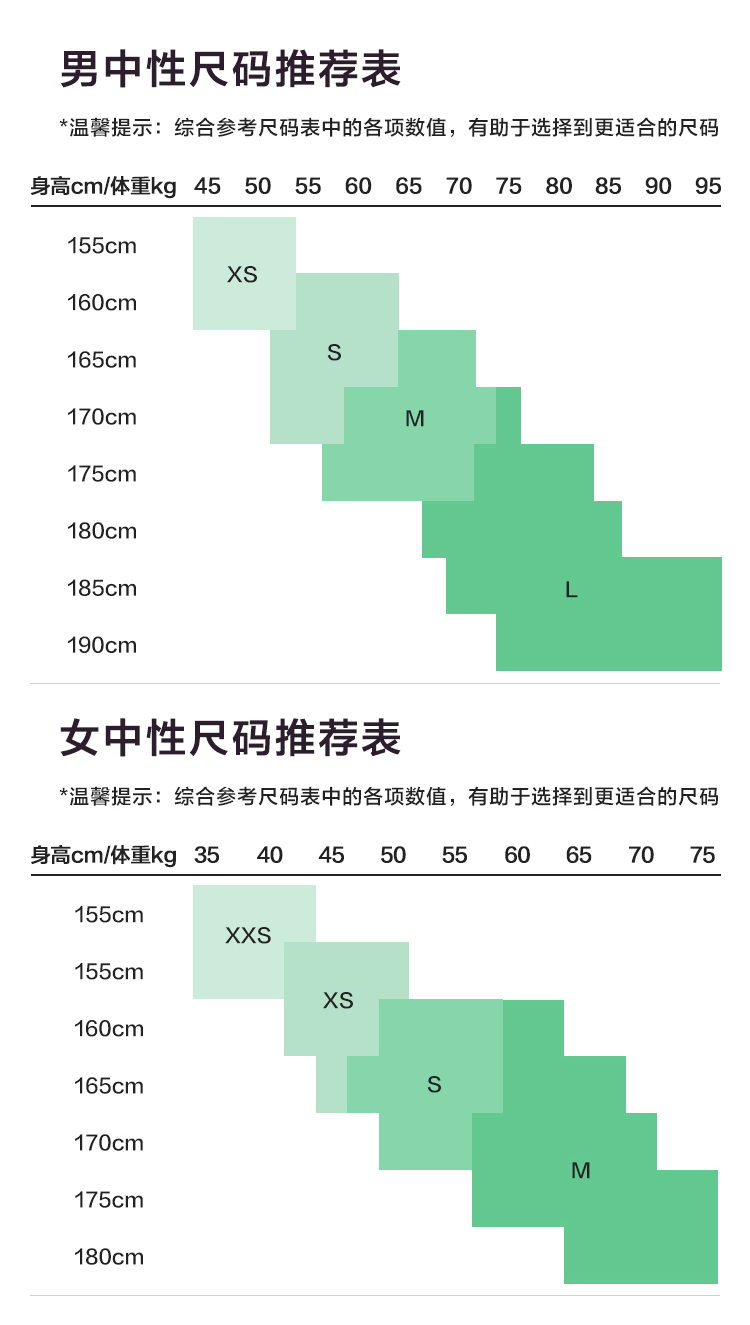 尺碼 155/76A/XXS 160/80A/XS 165/84A/S 170/88A/M 175/92A/L
