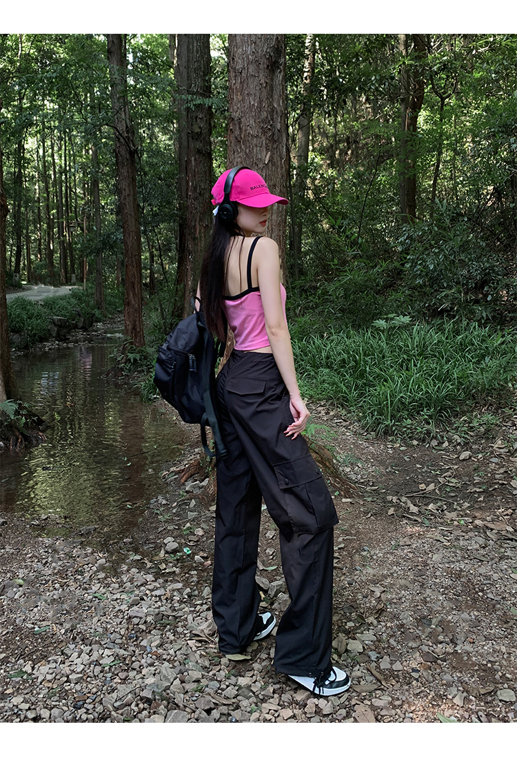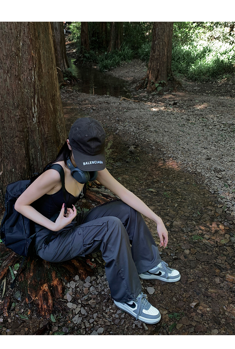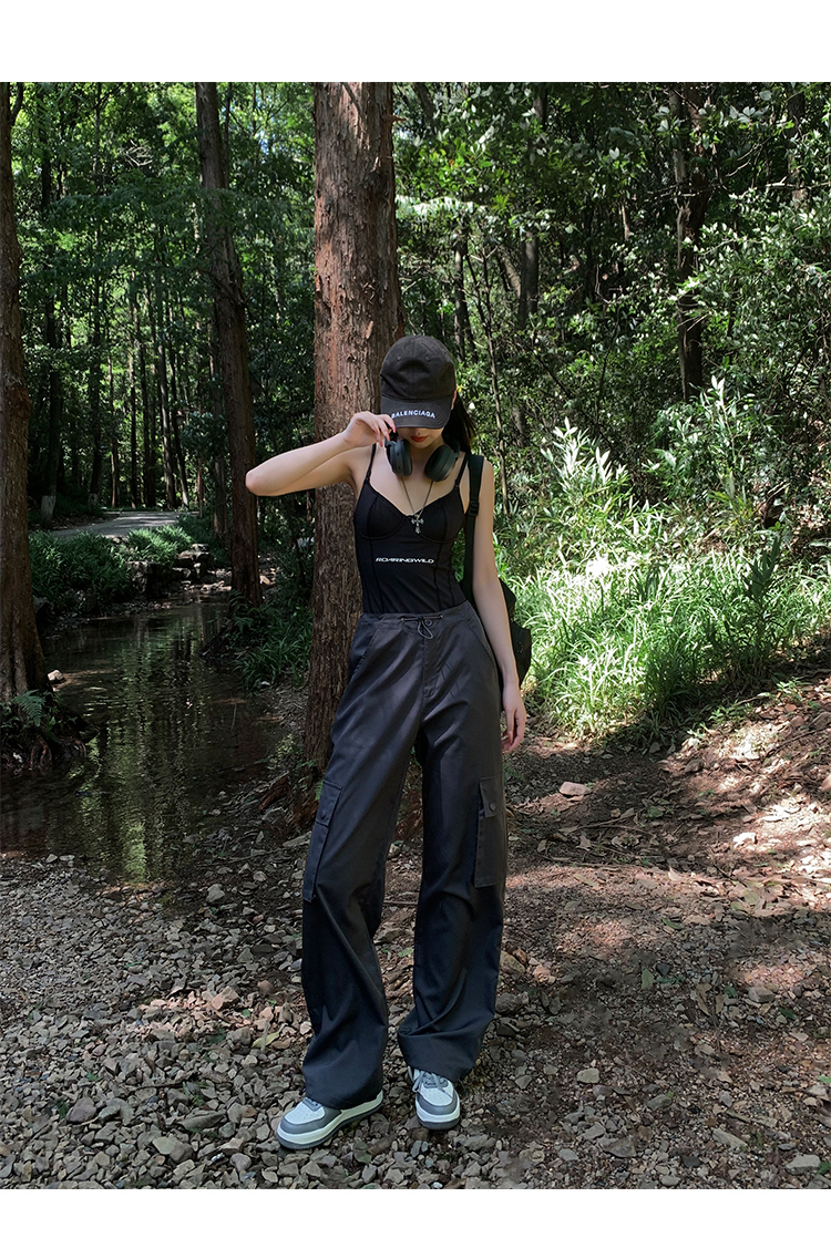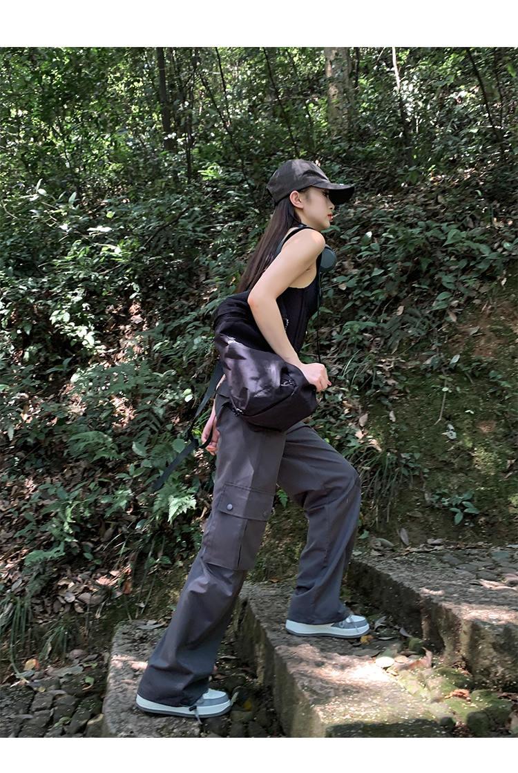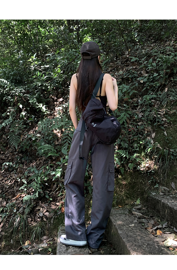美式露營風辣妹多口袋工裝褲女春季寬鬆薄款紙袋褲休閒束腳直筒褲