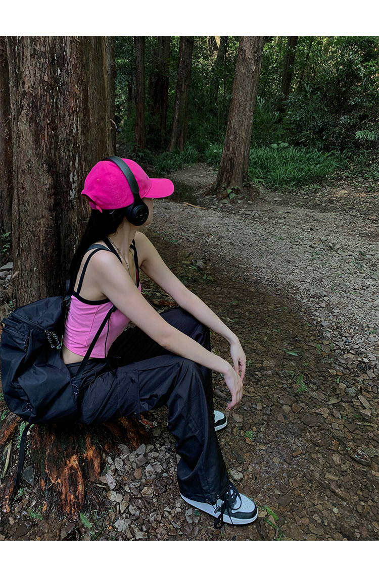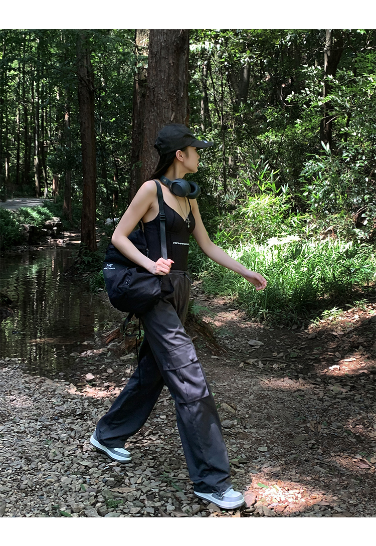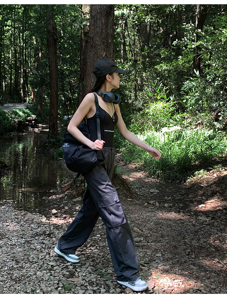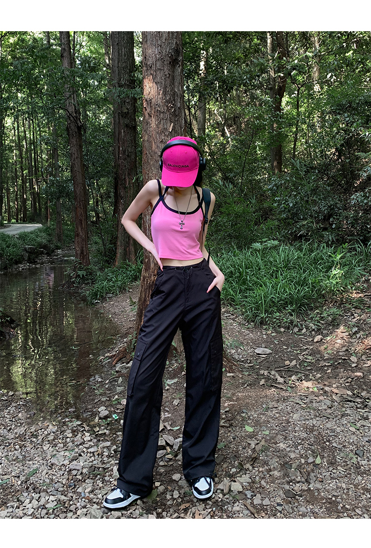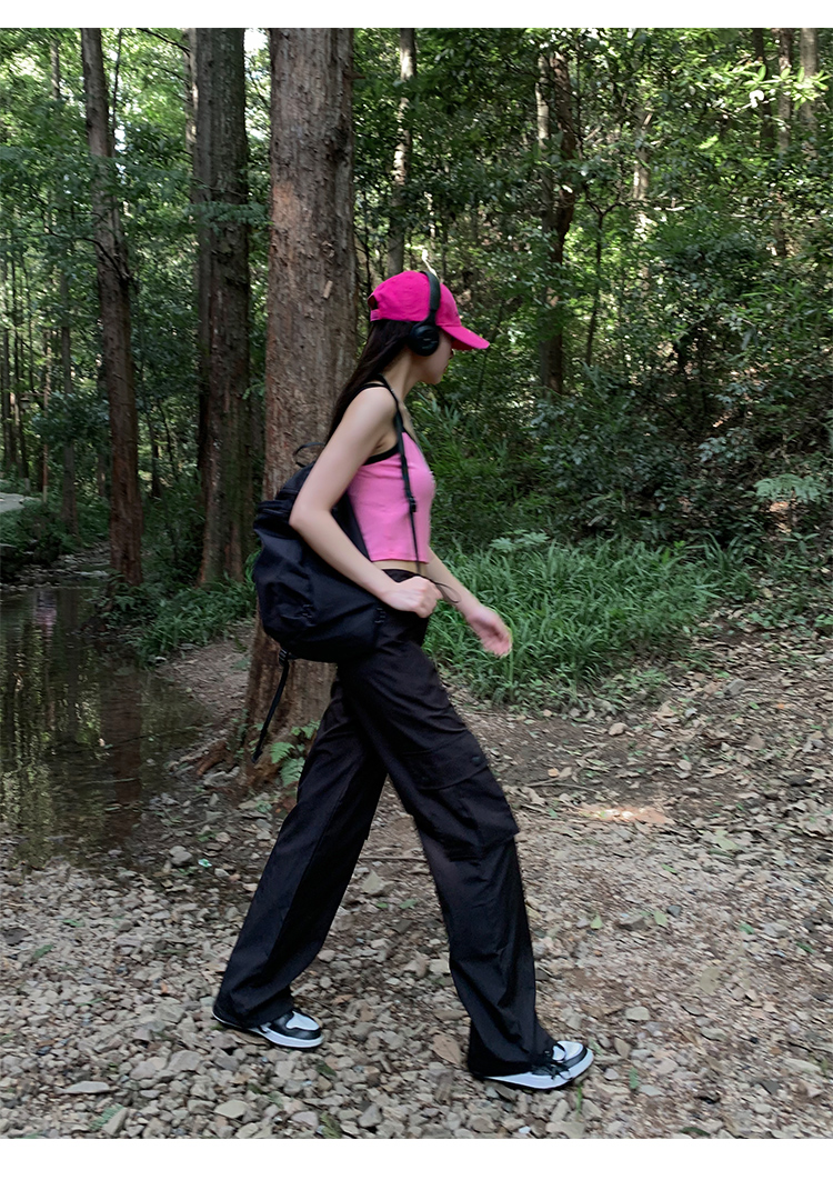 美式露營風辣妹多口袋工裝褲女春季寬鬆薄款紙袋褲休閒束腳直筒褲