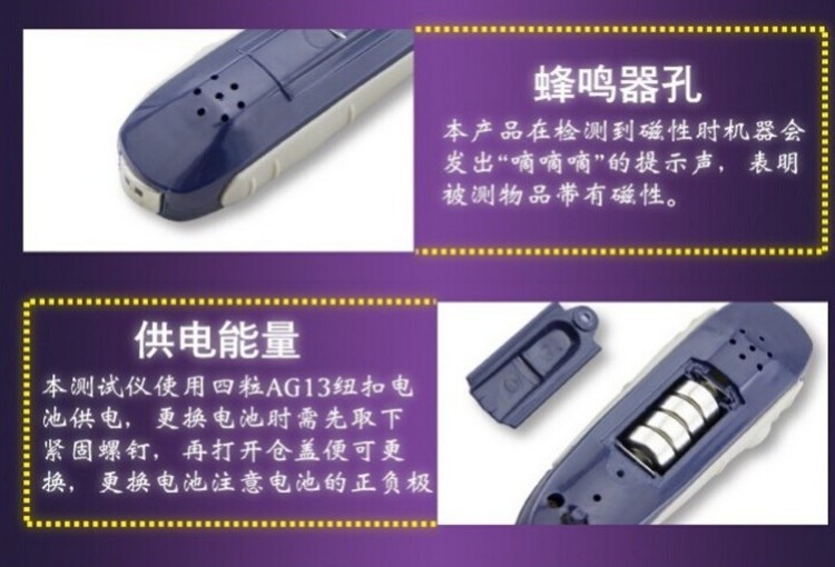 1.为了本鉴别仪的正常运作,在使用磁性检验量,请远离磁场并且不要在附近拔打或接听手机.