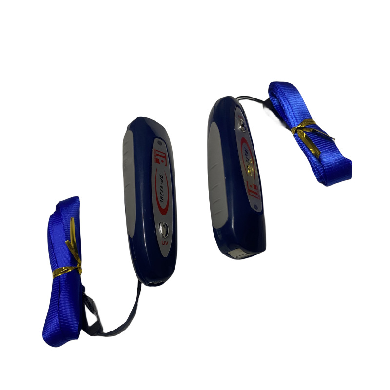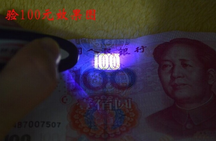 2.按下紫光键,对着钱币照射,您可看见钱币上的荧光图案;