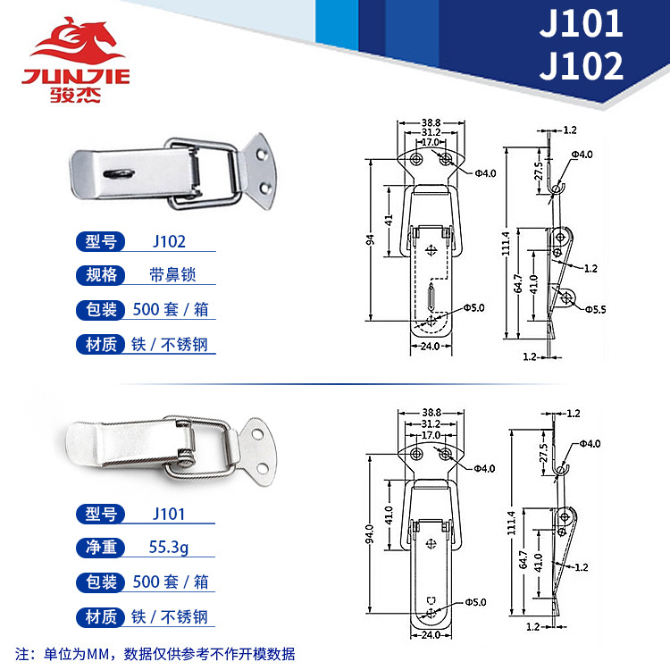 规格 J101 铁 镀镍,J101 不锈钢#201,J101 不锈钢#304,J102 铁 镀镍,J102 不锈钢#201,J102 不锈钢#304