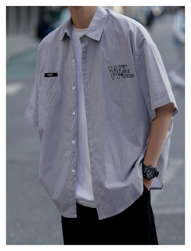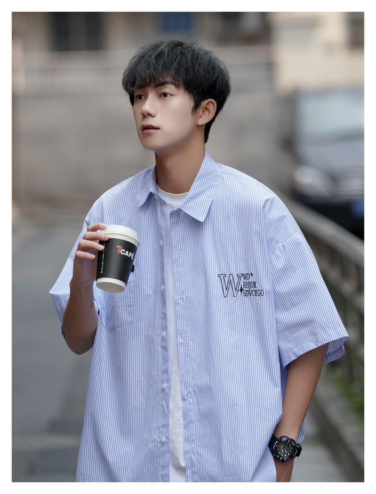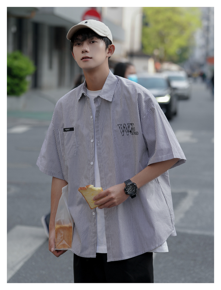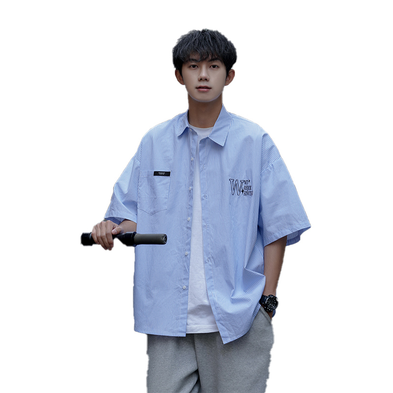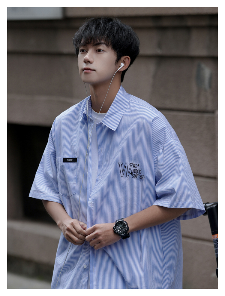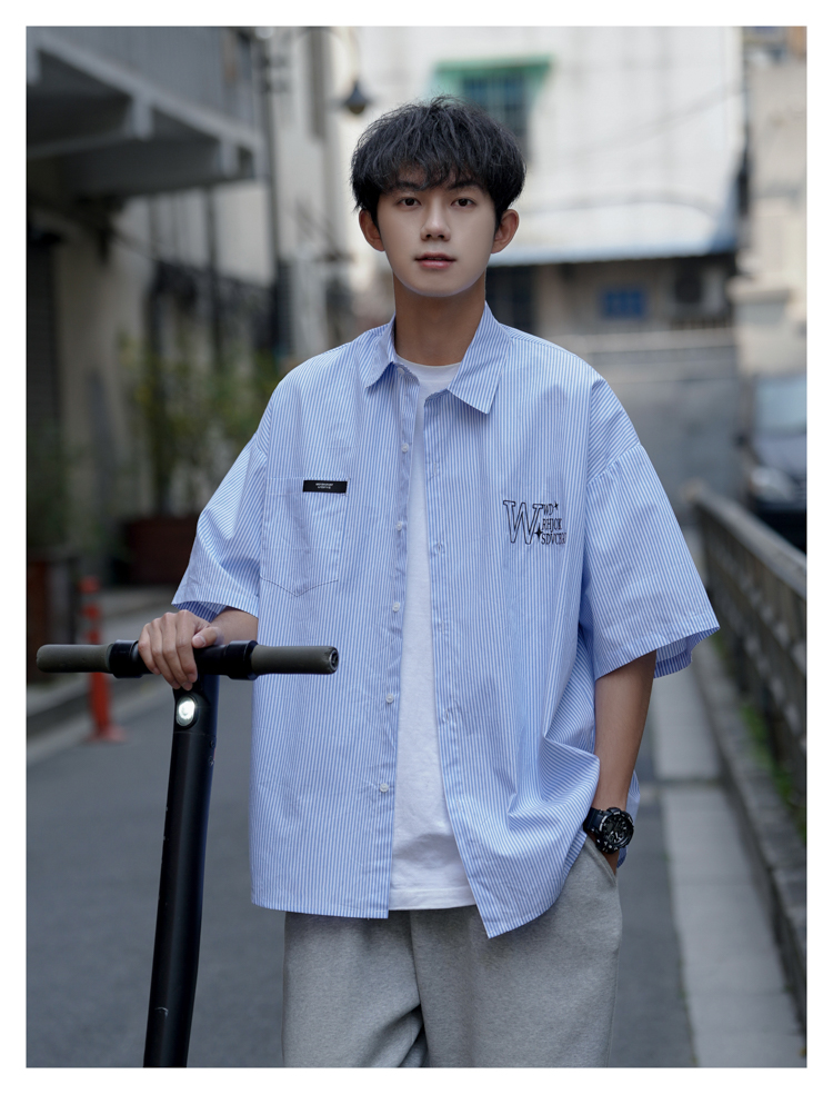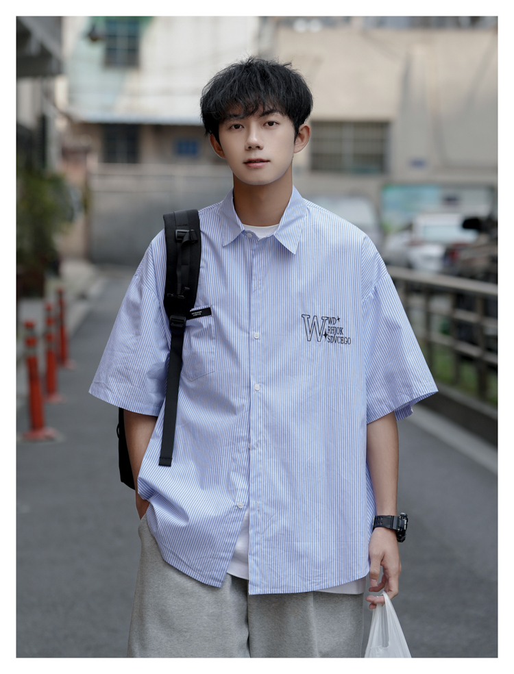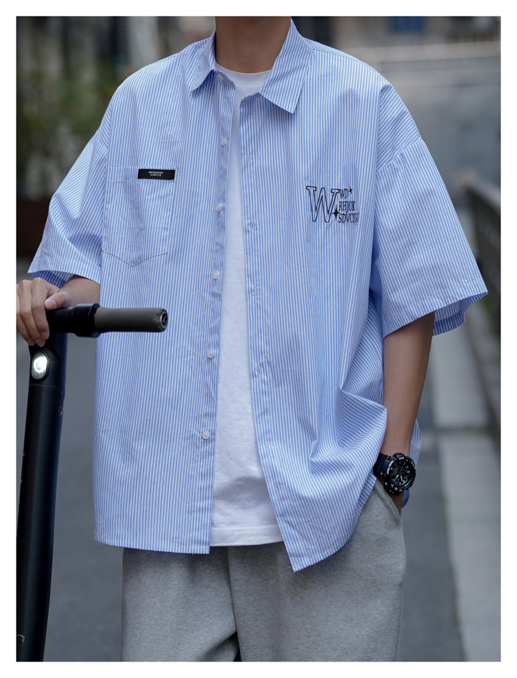 藍白條紋短袖襯衫男夏季薄款疊穿刺繡襯衫外套cityboy少年感上衣