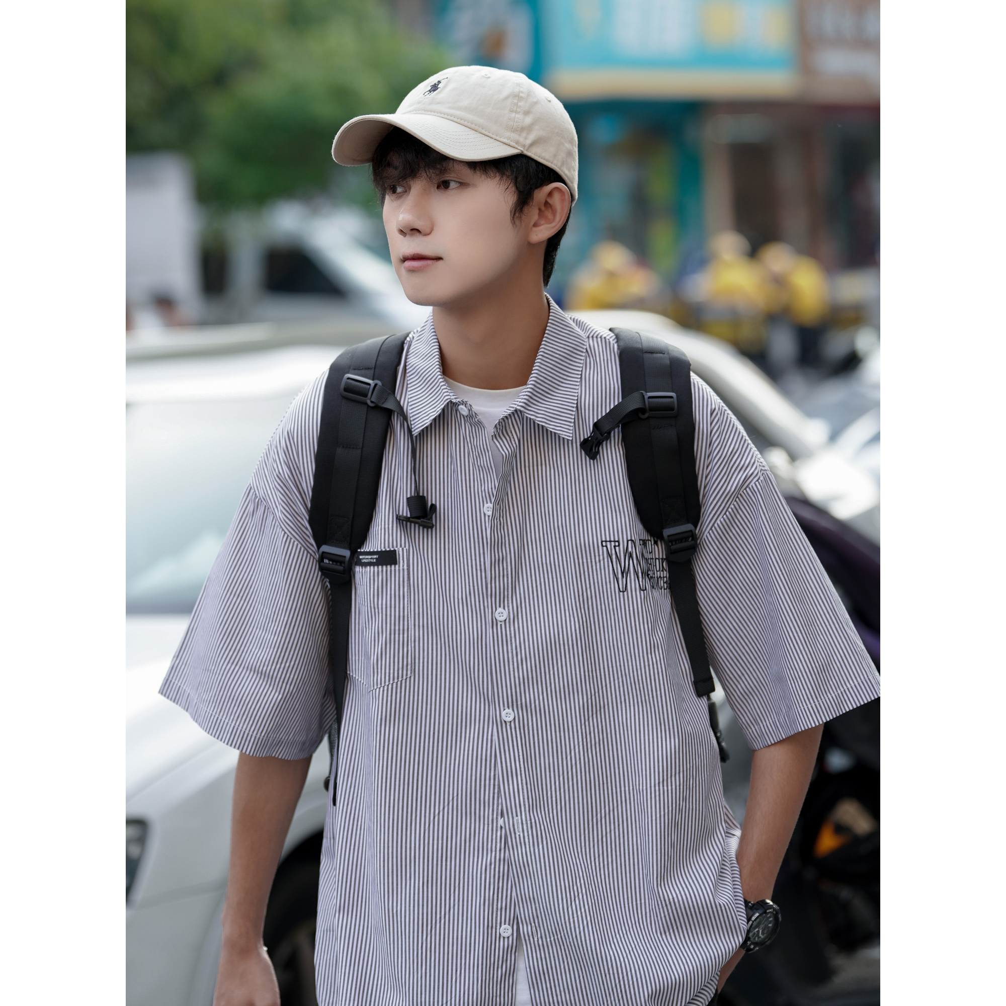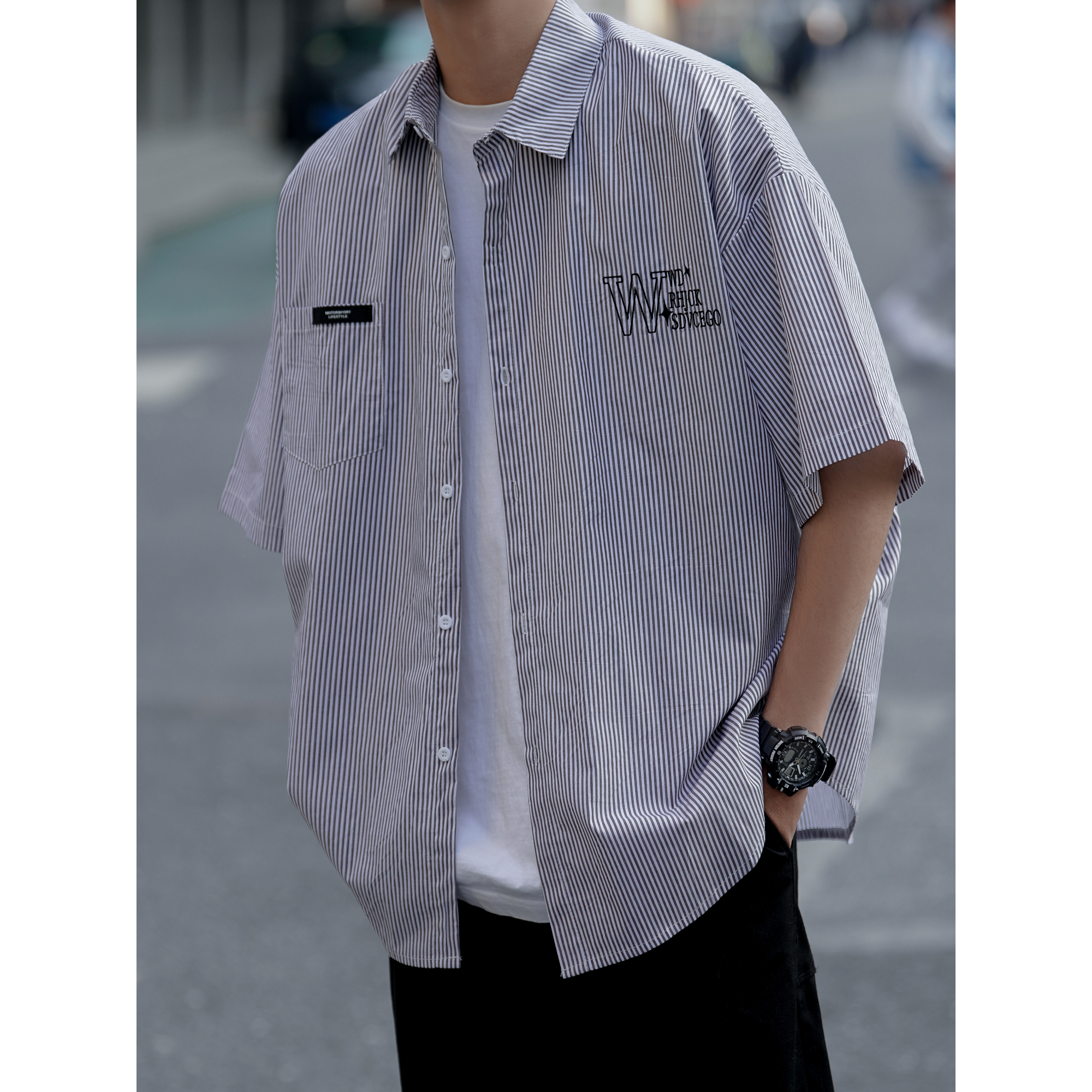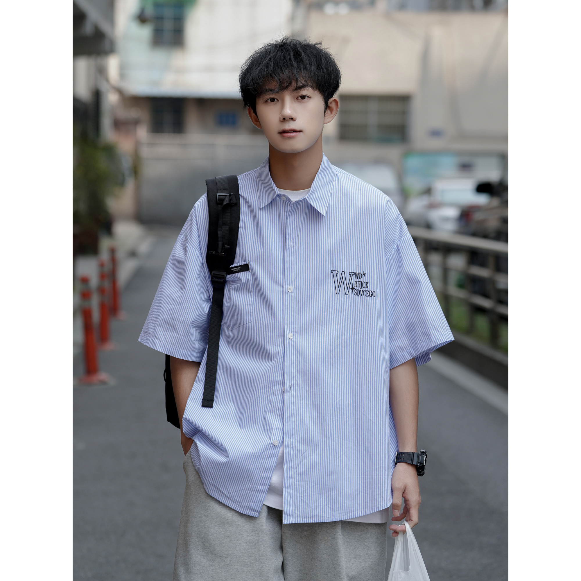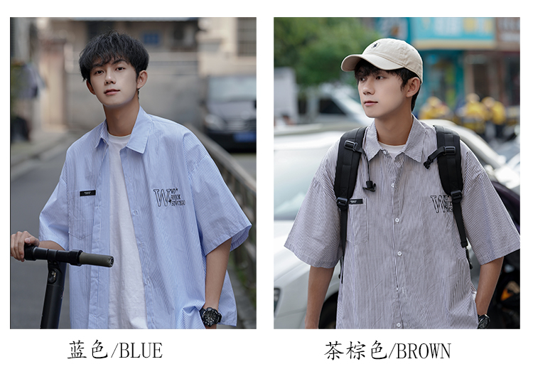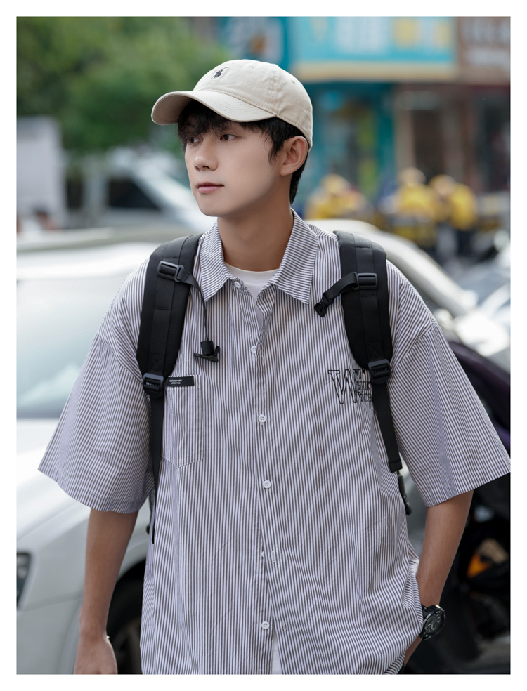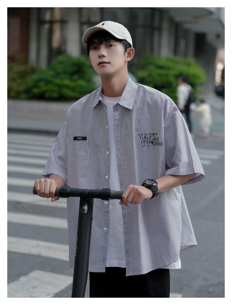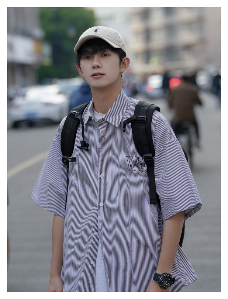 藍白條紋短袖襯衫男夏季薄款疊穿刺繡襯衫外套cityboy少年感上衣