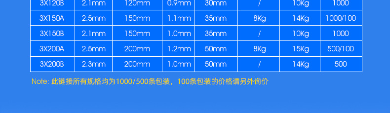 颜色 4x200非标 2.8宽 100条,3x80国标 2.5宽 1000条,3x100国标 2.5宽 1000条,3x100非标 2.1宽 1000条,3x120国标 2.5宽 1000条,3x120非标 2.1宽 1000条,3x150国标 2.5宽 1000条,3x150非标 2.1宽 1000条,3x200国标 2.5宽 500条,3x200非标 2.3宽 500条,3x250国标 2.7宽 250条,3x300国标 2.7宽 250条