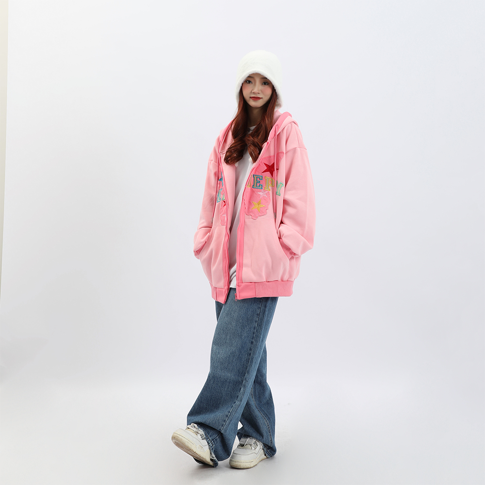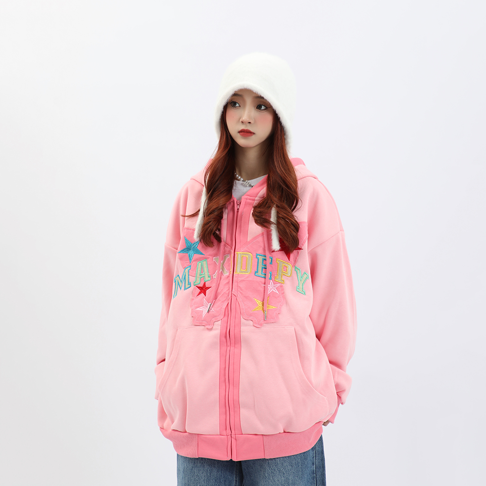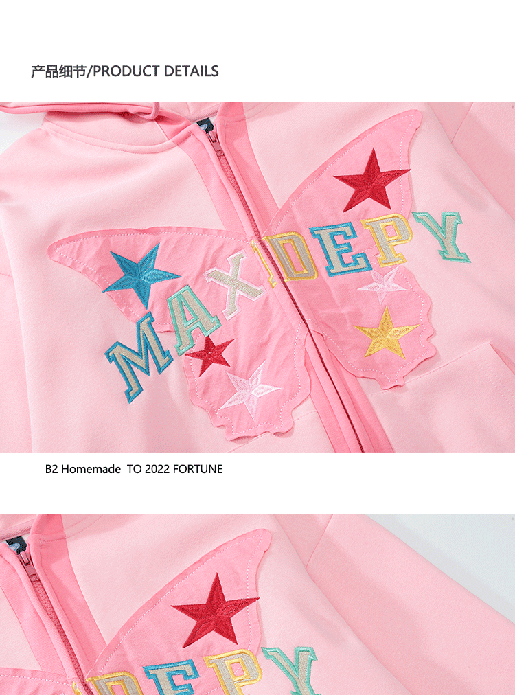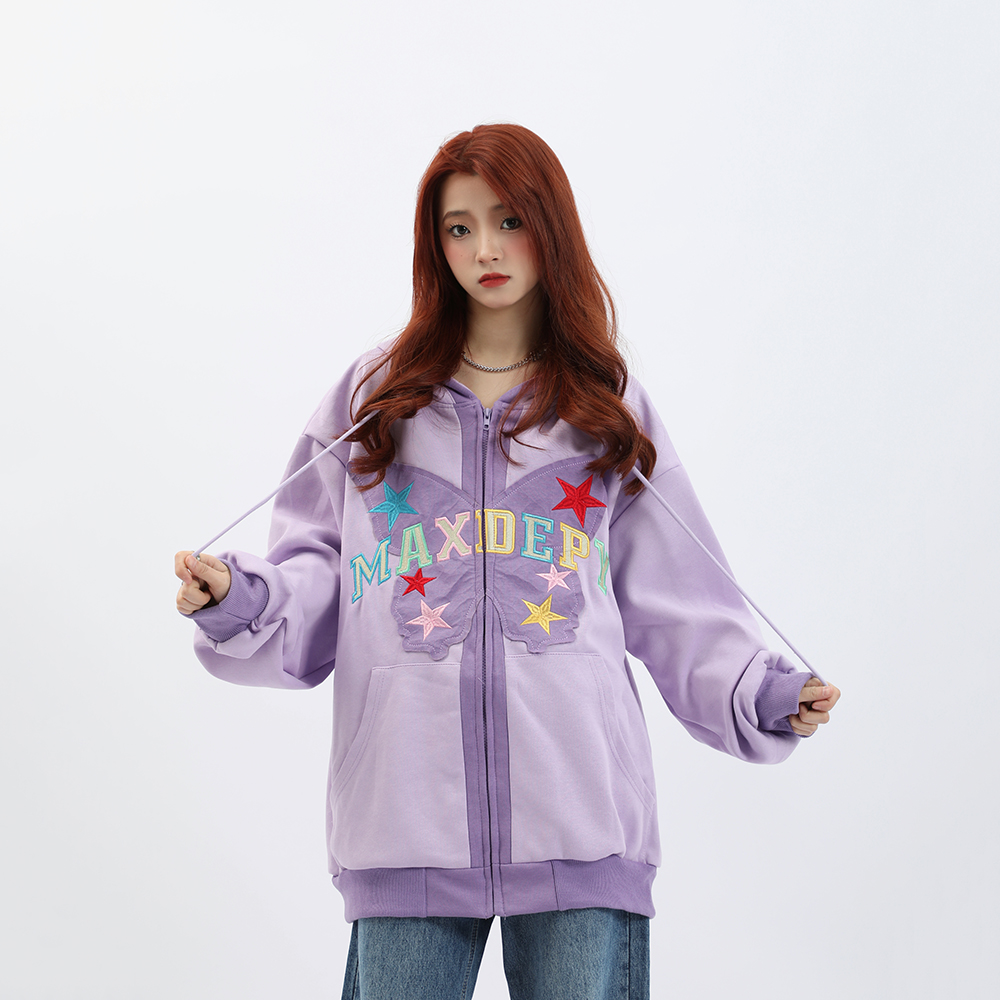 b2自制美式復古字母蝴蝶多巴胺紫連帽運動衫女春秋甜酷粉色辣妹外套