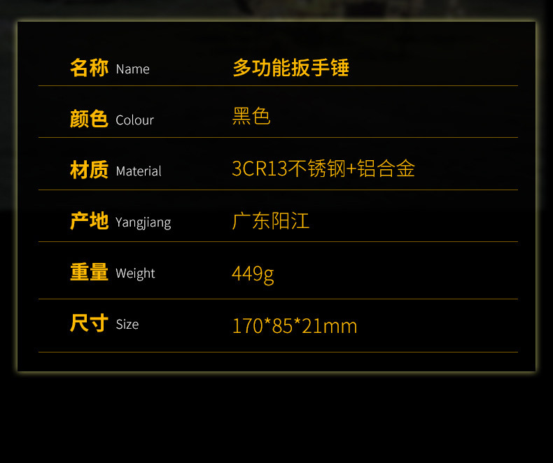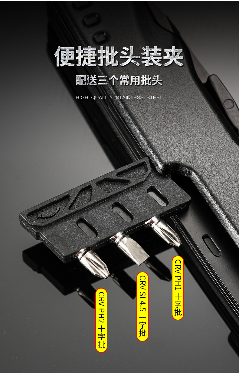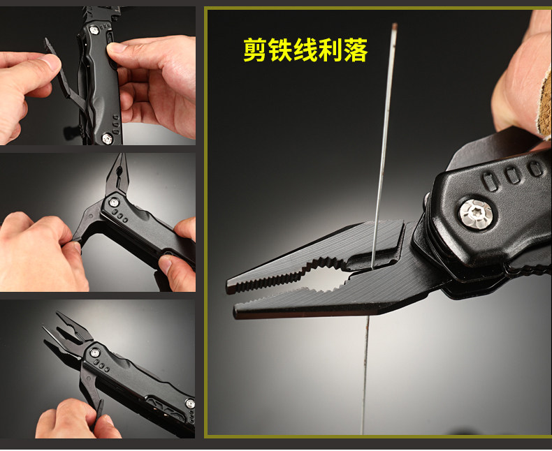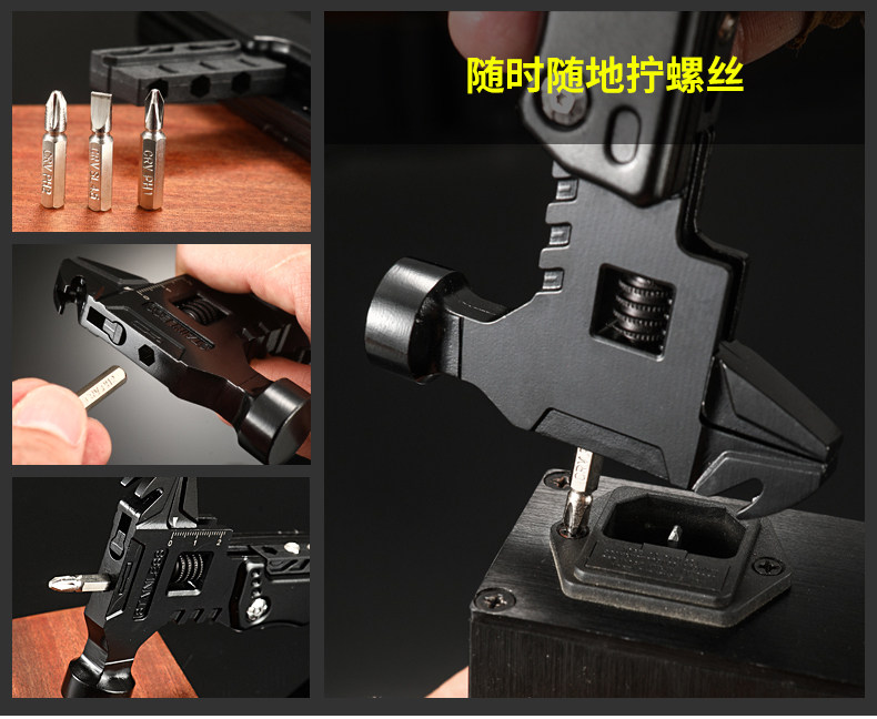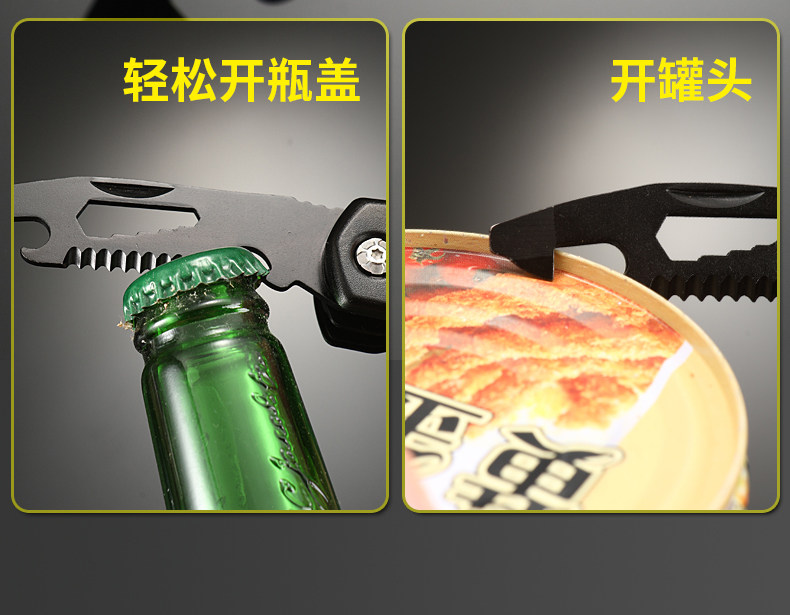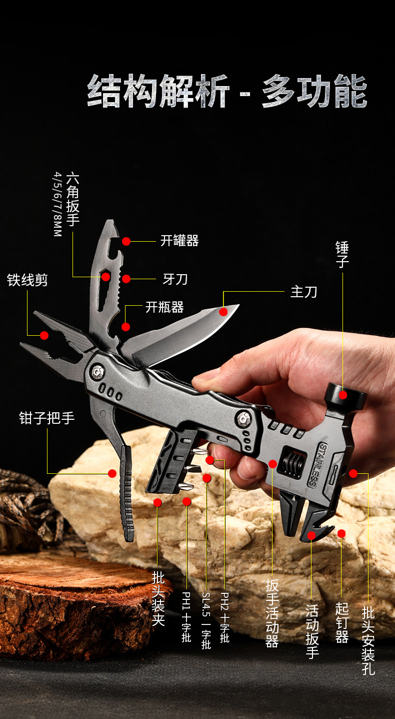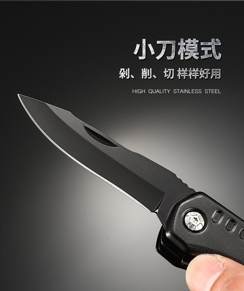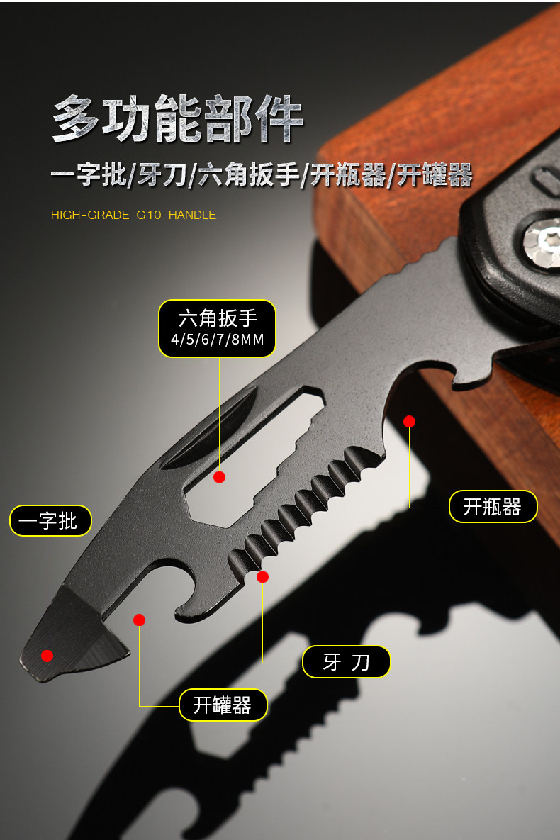附加功能 多用途鉤,開瓶器,指甲銼,去鱗器,木鋸,尺子,刀,鉗子,螺絲刀,比例尺,開罐器,錘,刺