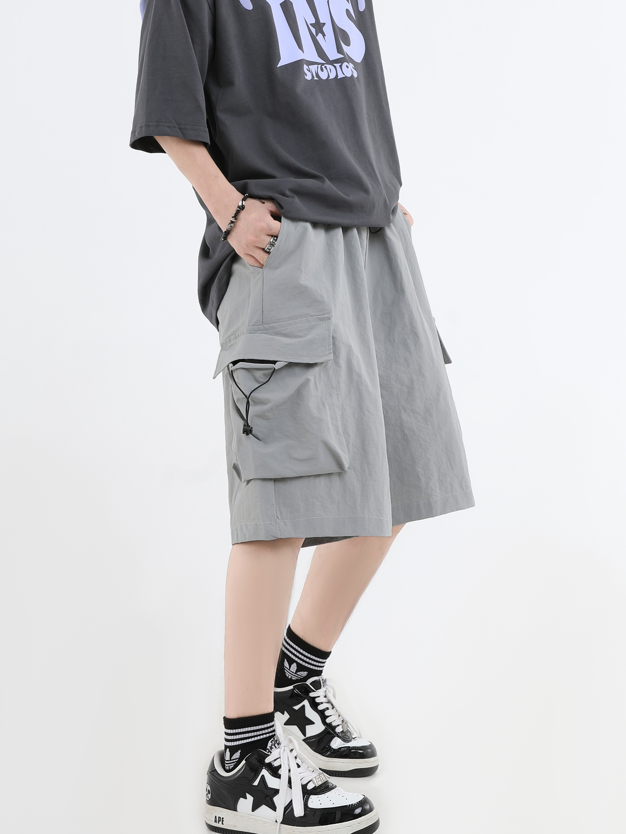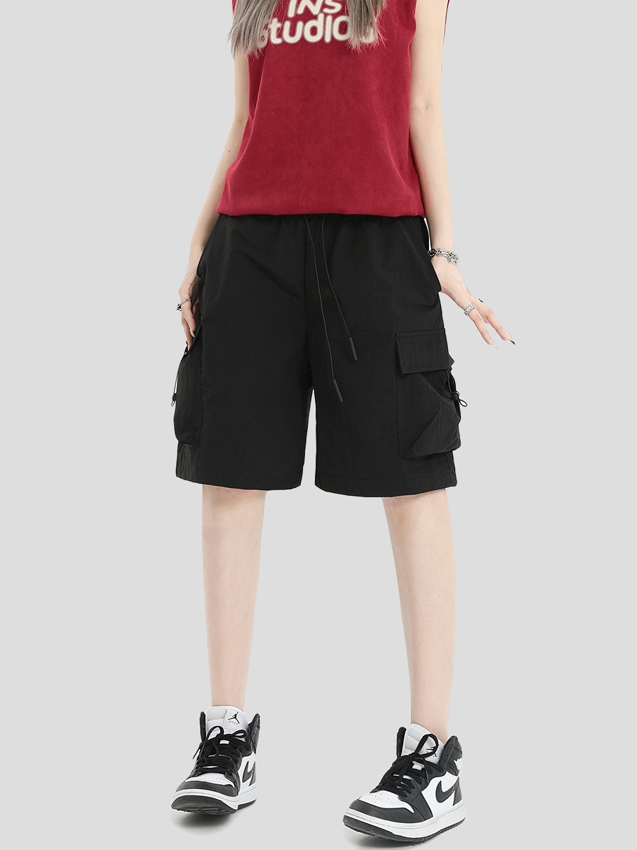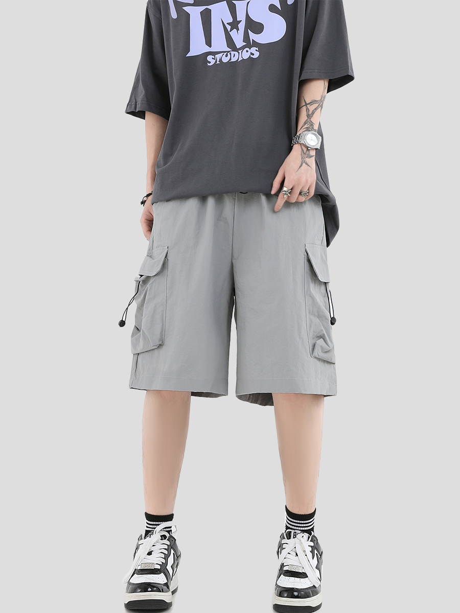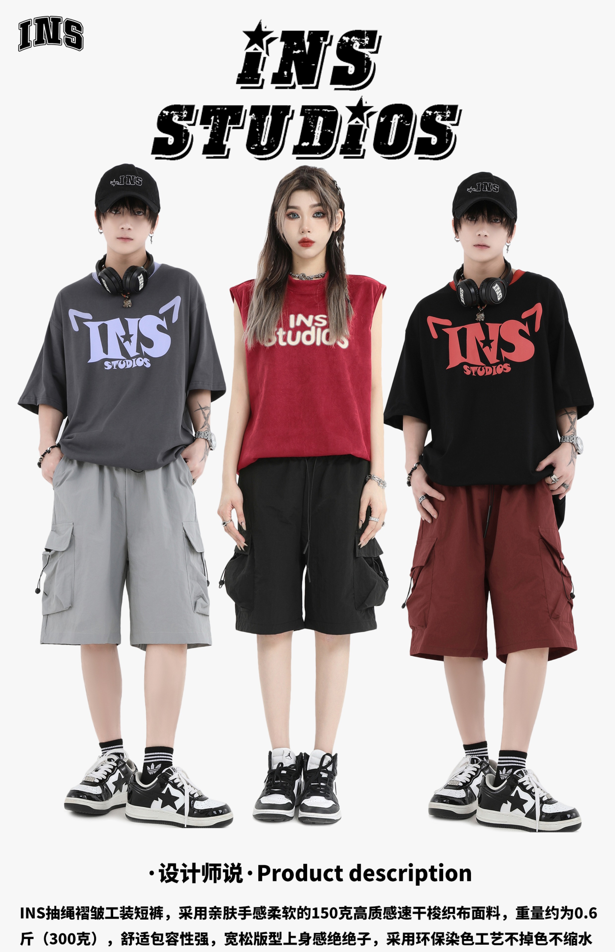 INSstudios 國潮牌情侶美式抽繩褶皺工裝短褲寬鬆直筒休閒五分褲
