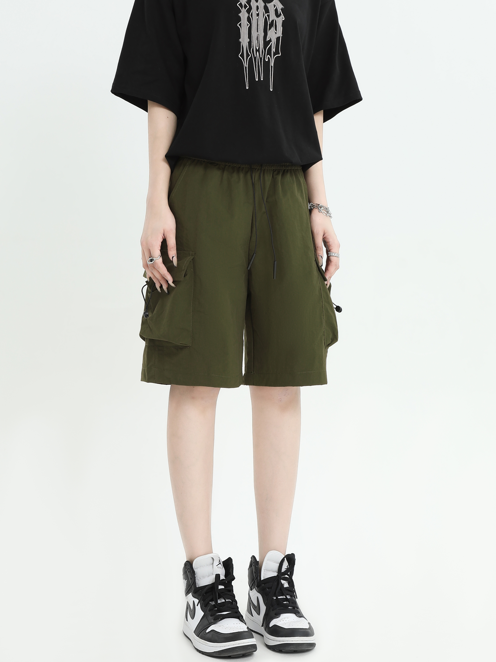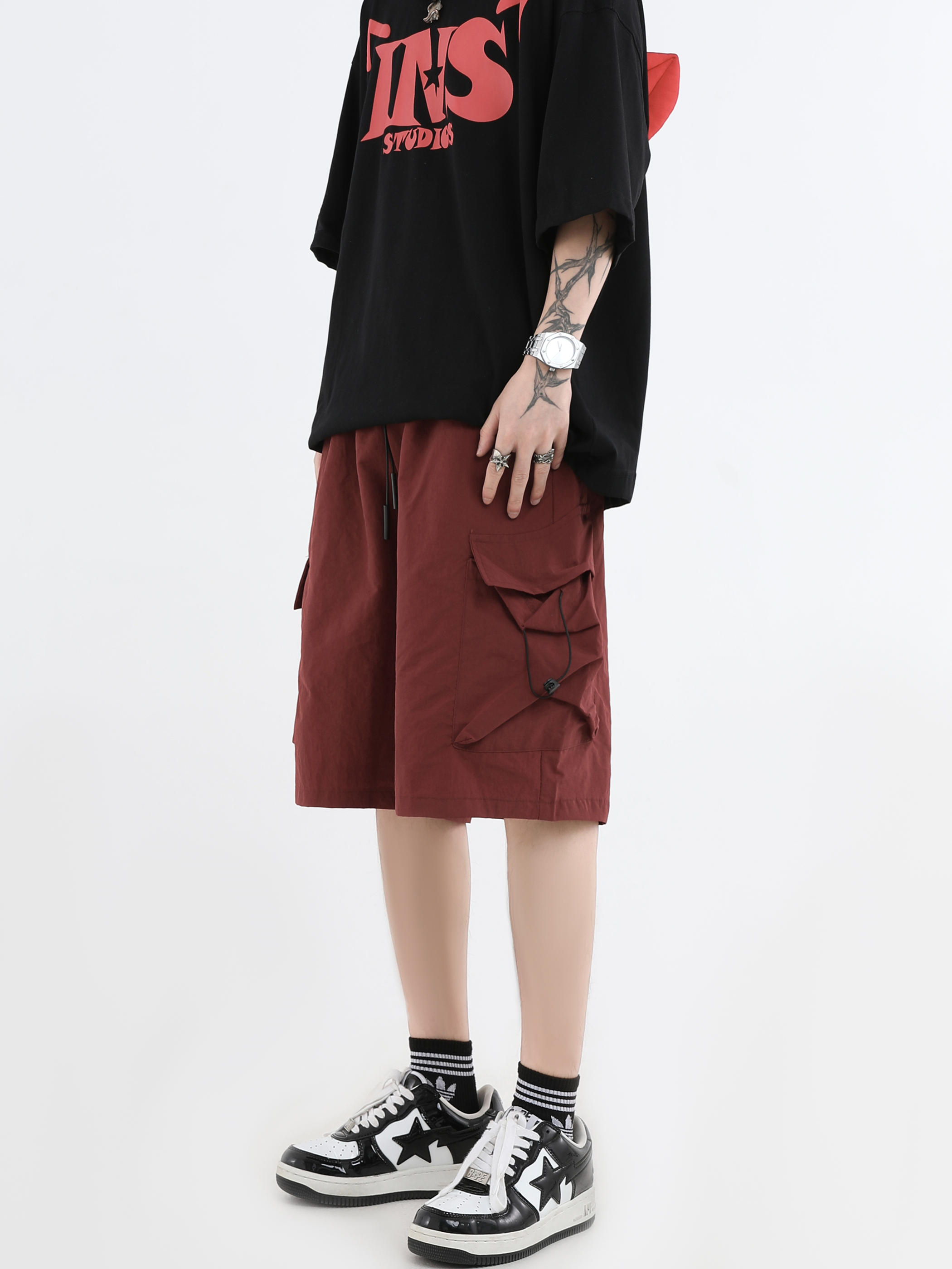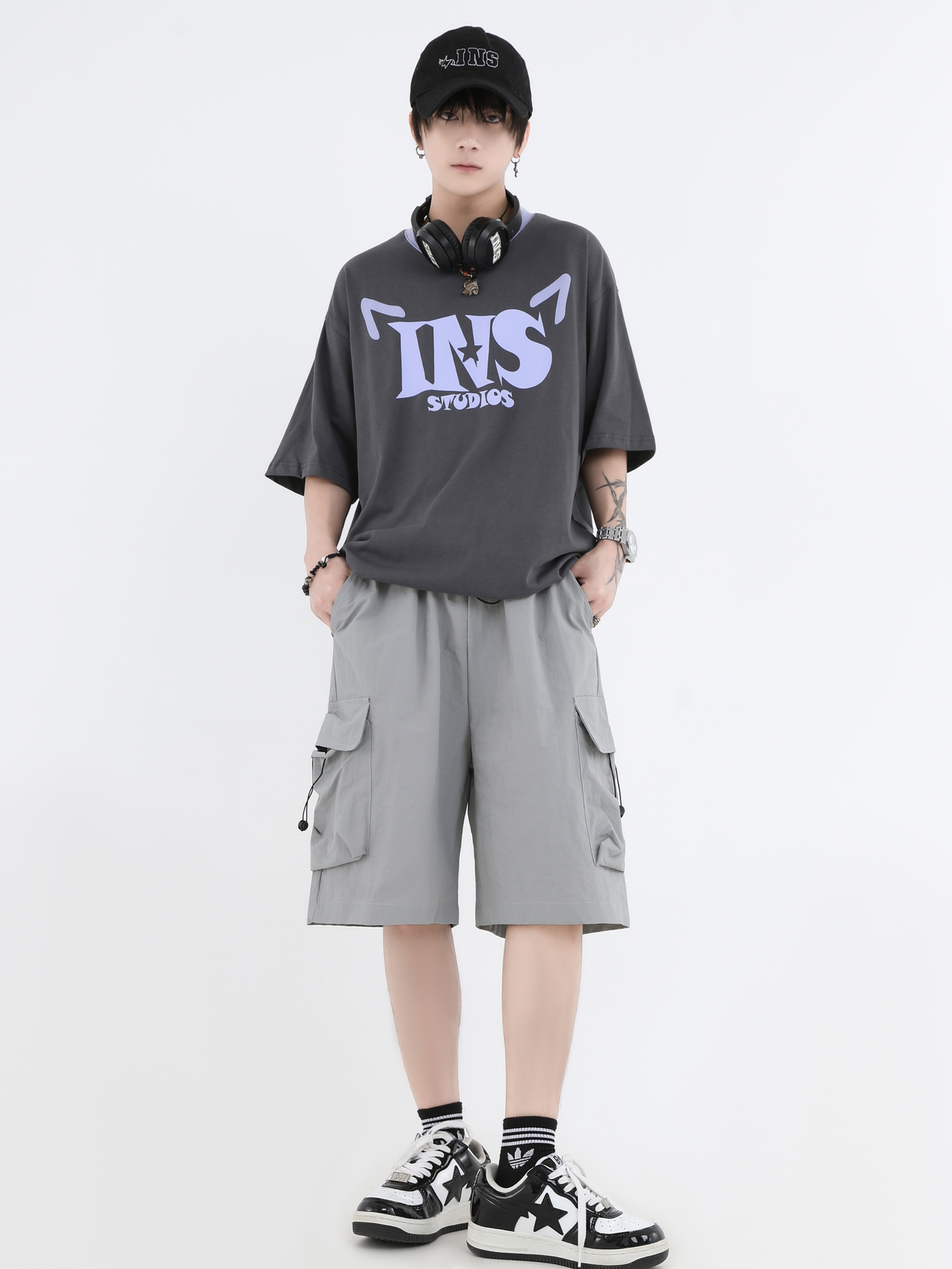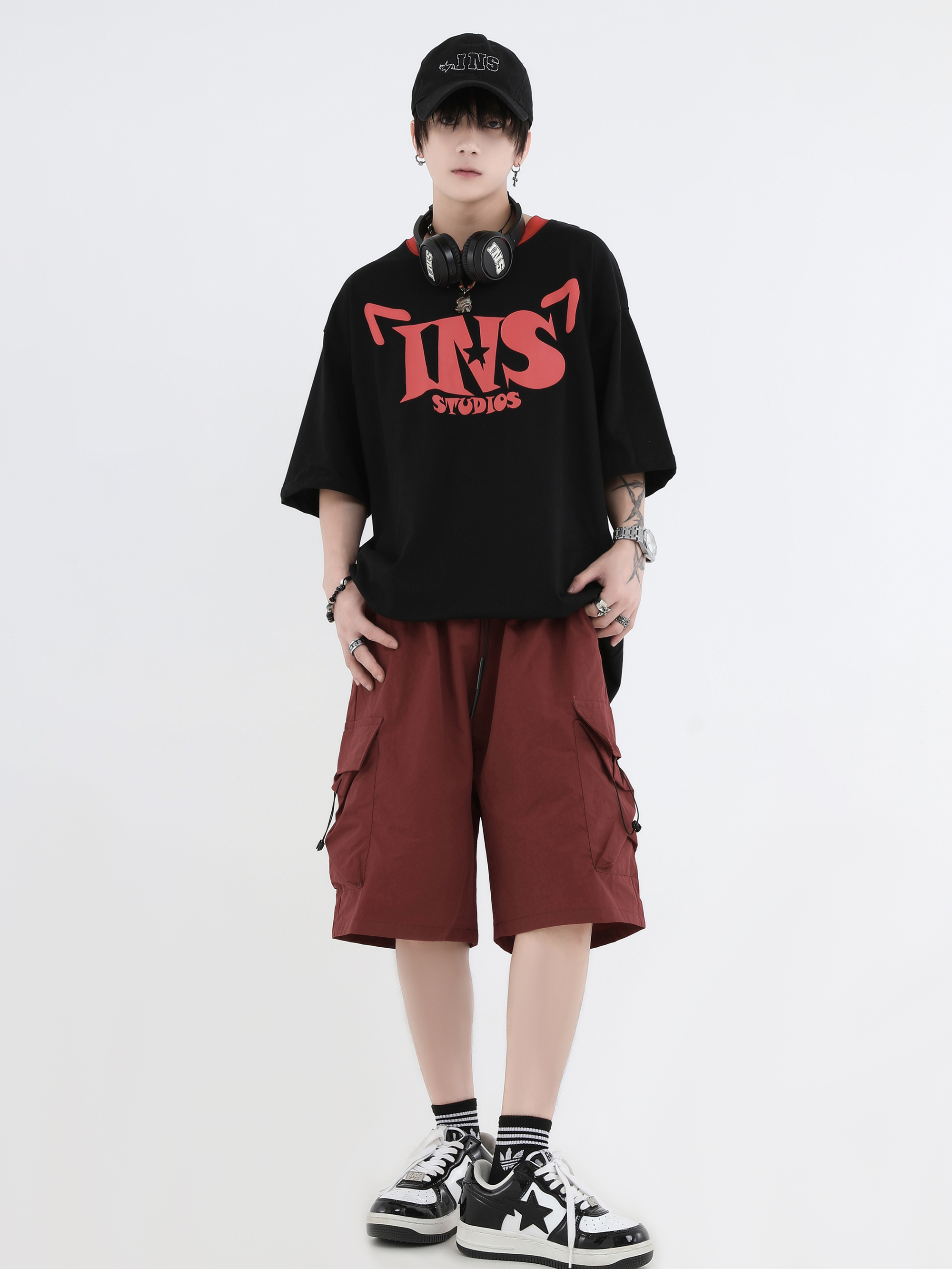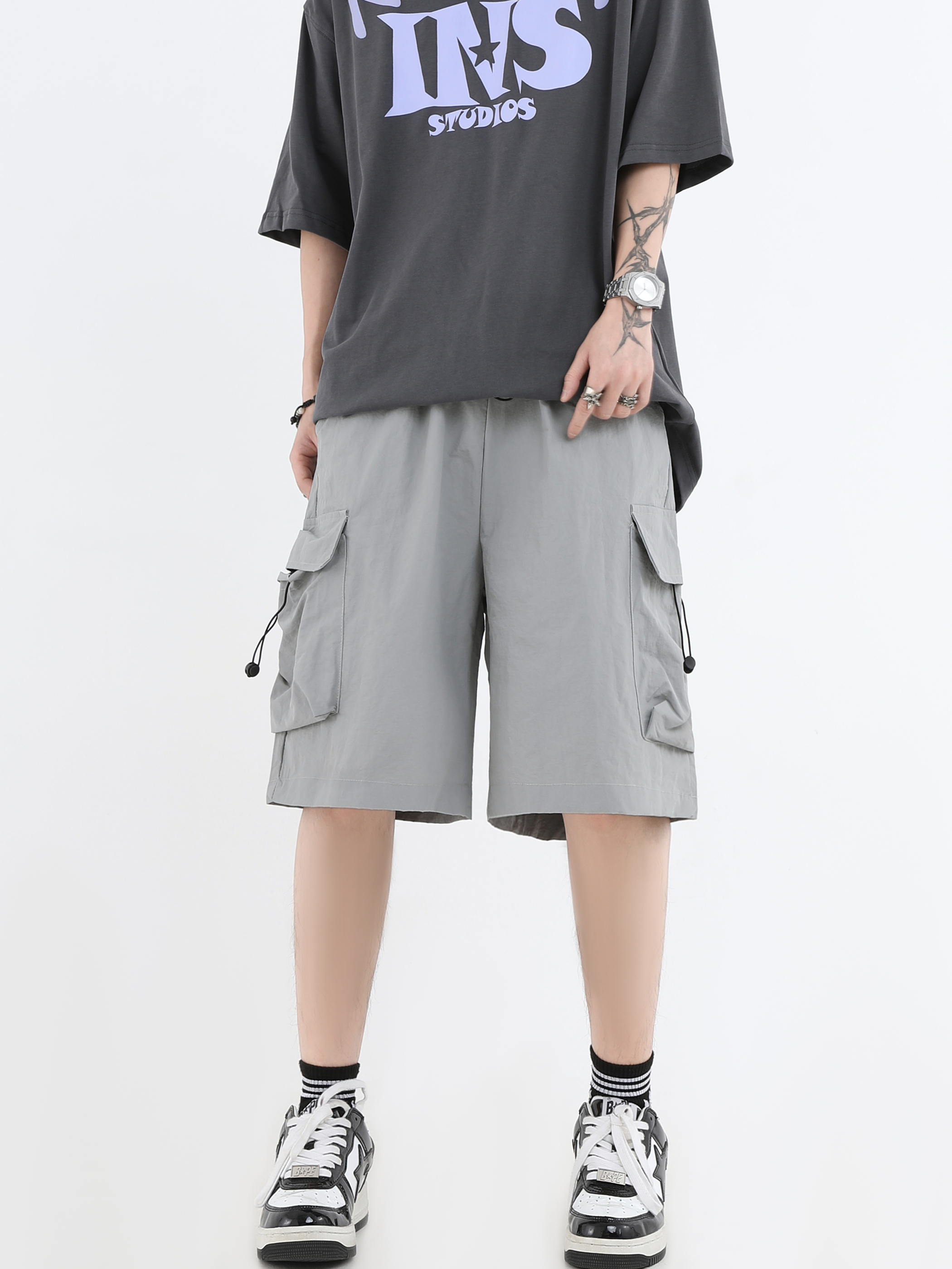 INSstudios 國潮牌情侶美式抽繩褶皺工裝短褲寬鬆直筒休閒五分褲