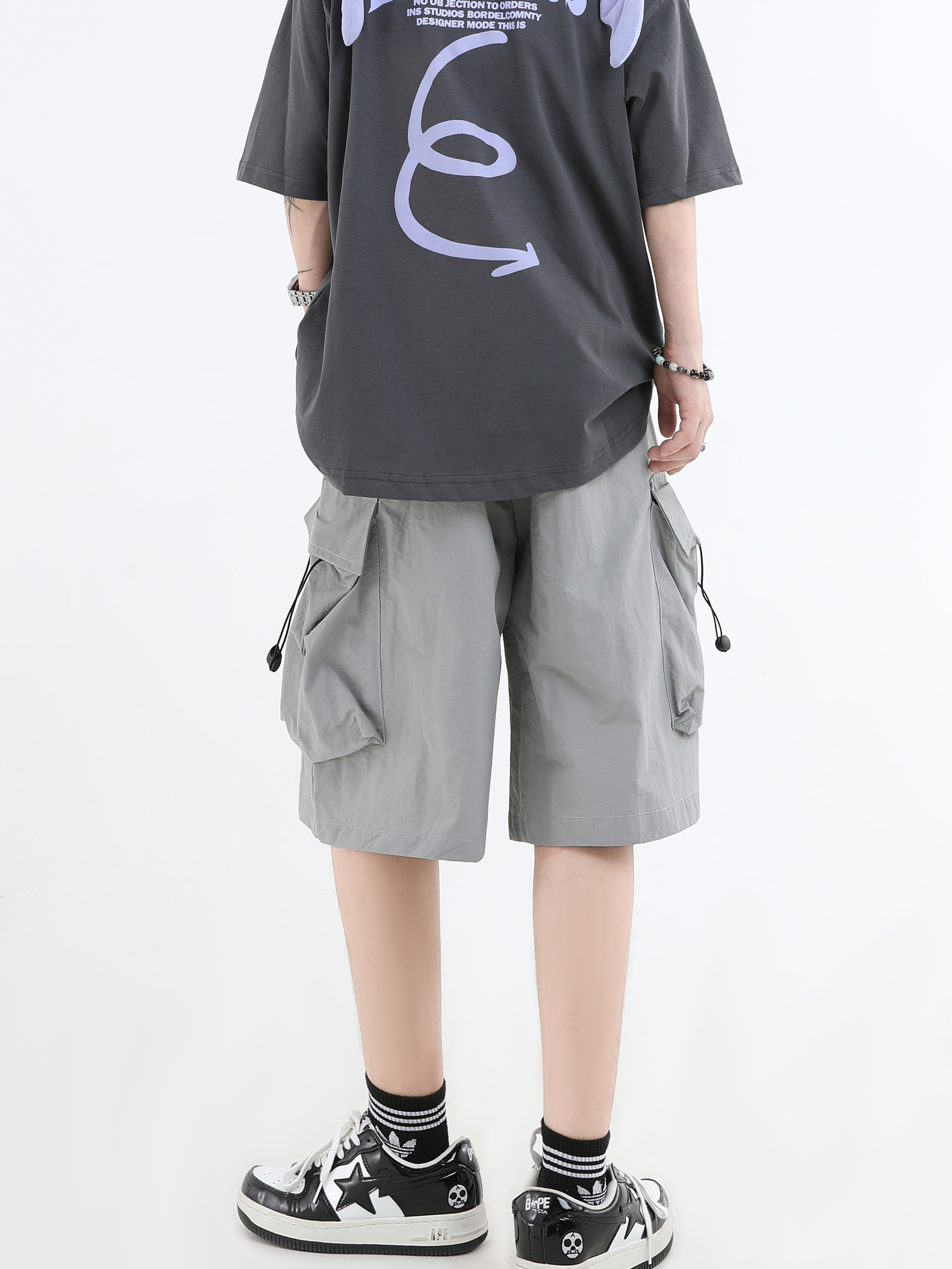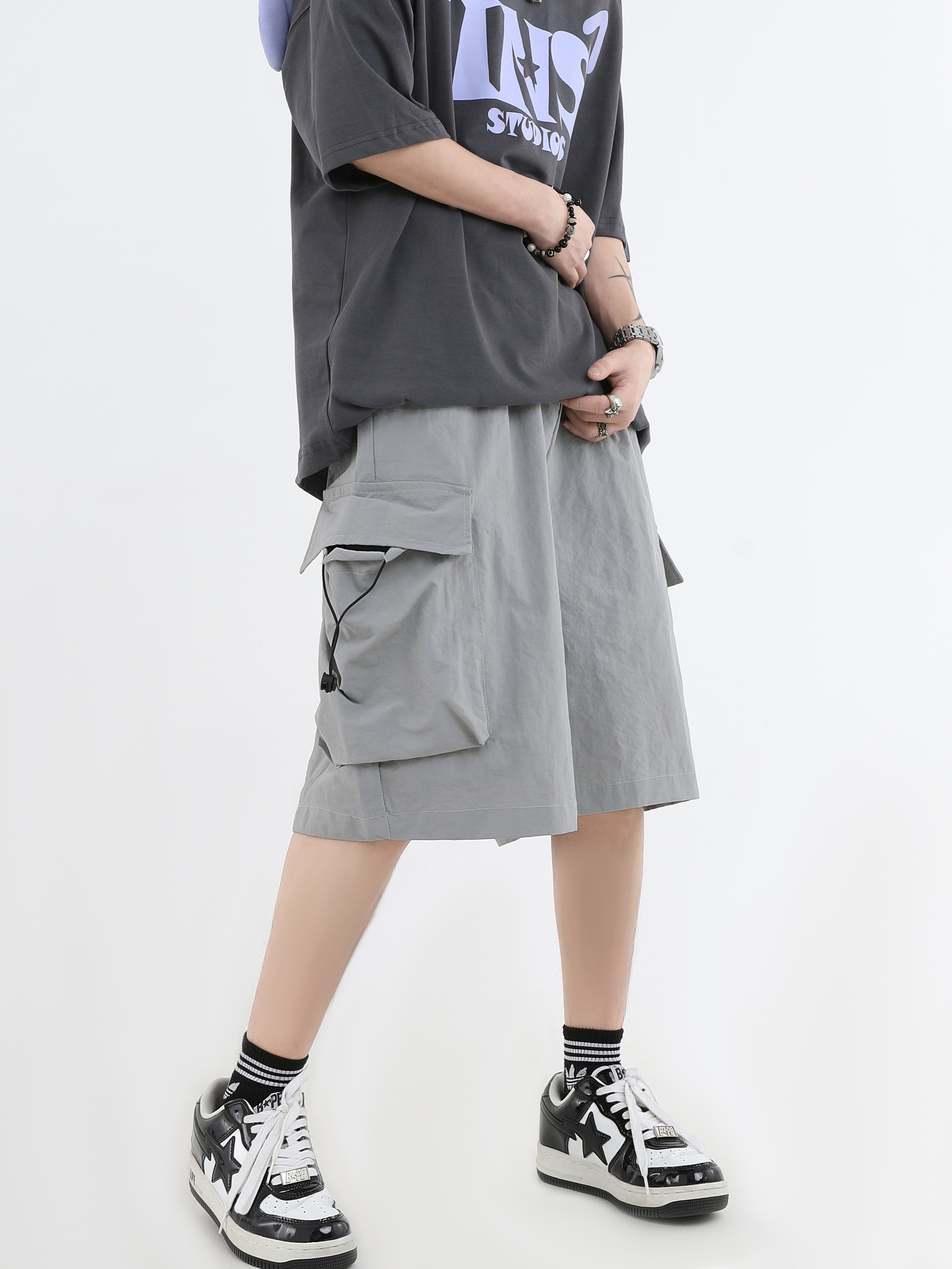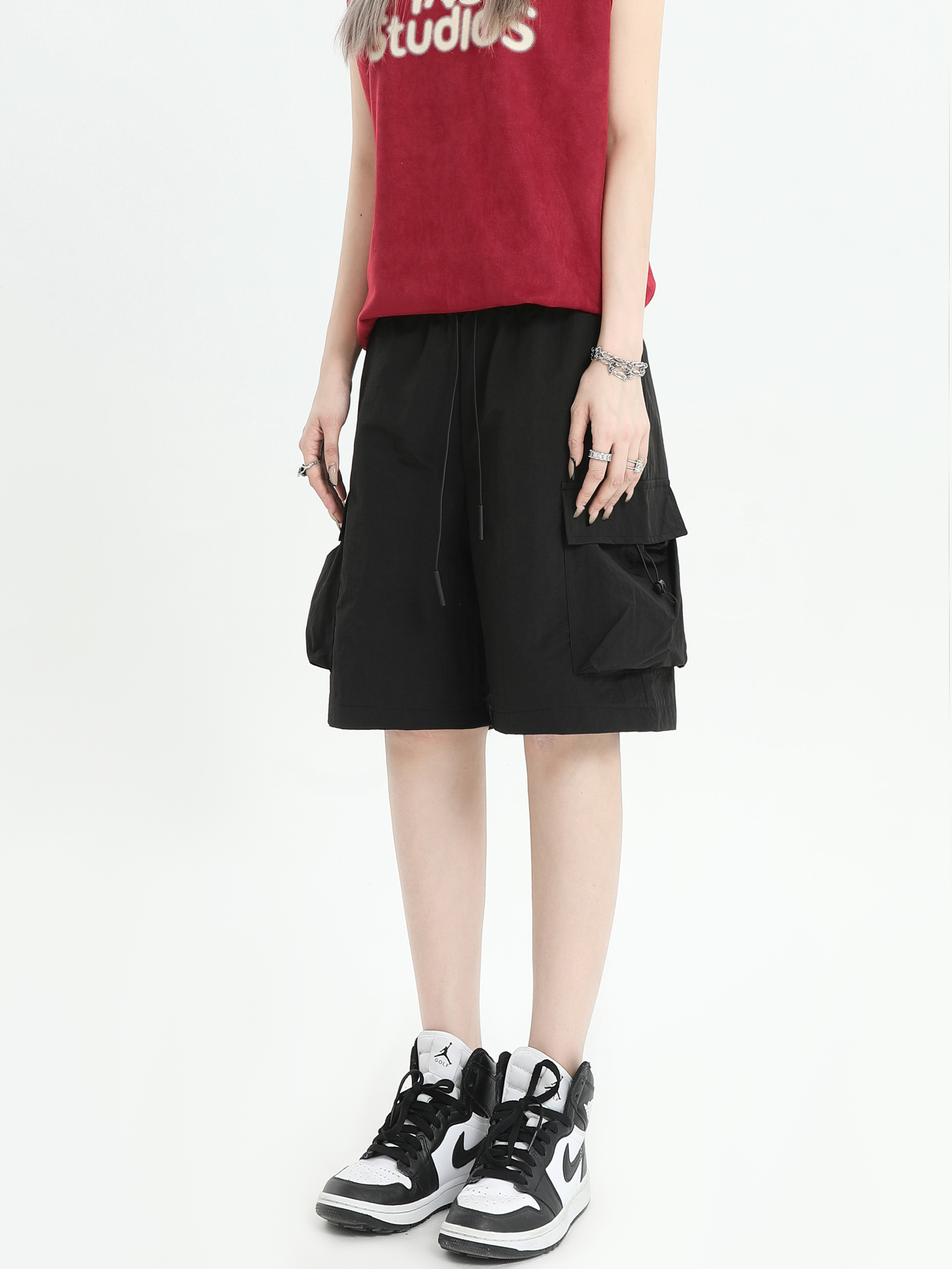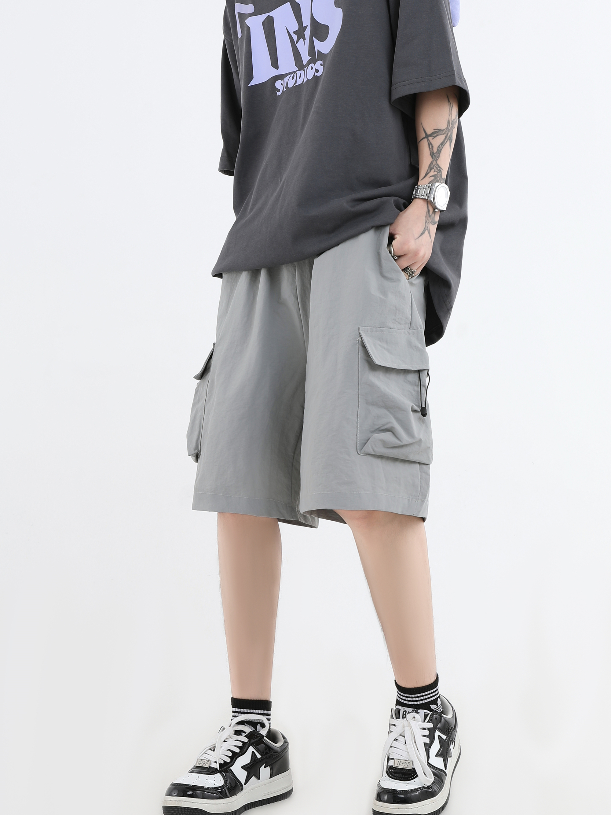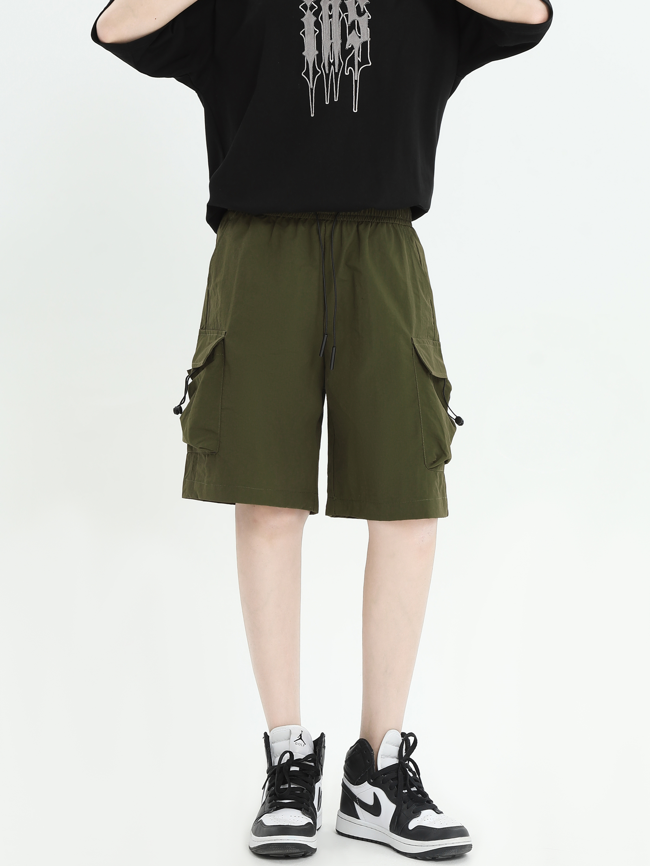 INSstudios 國潮牌情侶美式抽繩褶皺工裝短褲寬鬆直筒休閒五分褲