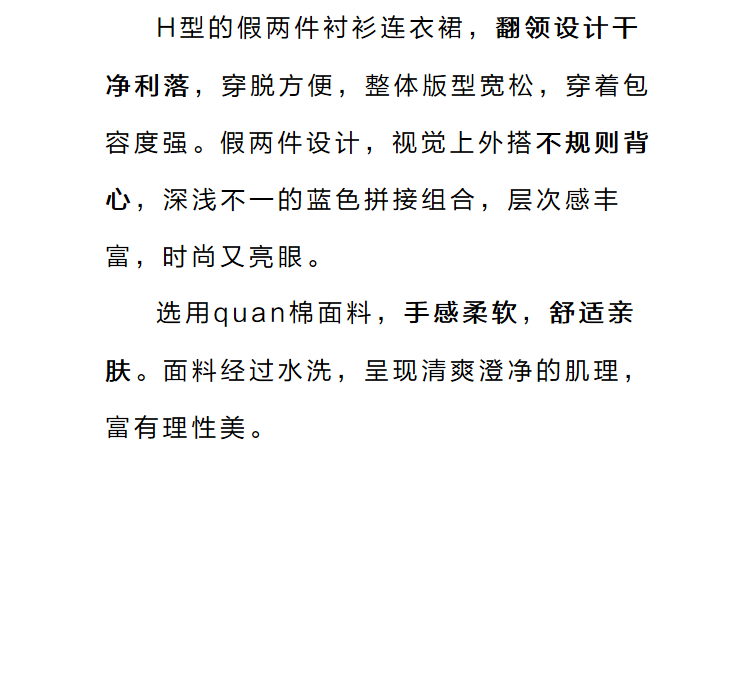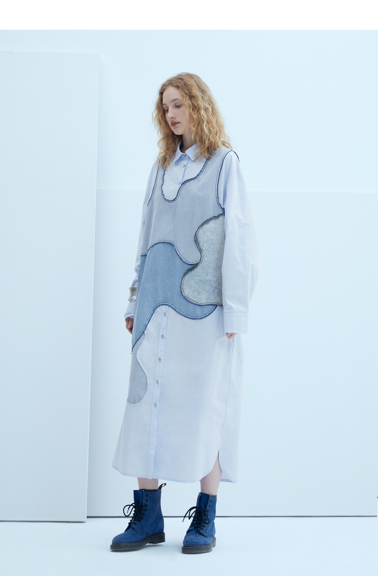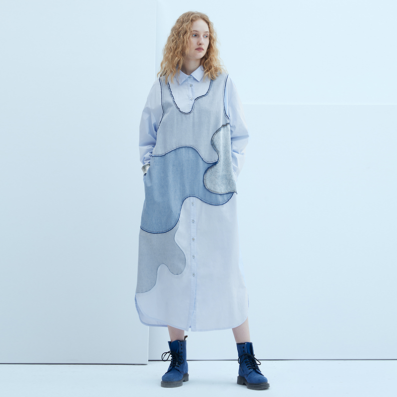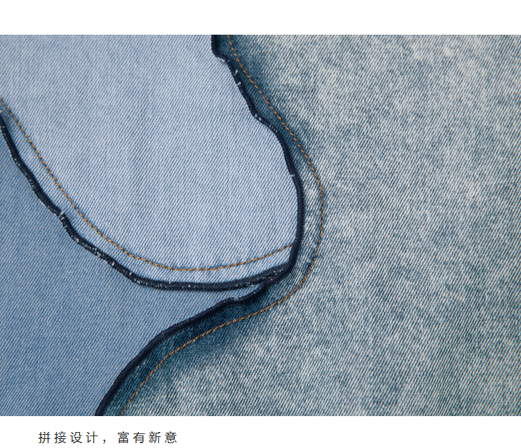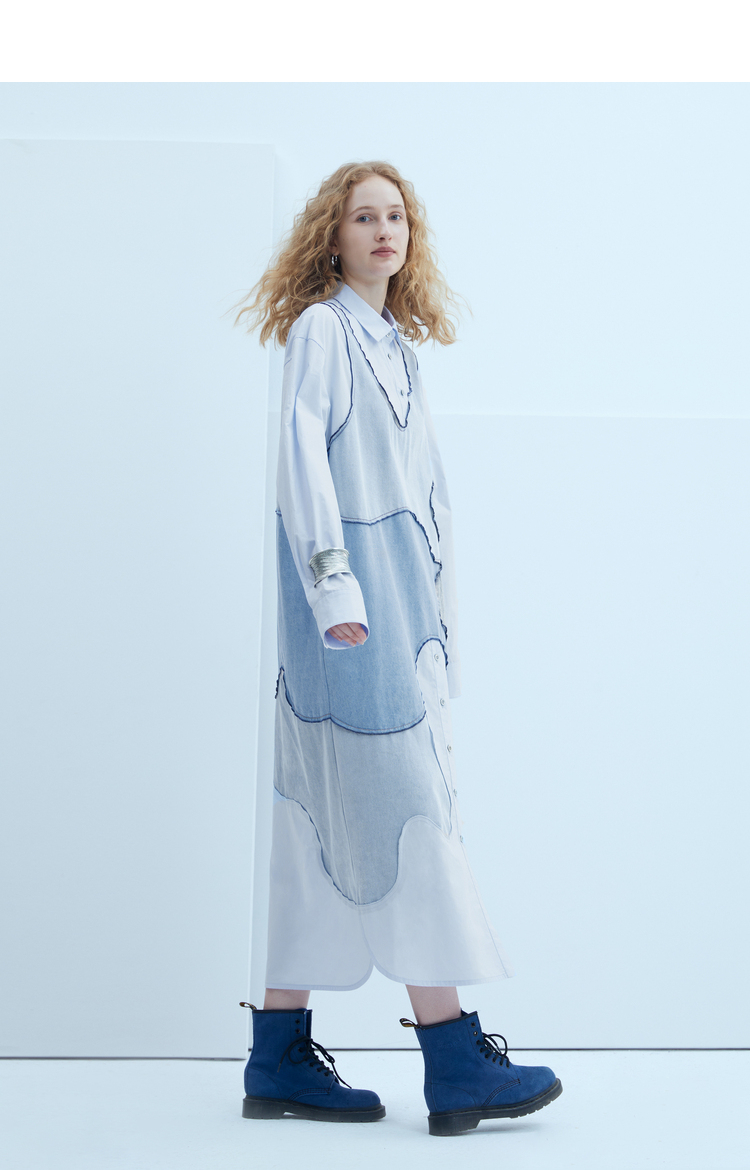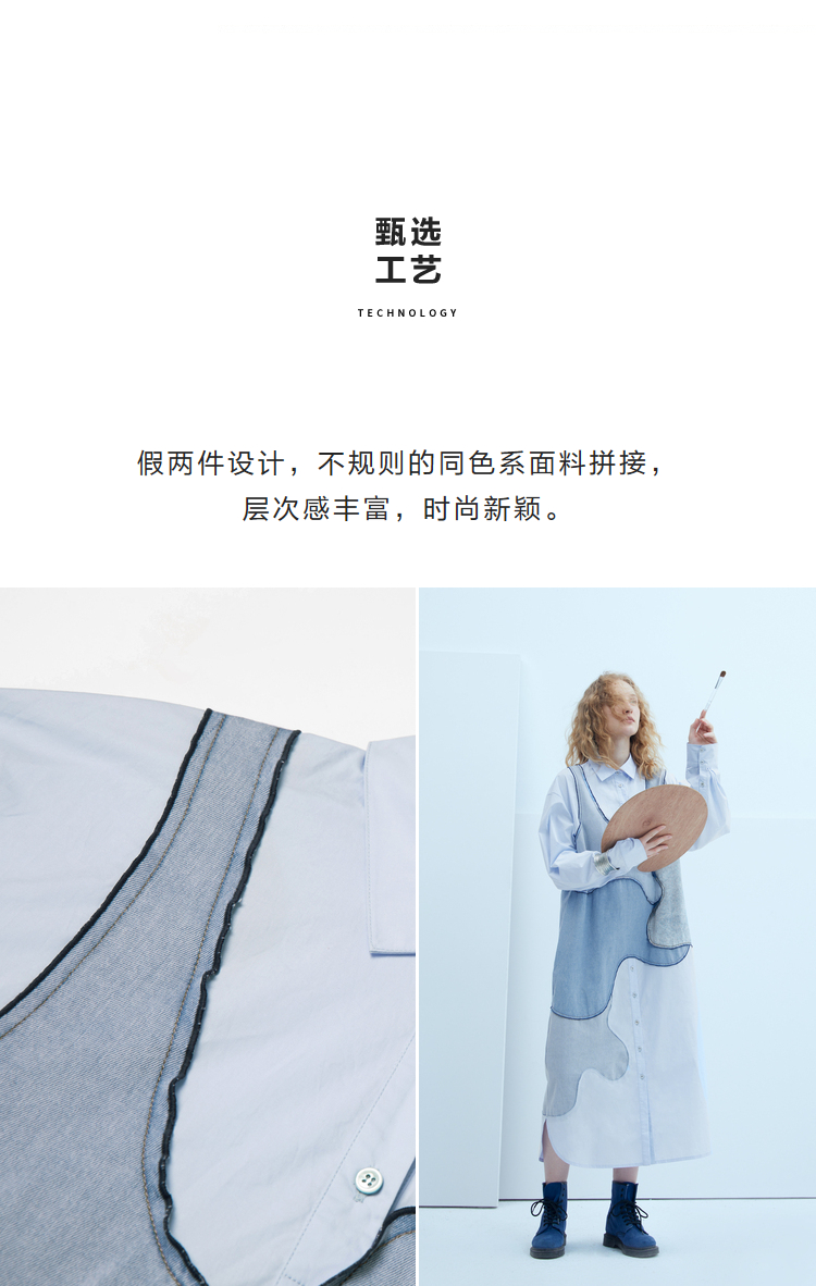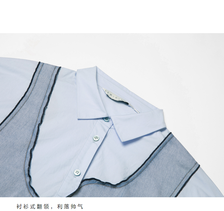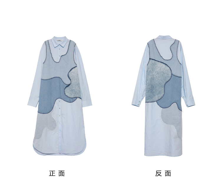牛仔拼接半圓原創設計2023春秋季新款假兩件洋裝H版型翻領設計
