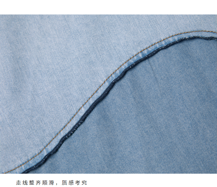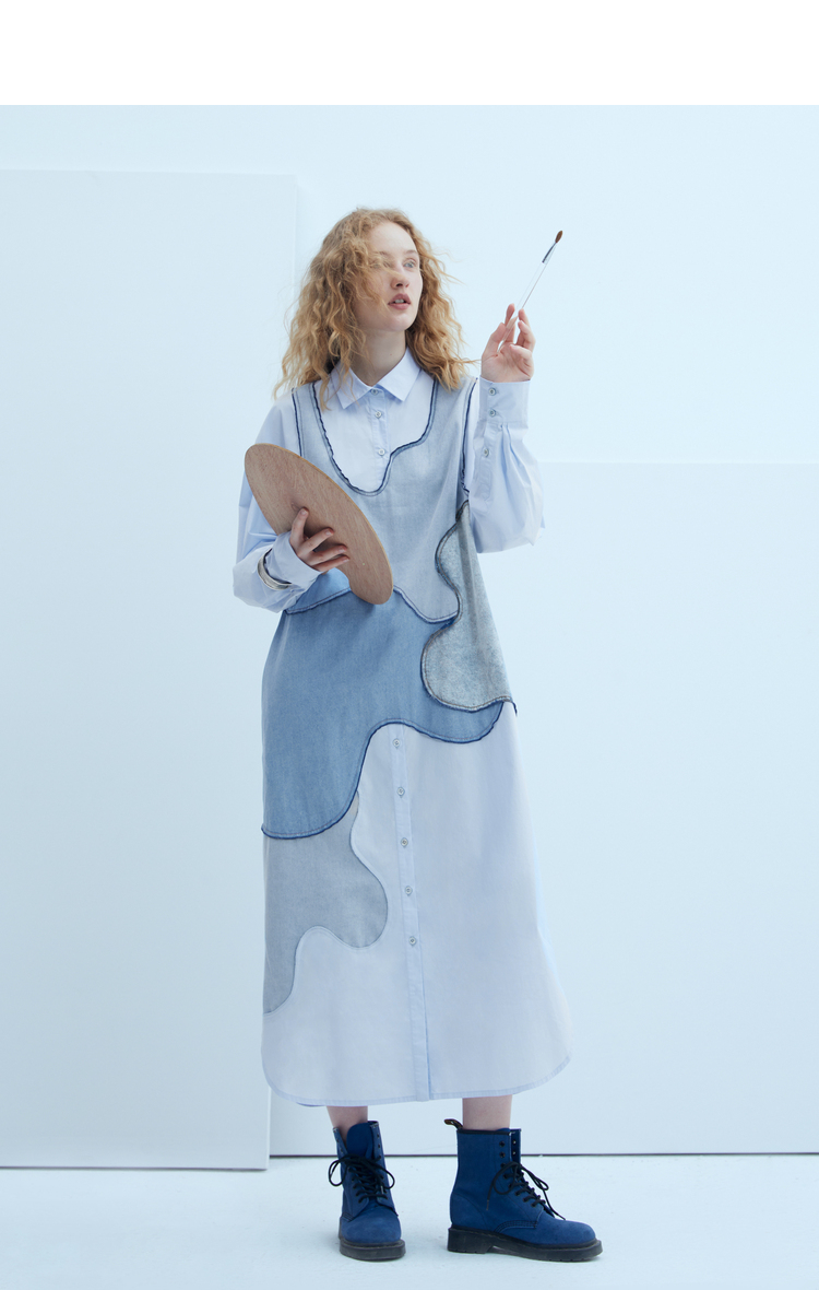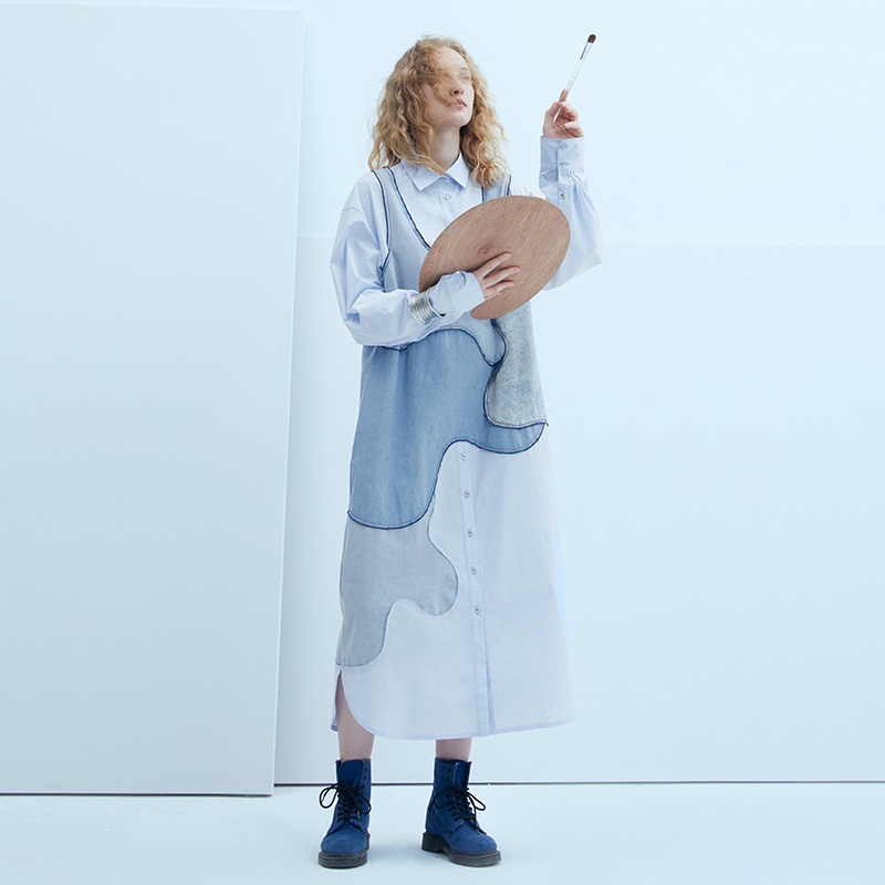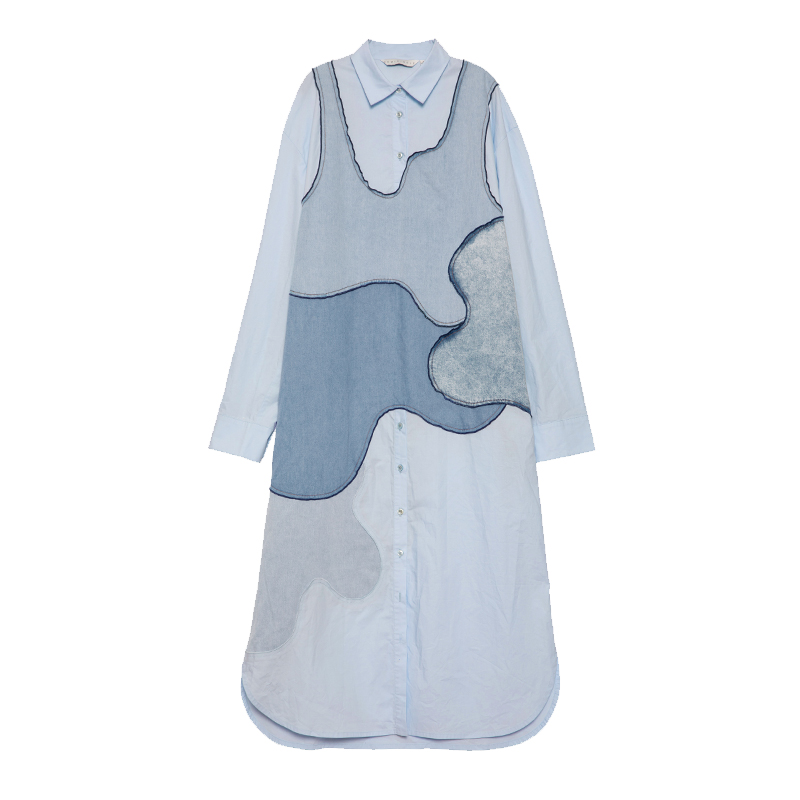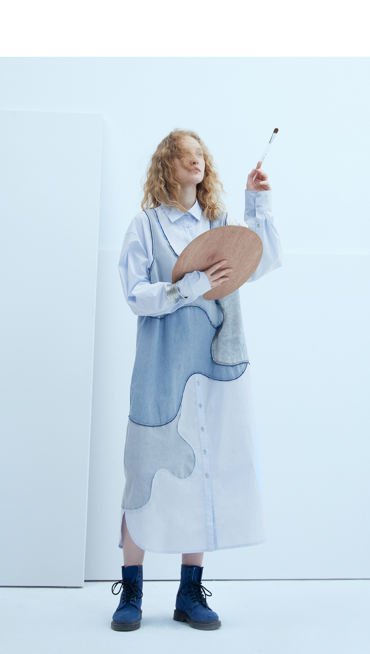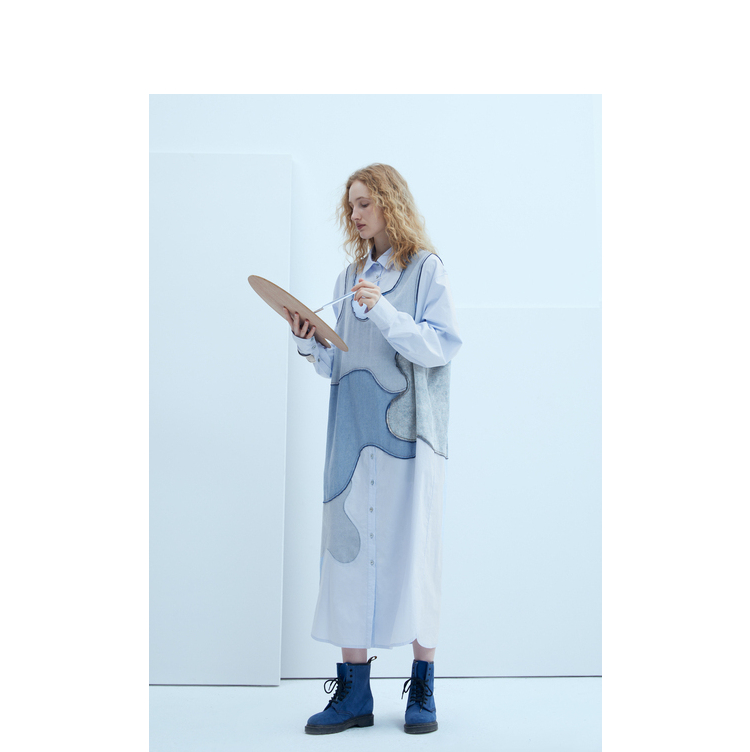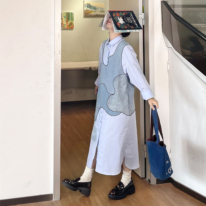 牛仔拼接半圓原創設計2023春秋季新款假兩件洋裝H版型翻領設計