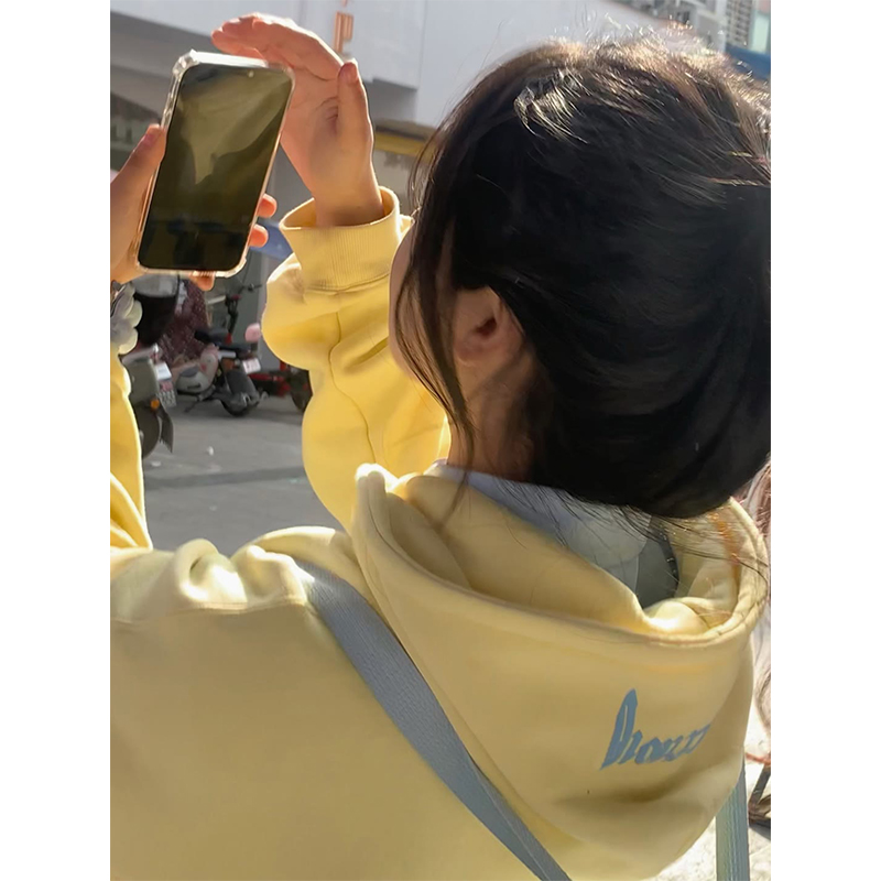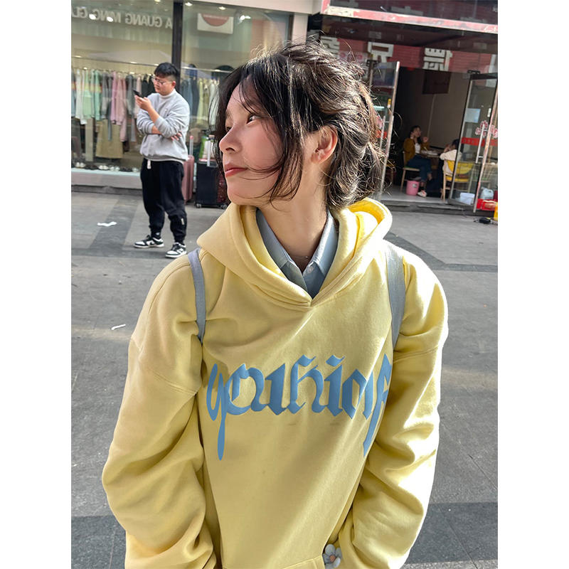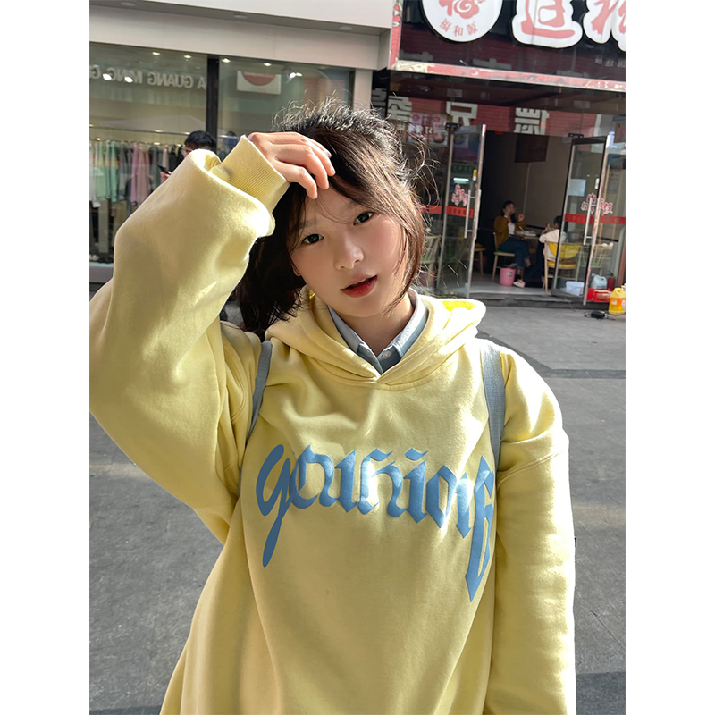 美式街頭甜酷風黃色連帽運動衫女春秋薄款情侶oversize潮牌帽衫外套