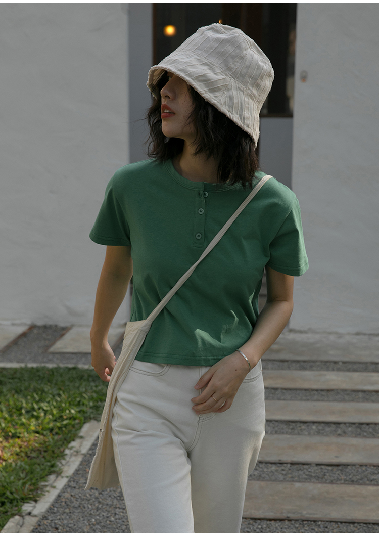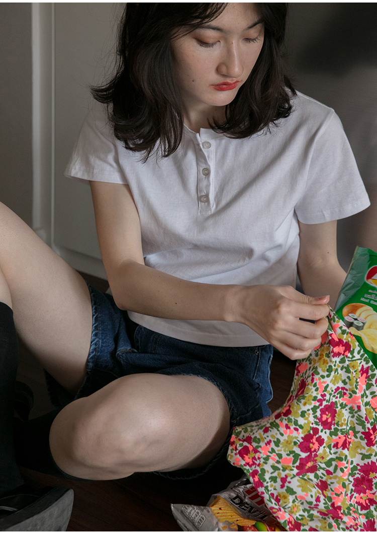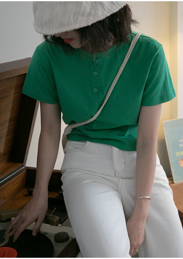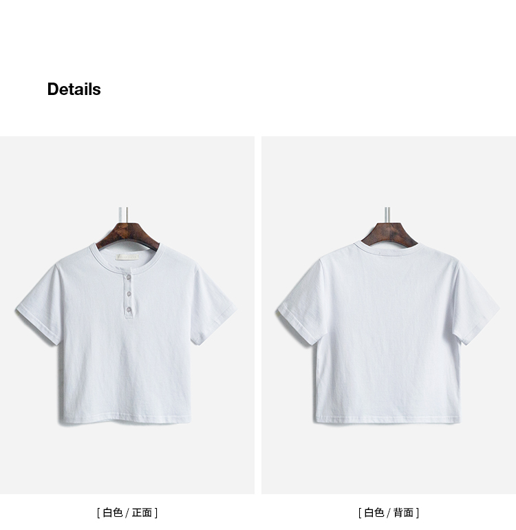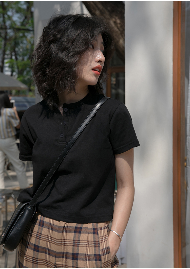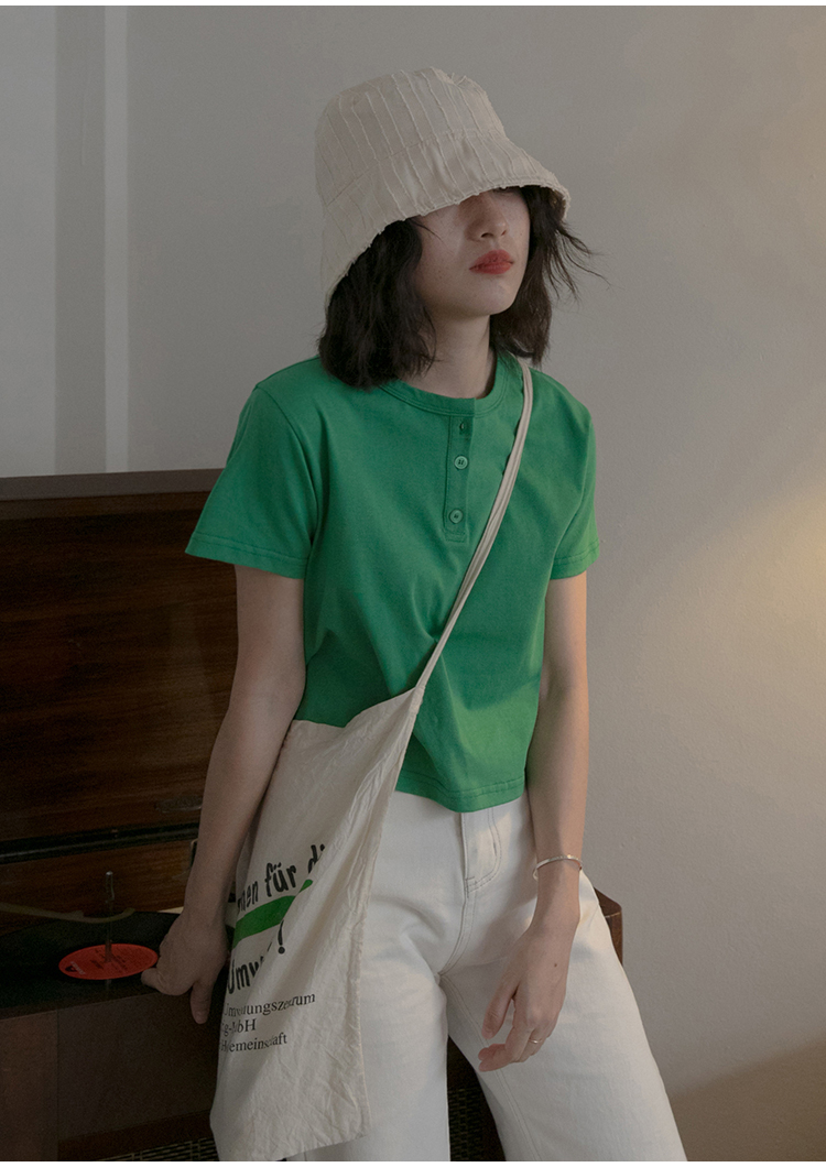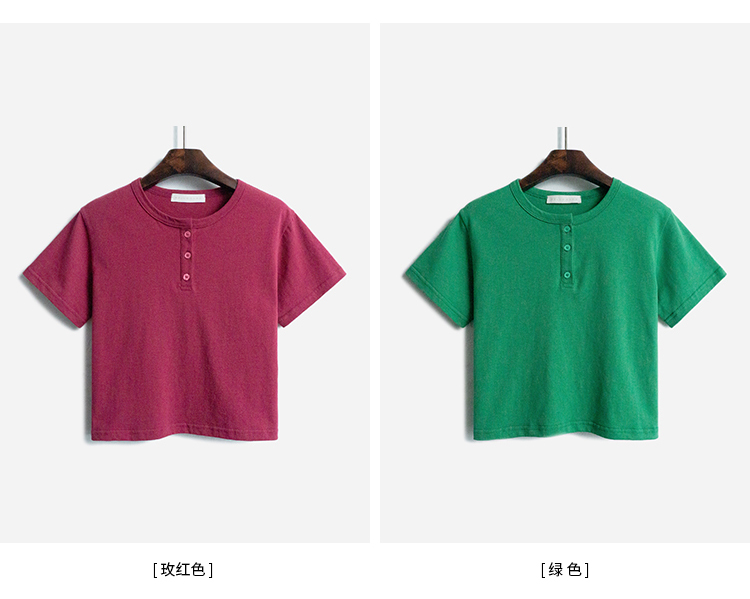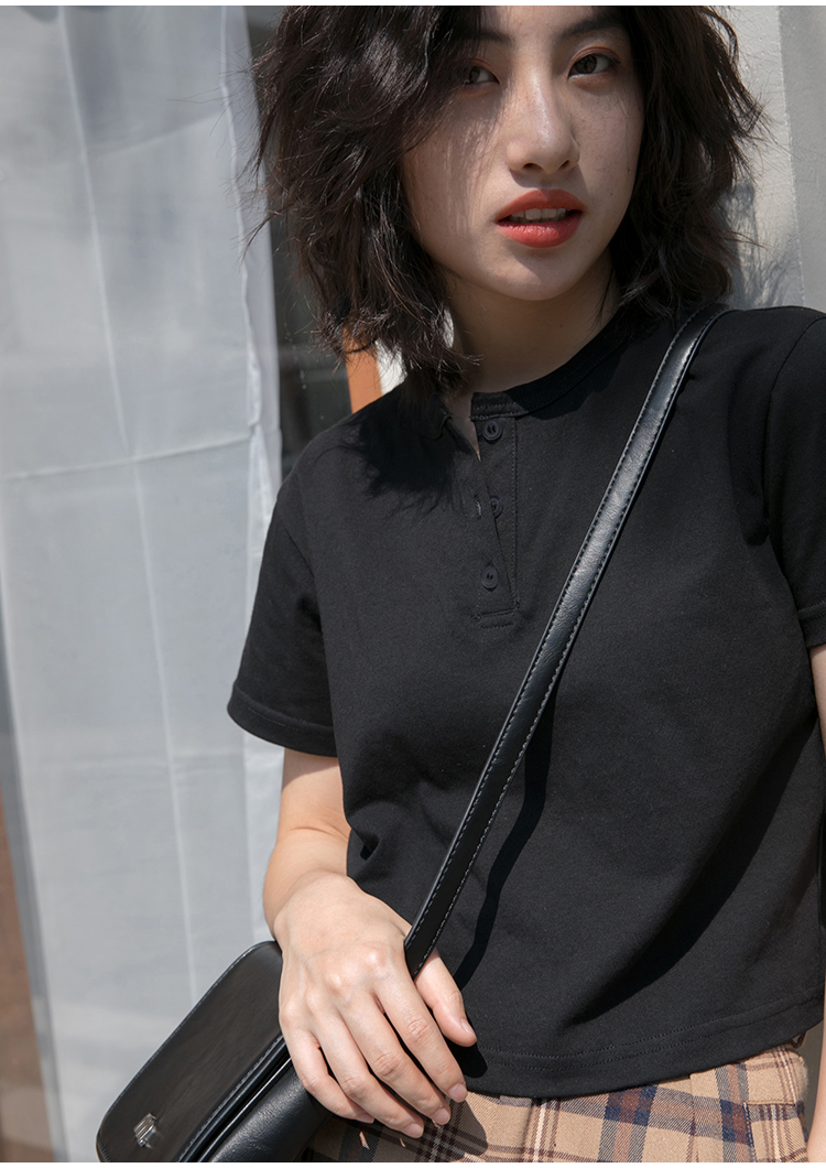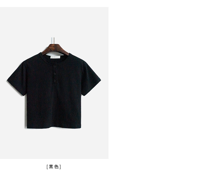 你好卡農 短袖t恤女短款修身2023夏季新款純色三粒扣高腰圓領上衣