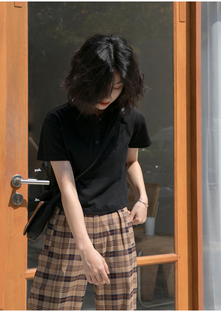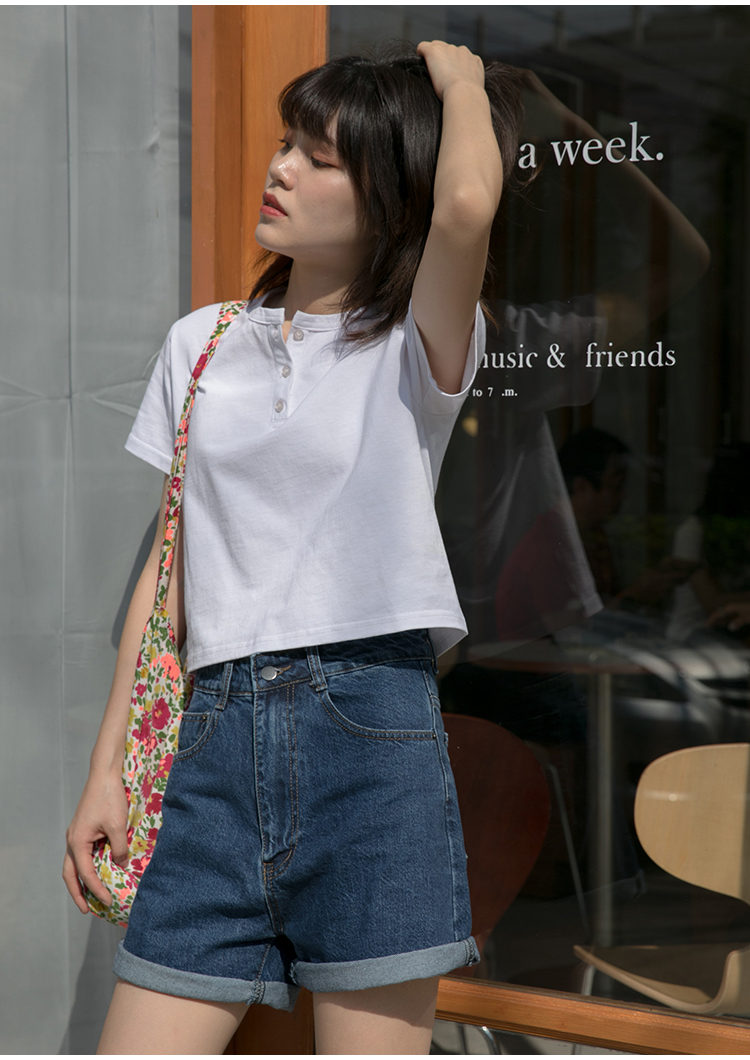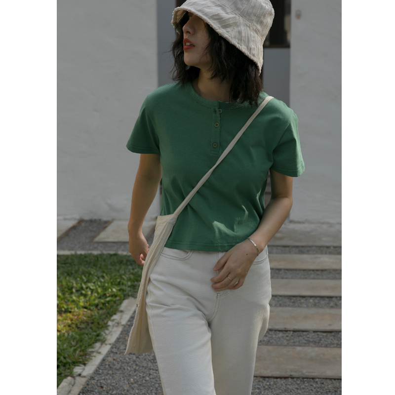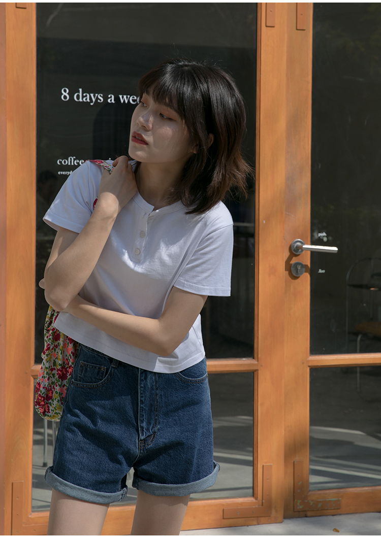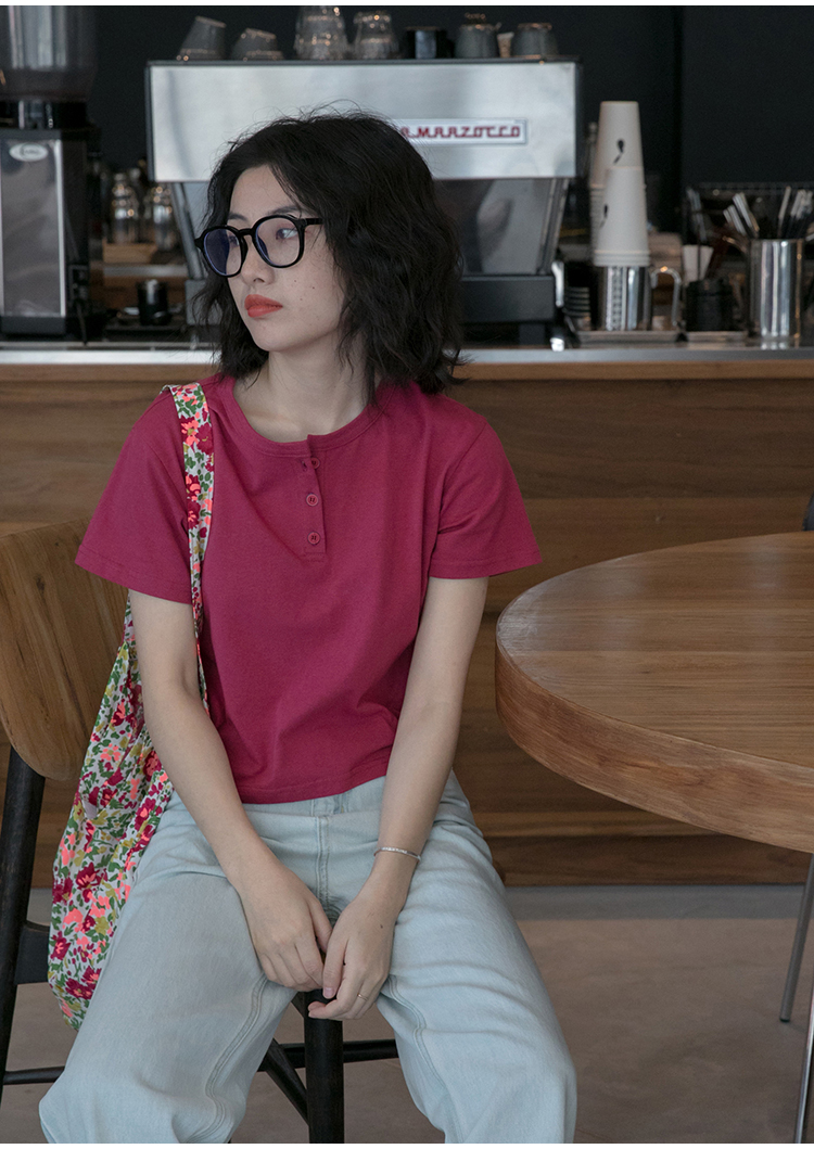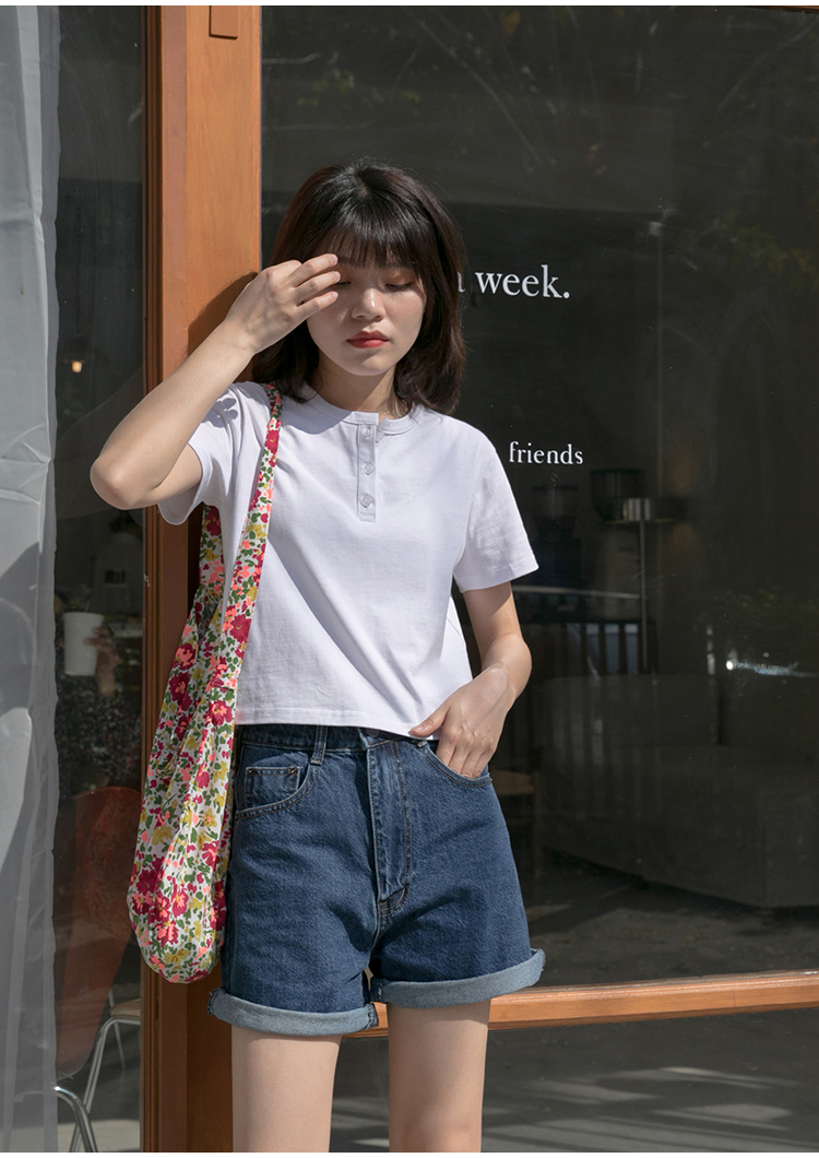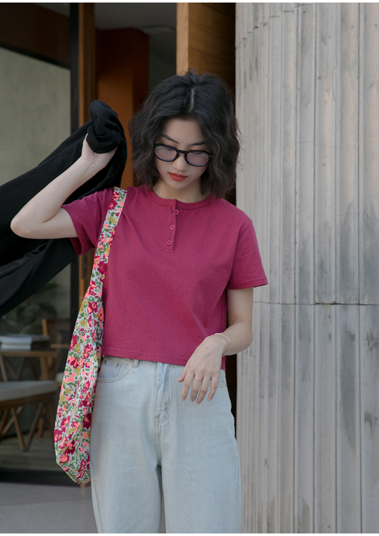 你好卡農 短袖t恤女短款修身2023夏季新款純色三粒扣高腰圓領上衣