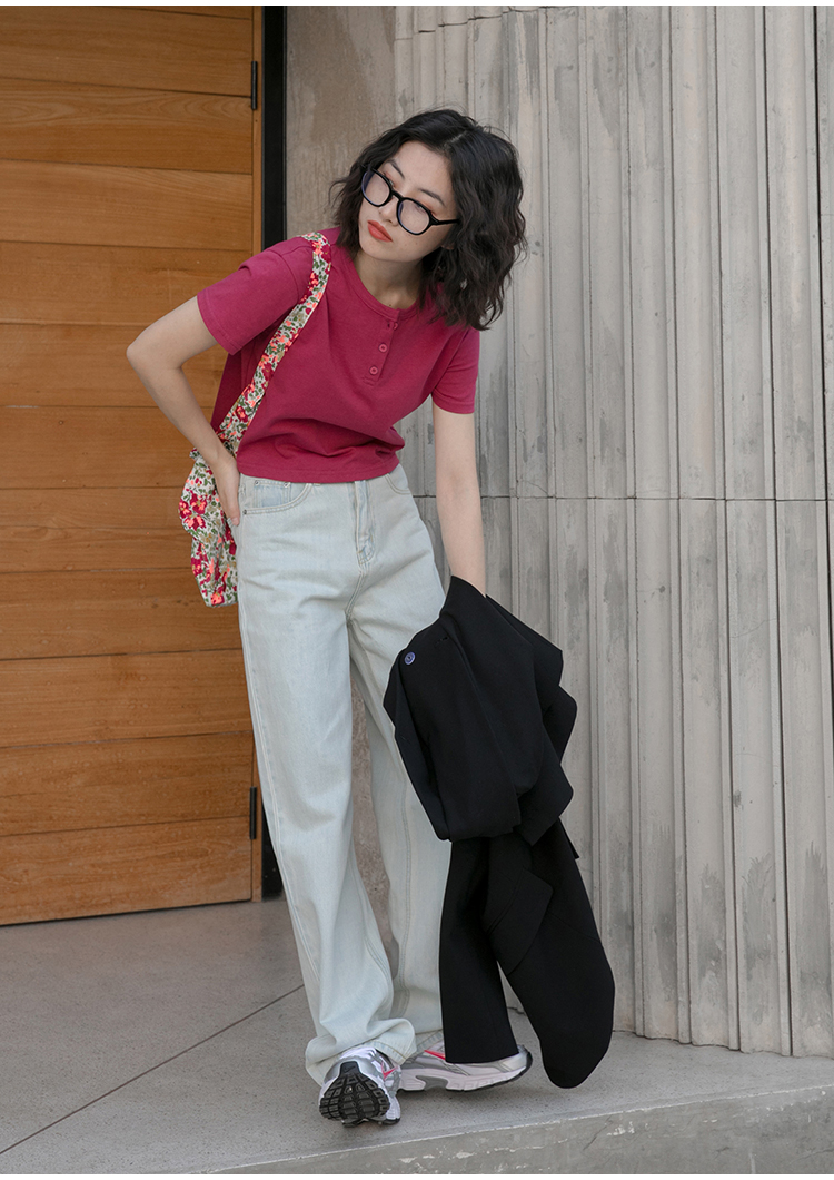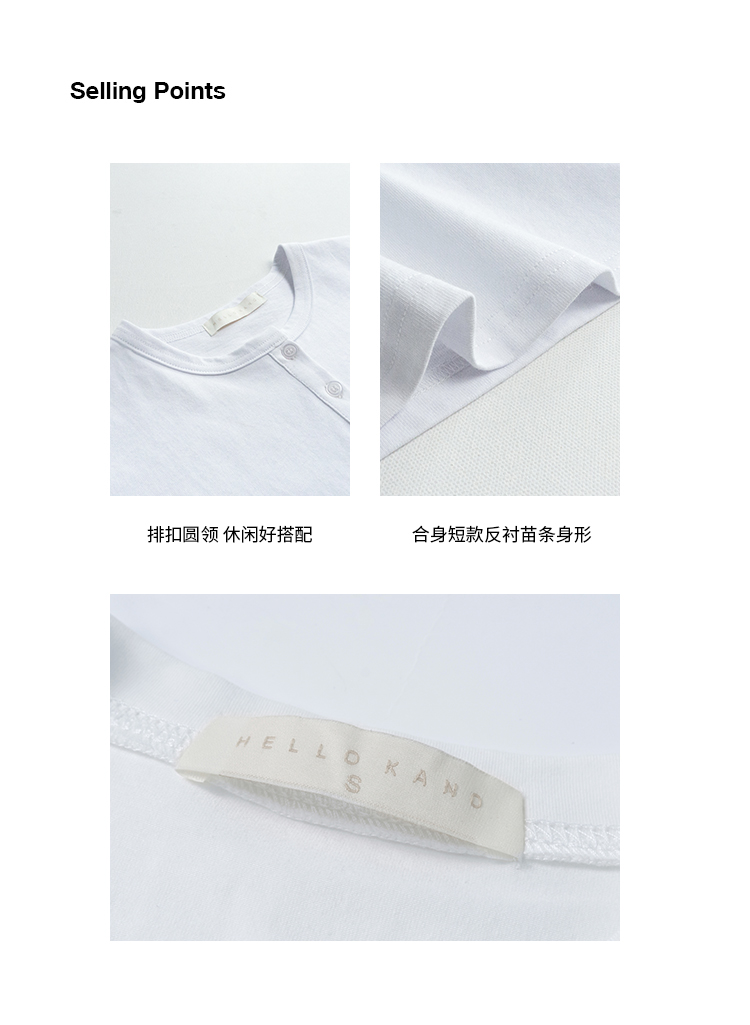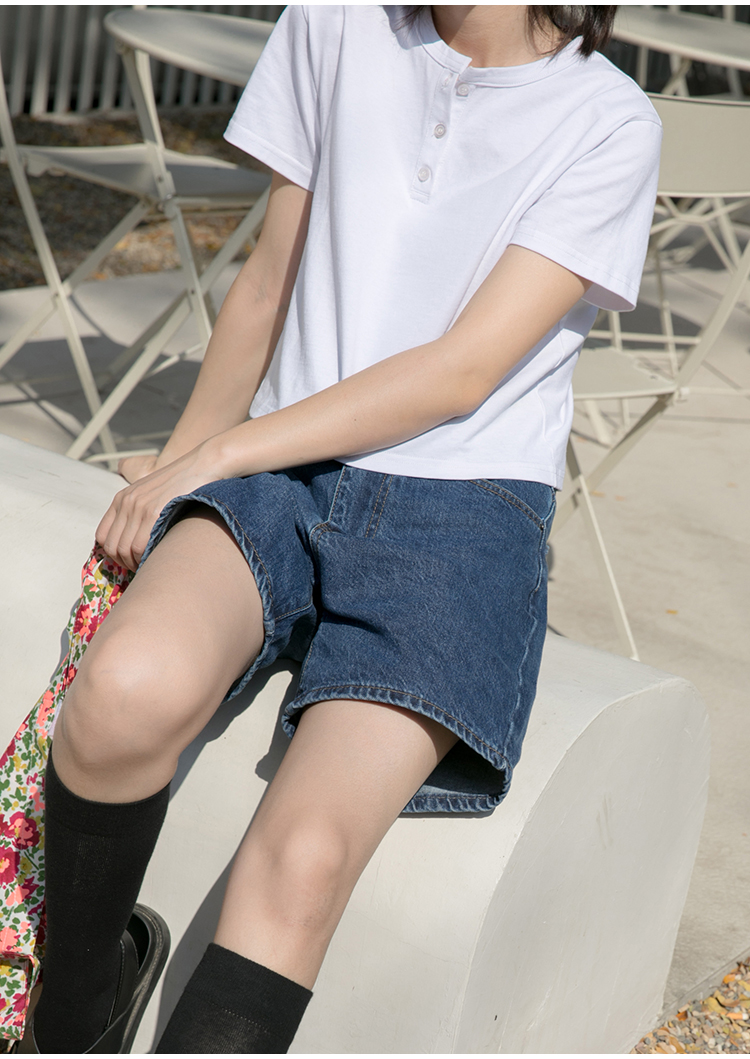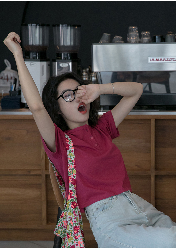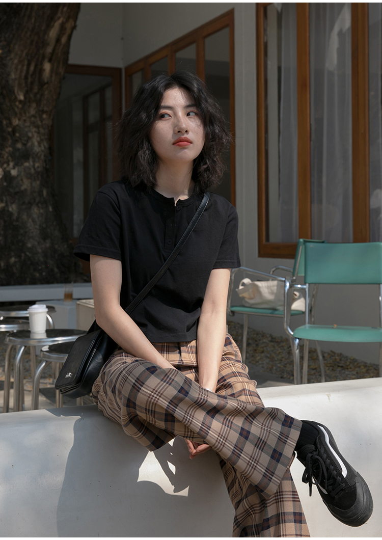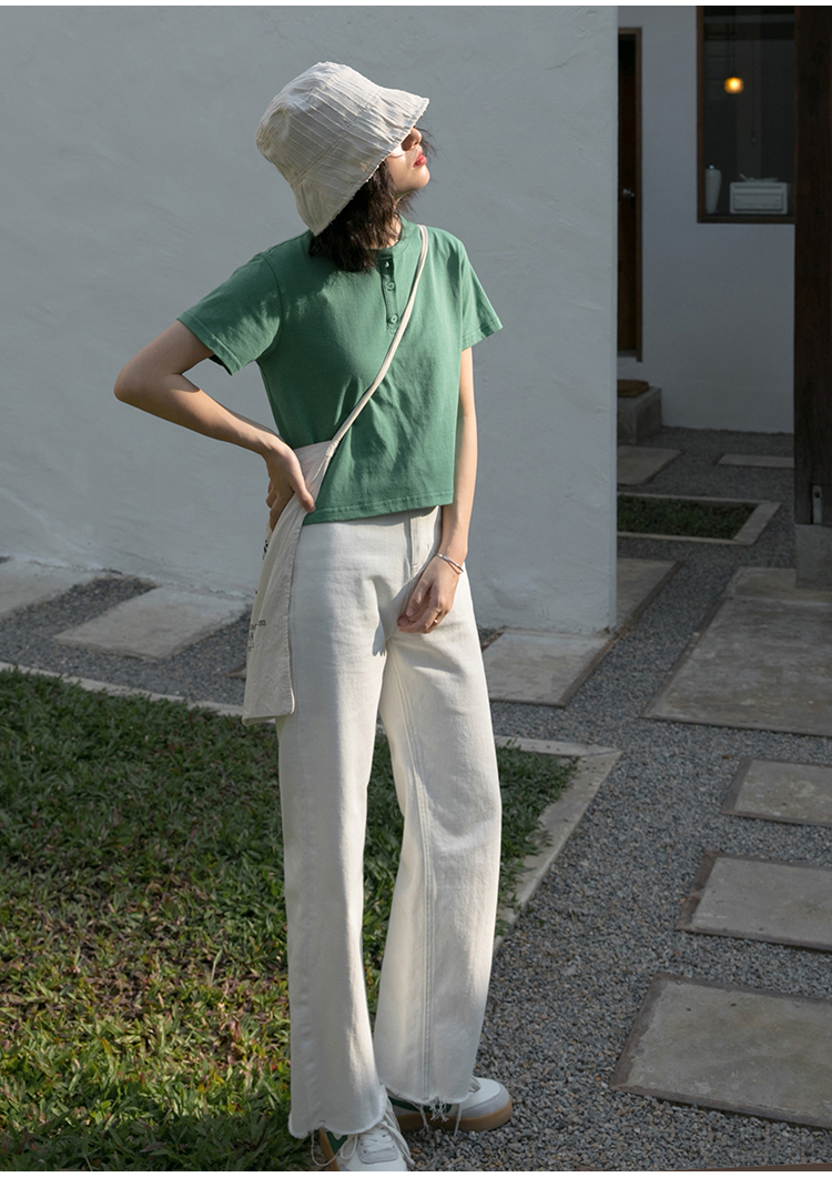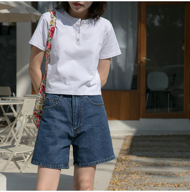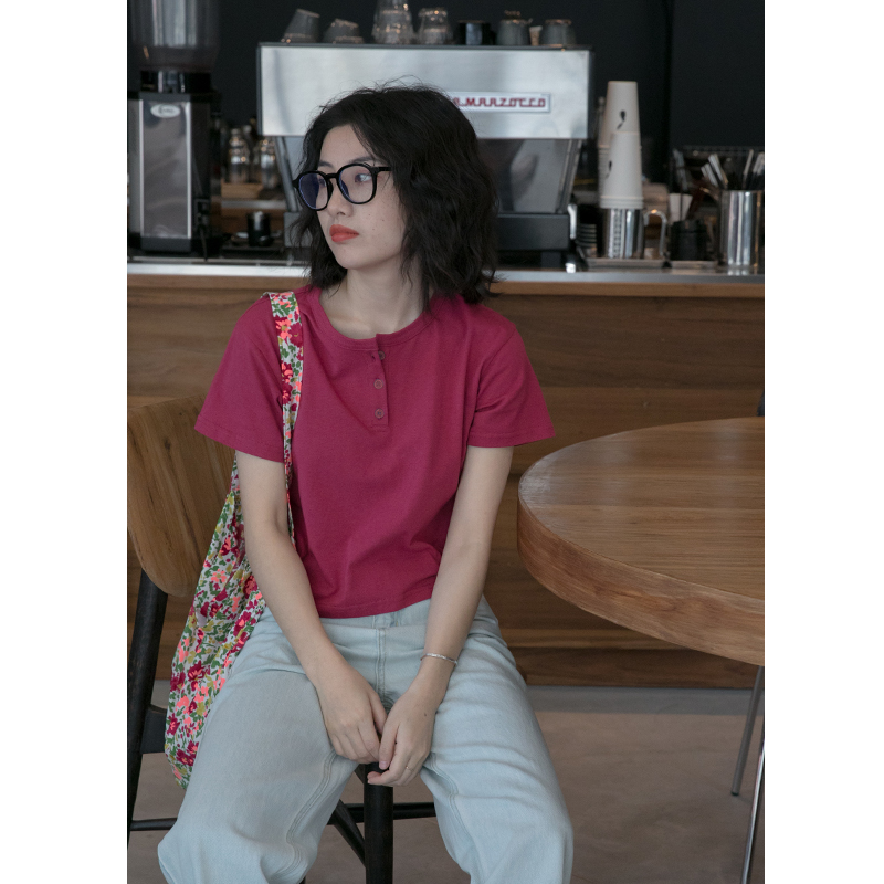 你好卡農 短袖t恤女短款修身2023夏季新款純色三粒扣高腰圓領上衣