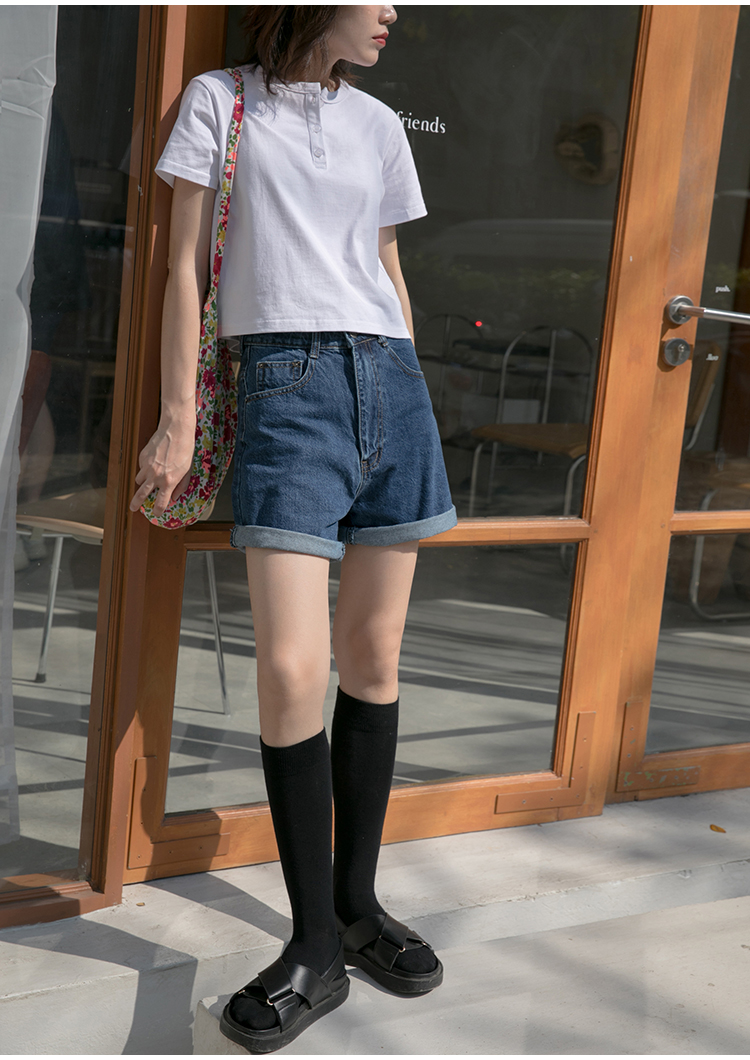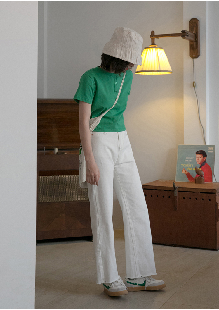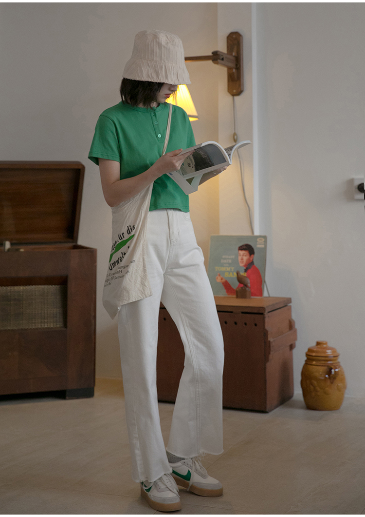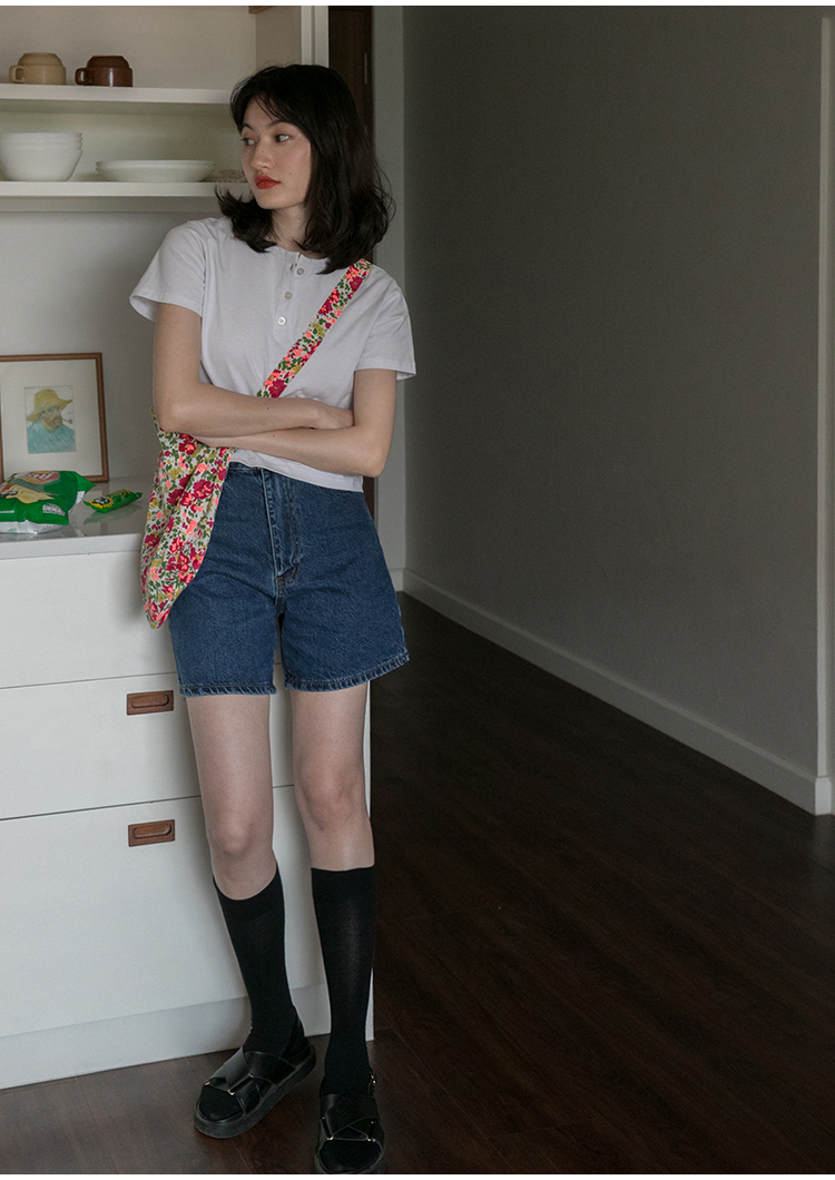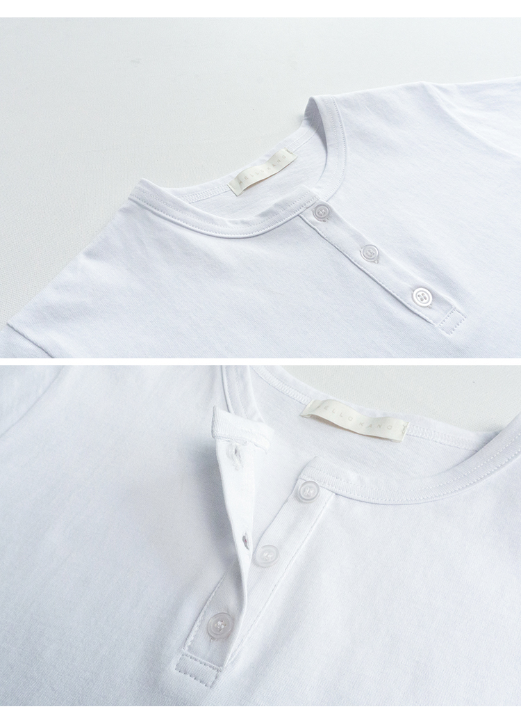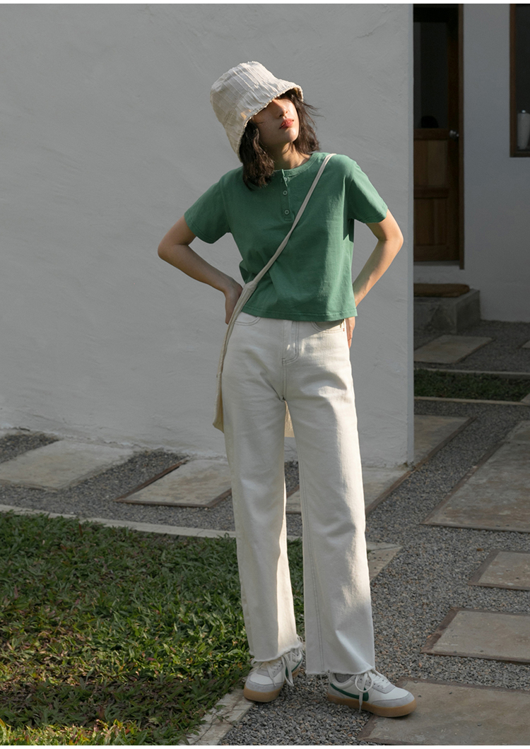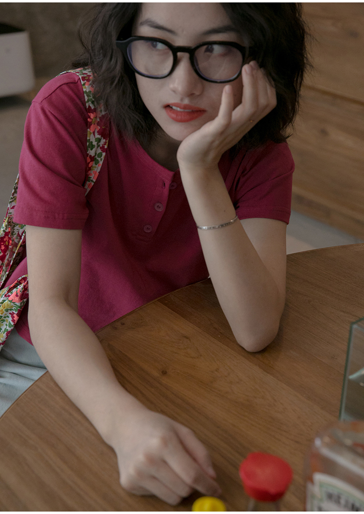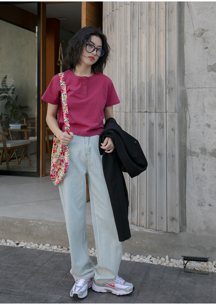 你好卡農 短袖t恤女短款修身2023夏季新款純色三粒扣高腰圓領上衣