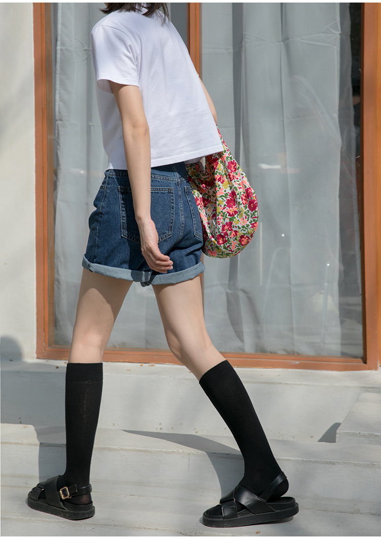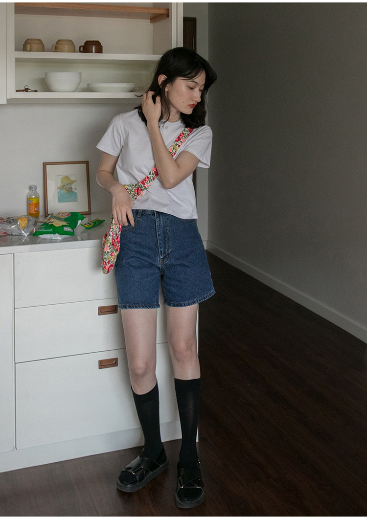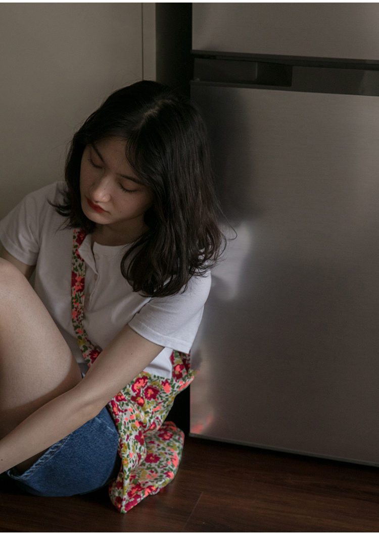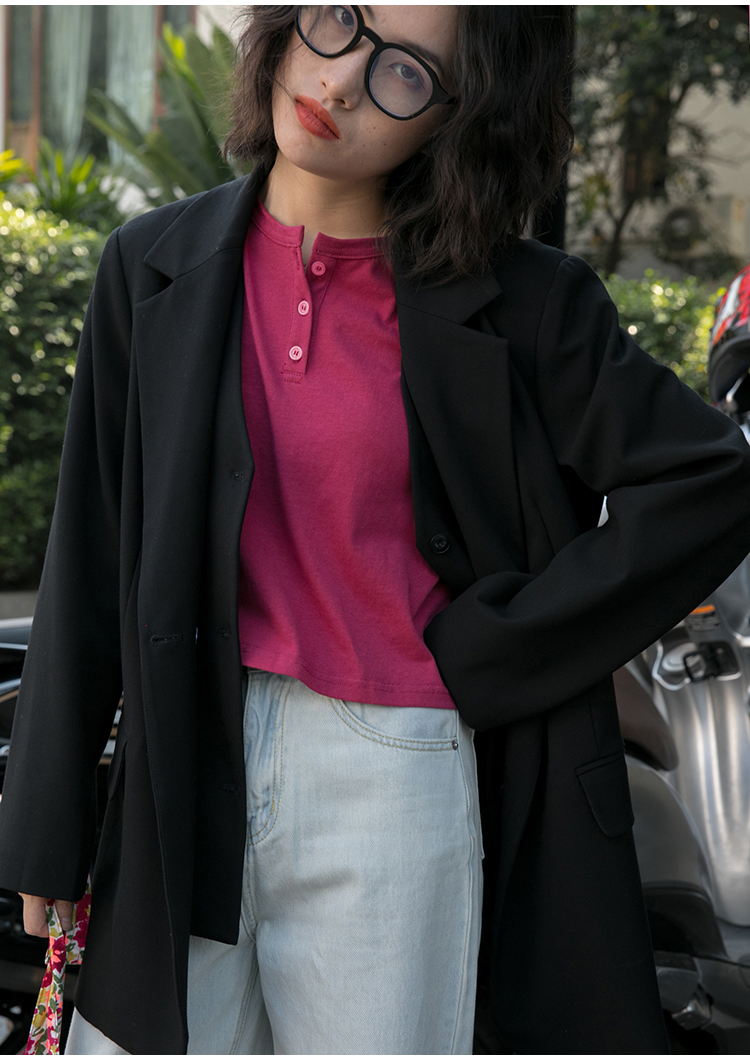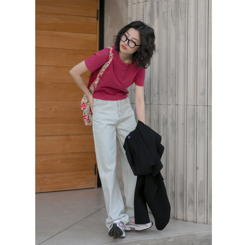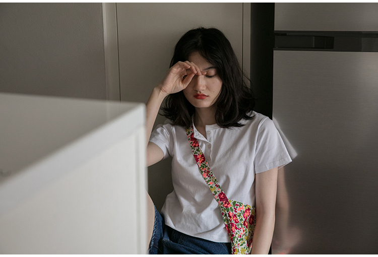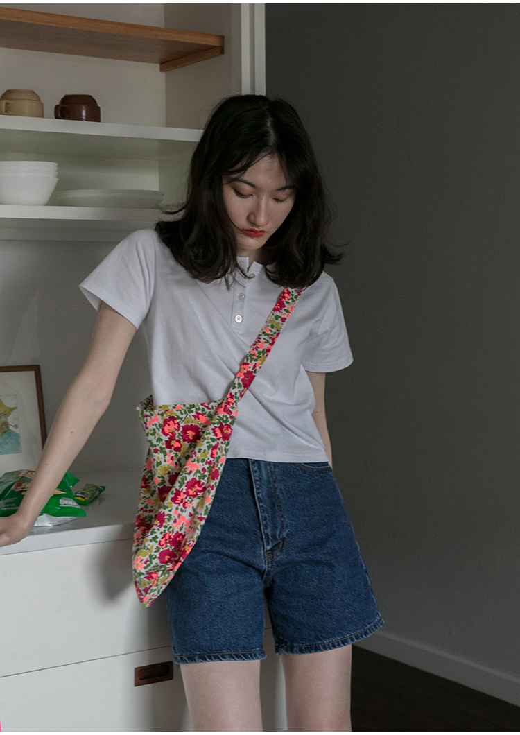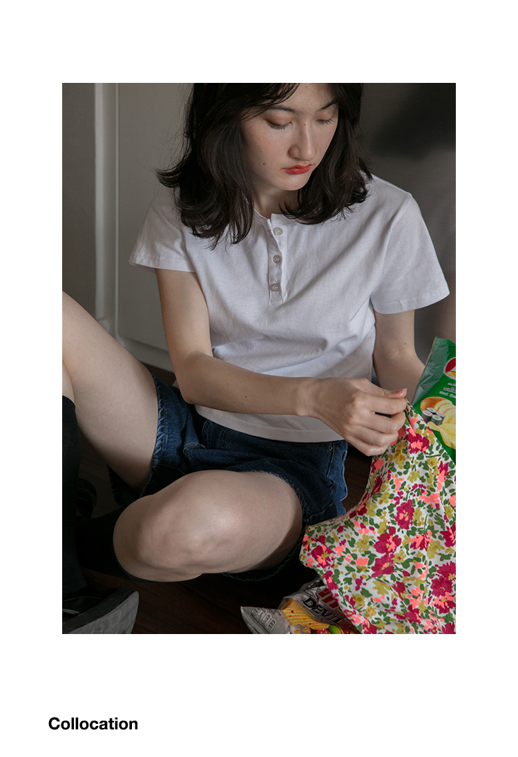 你好卡農 短袖t恤女短款修身2023夏季新款純色三粒扣高腰圓領上衣