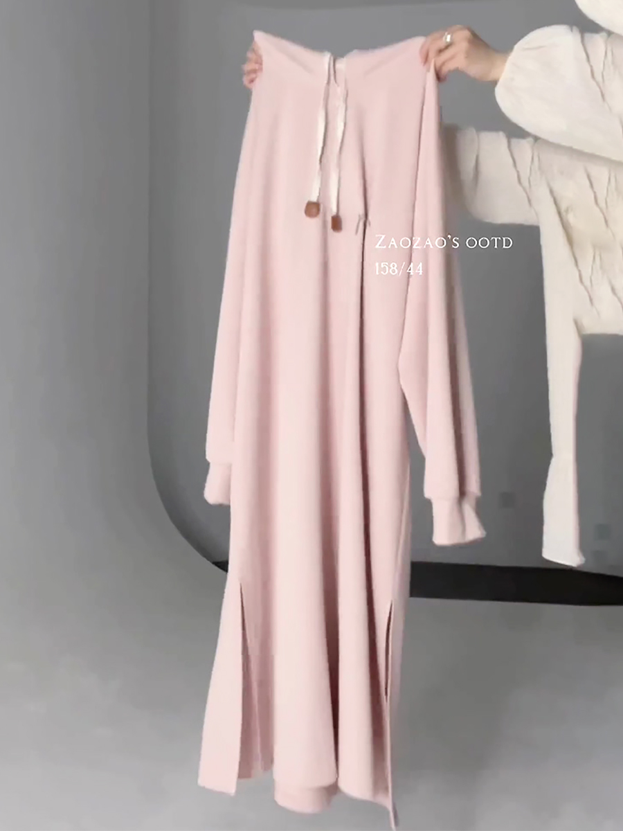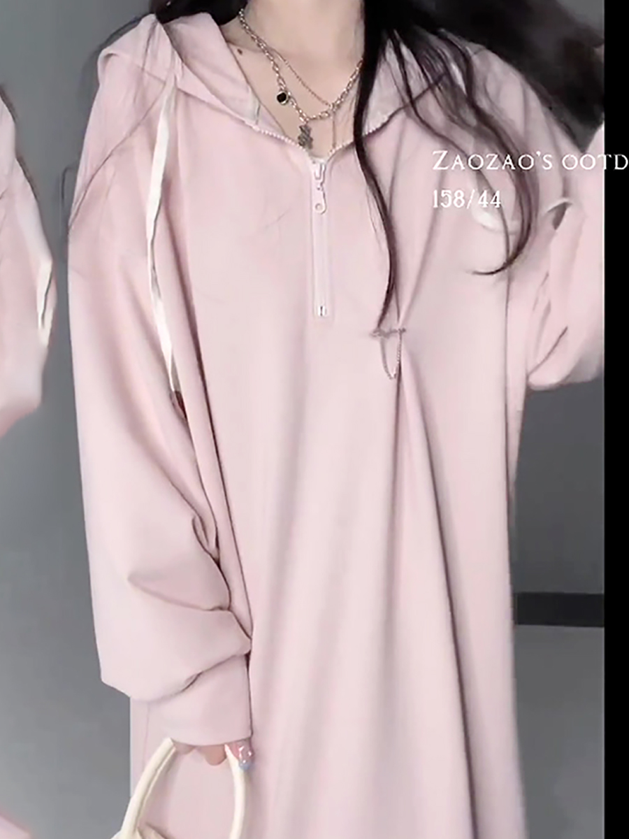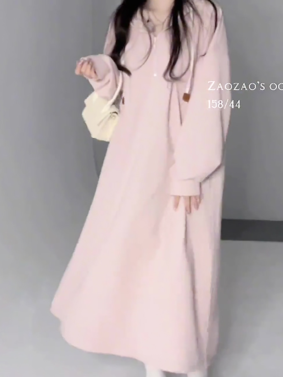 乾枯玫瑰連帽運動衫裙女春季中長版慵懶顯瘦長裙氣質休閒寬鬆洋裝