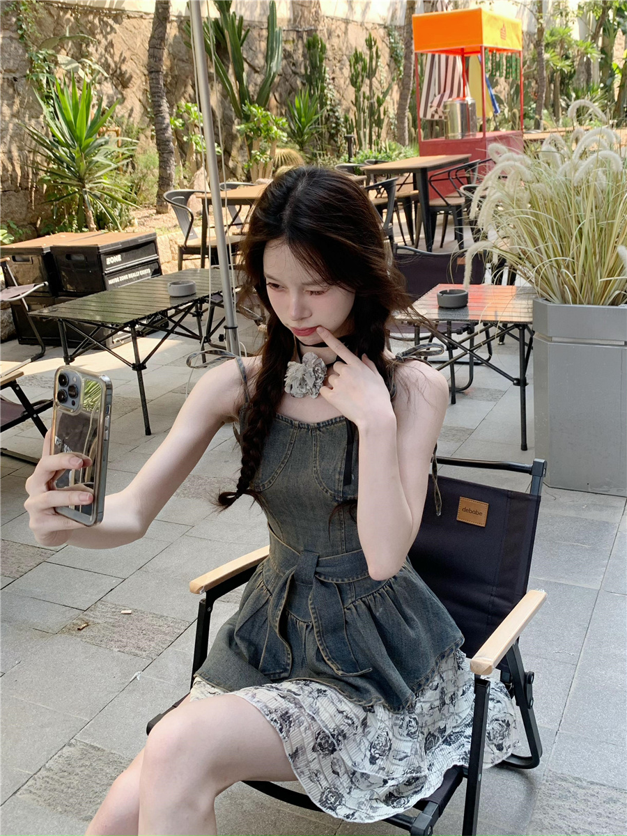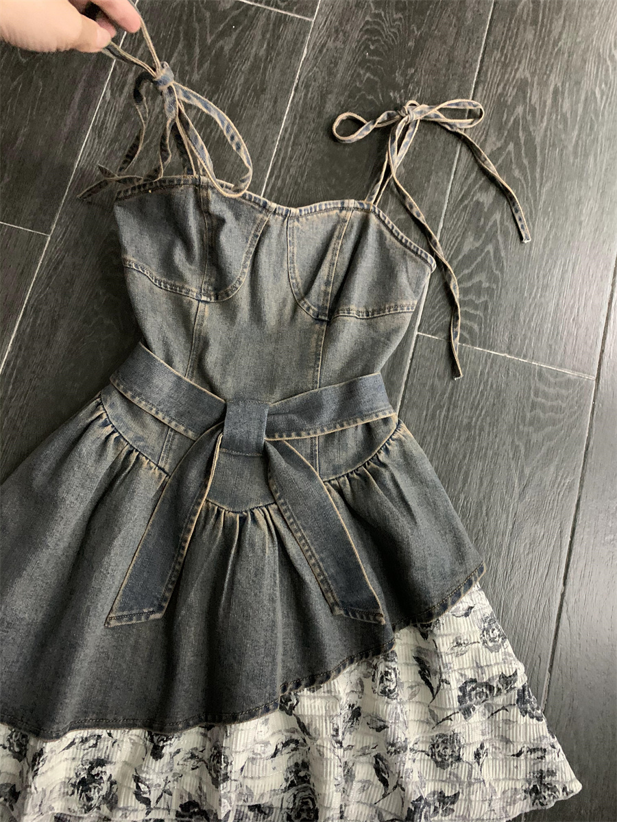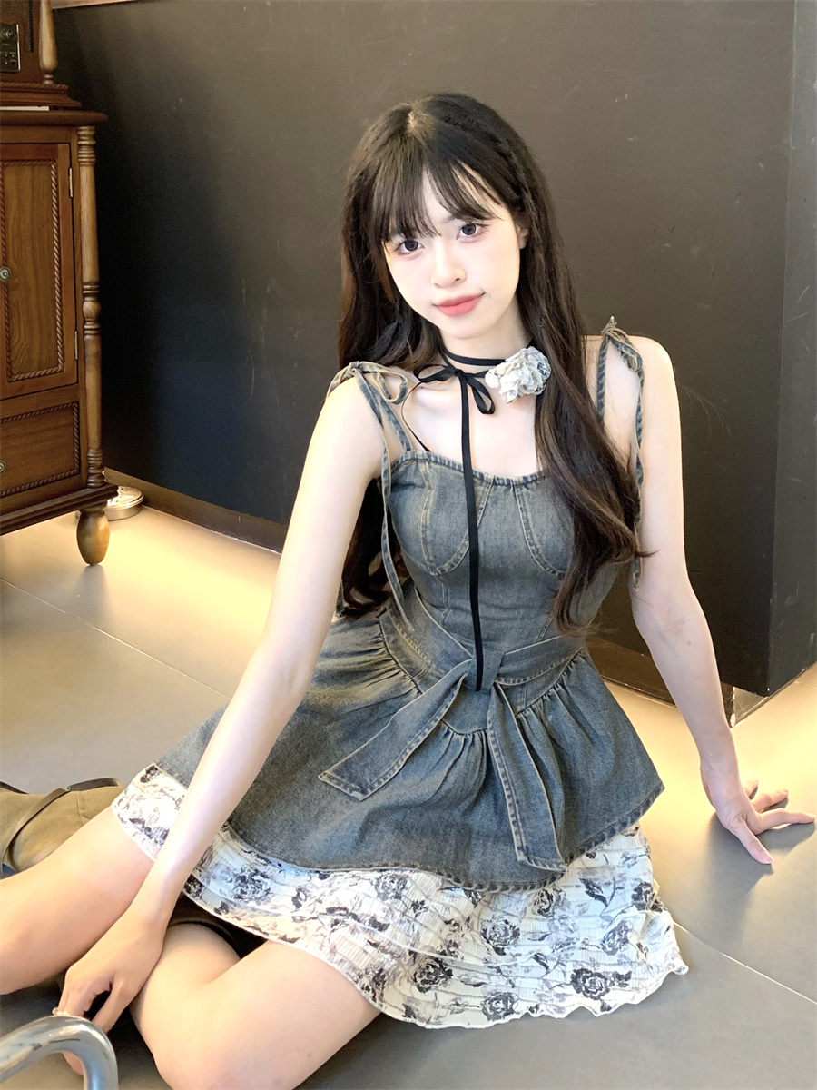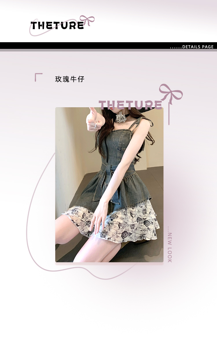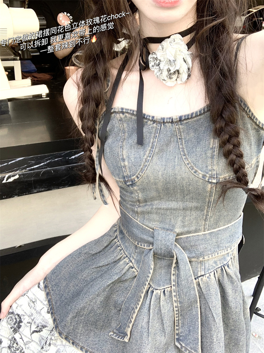 THETURE 原創玫瑰牛仔洋裝女夏季2023新款顯瘦辣妹吊帶裙高級感