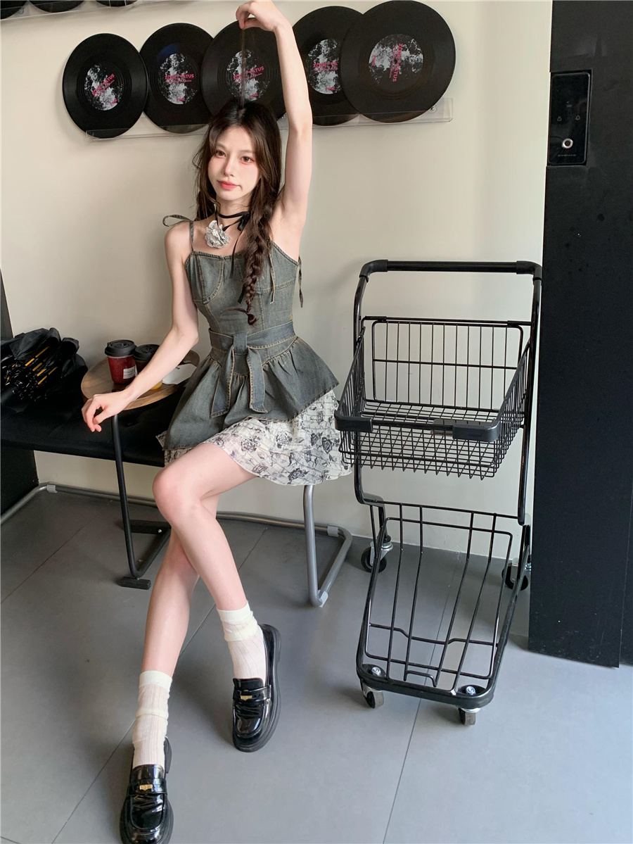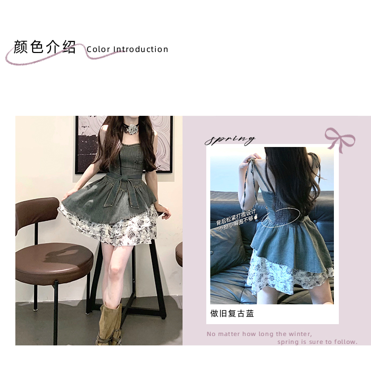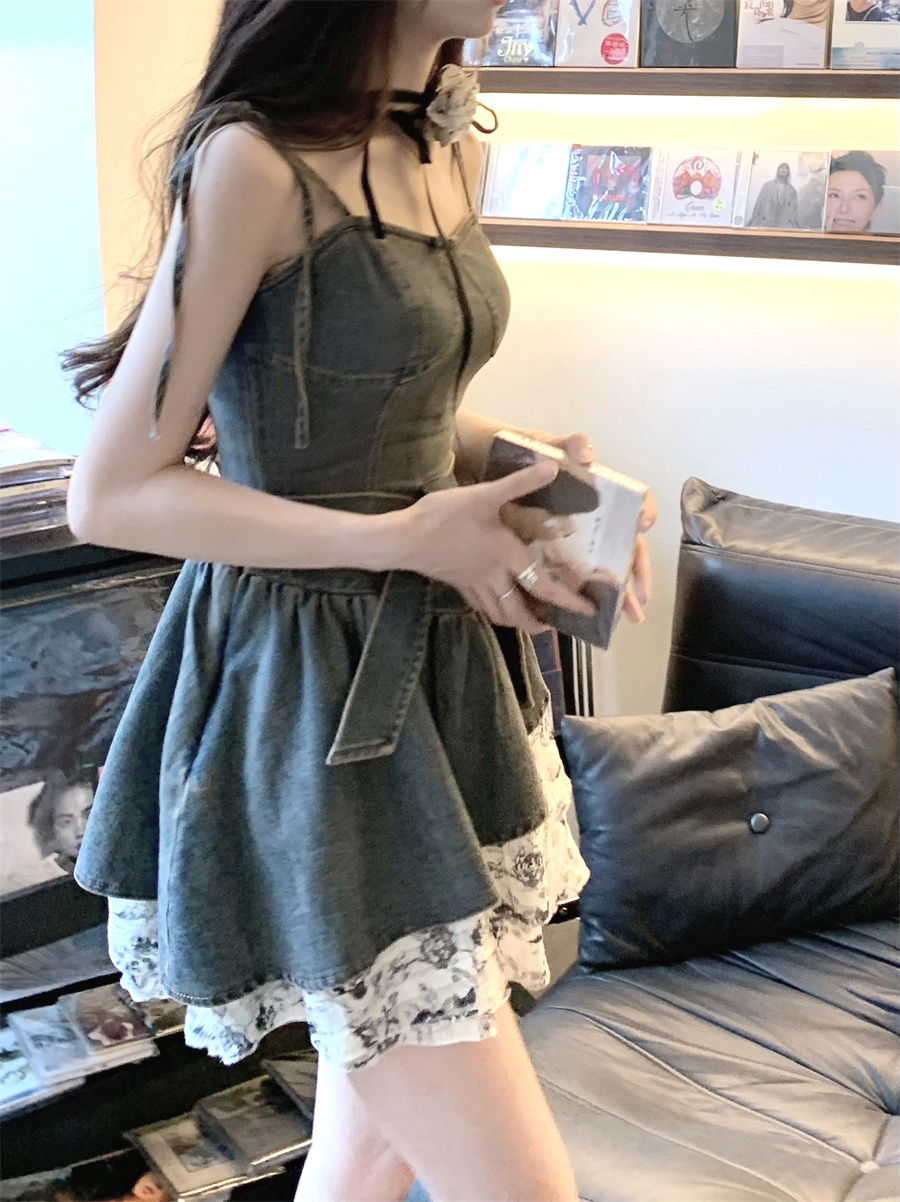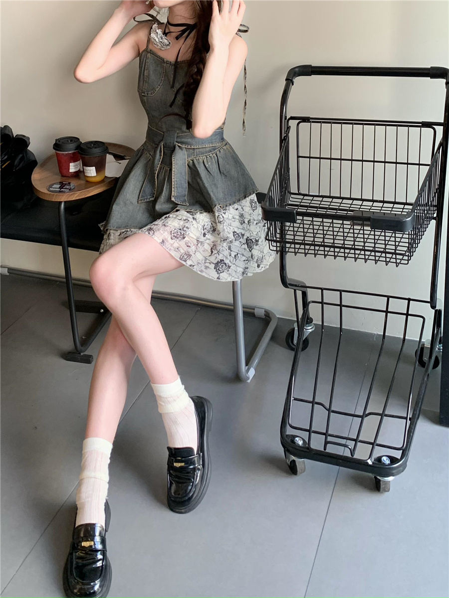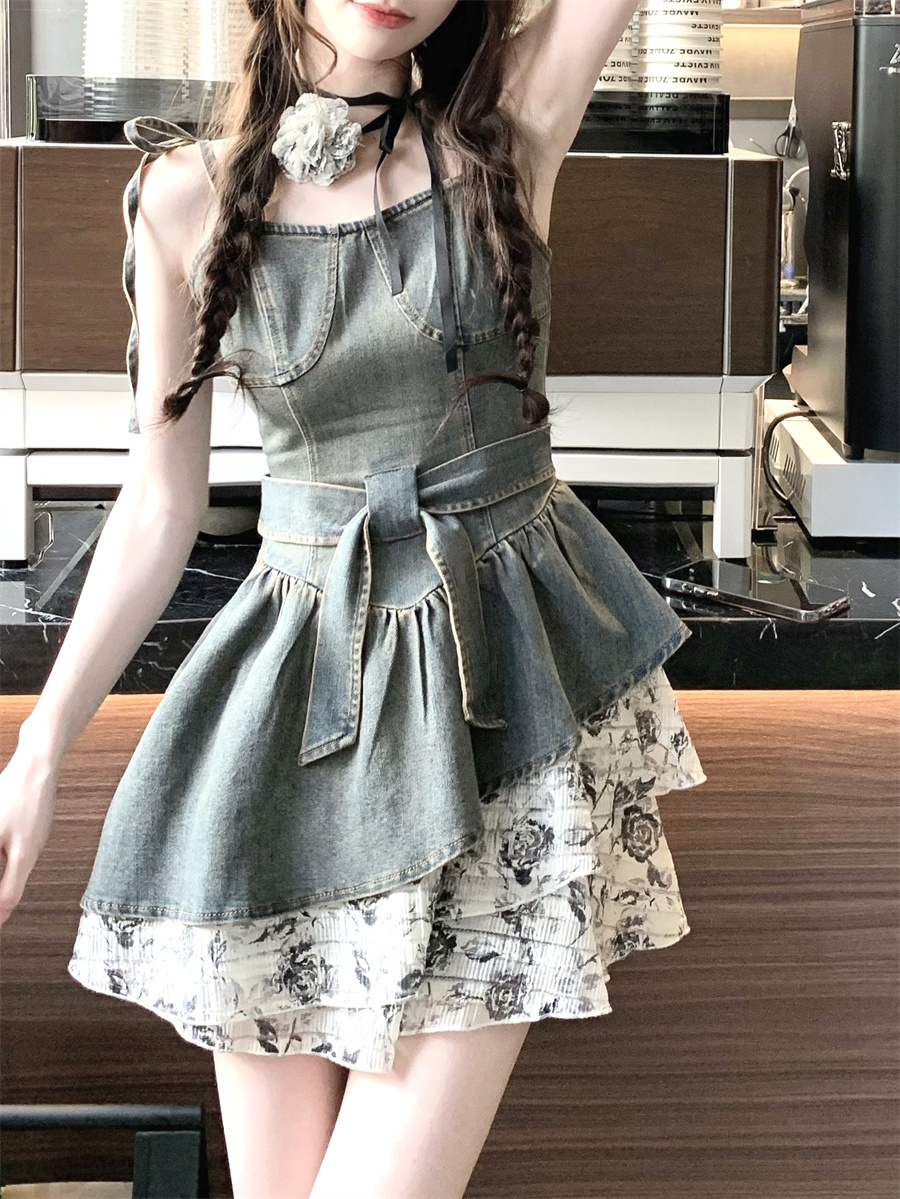 THETURE 原創玫瑰牛仔洋裝女夏季2023新款顯瘦辣妹吊帶裙高級感