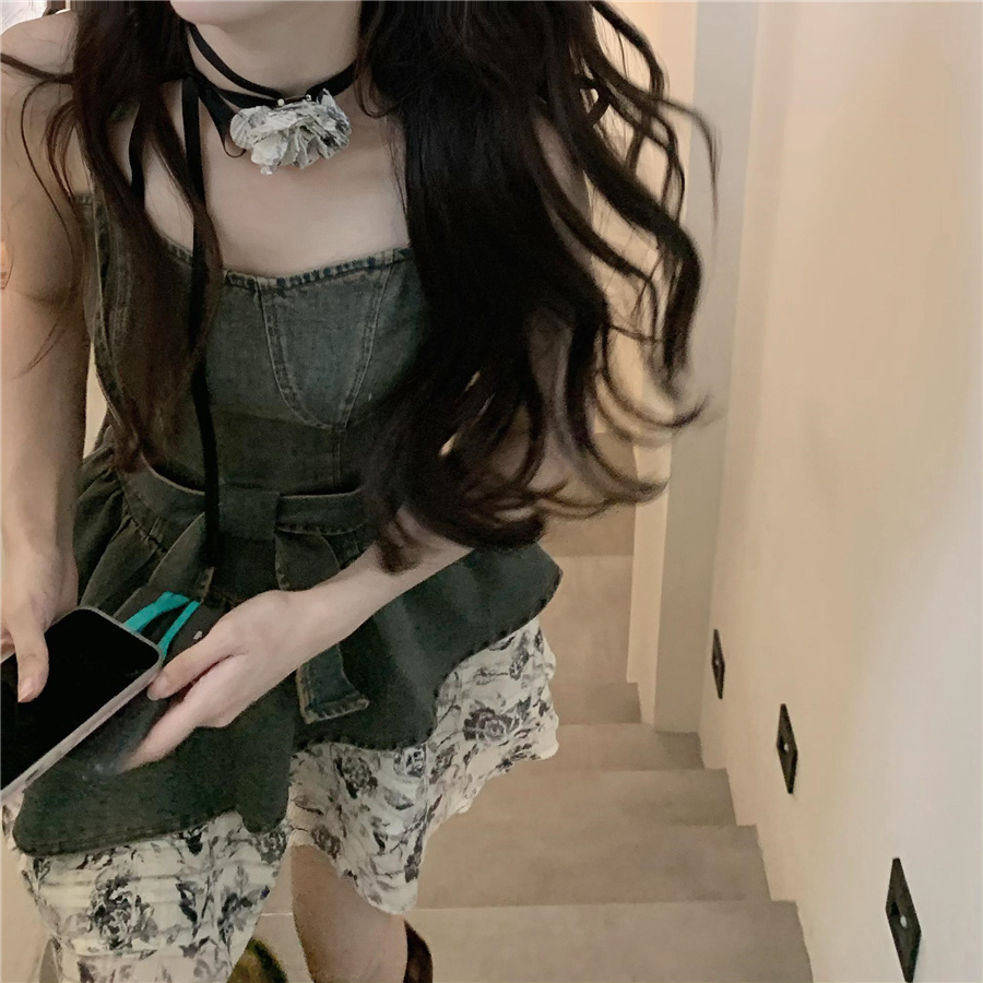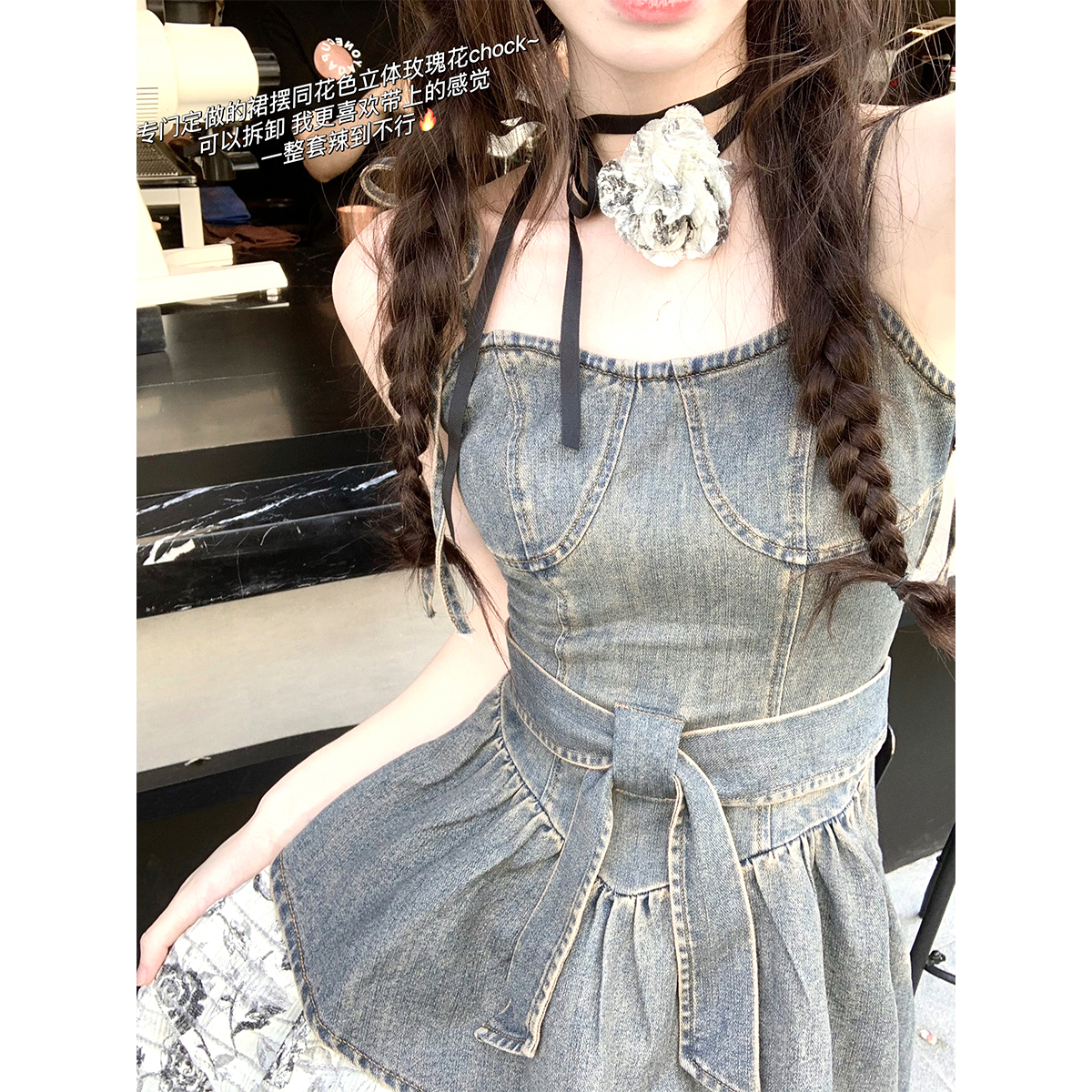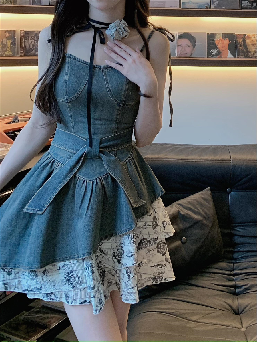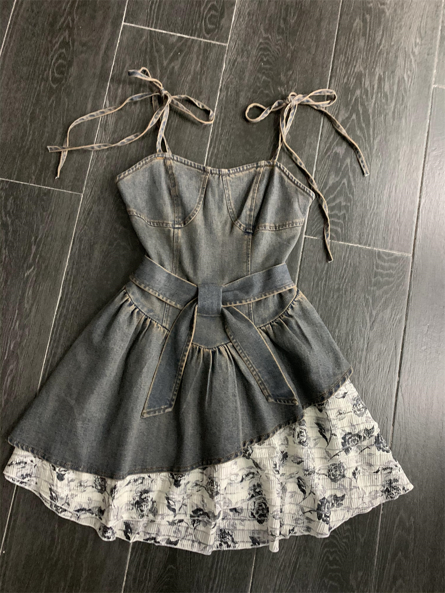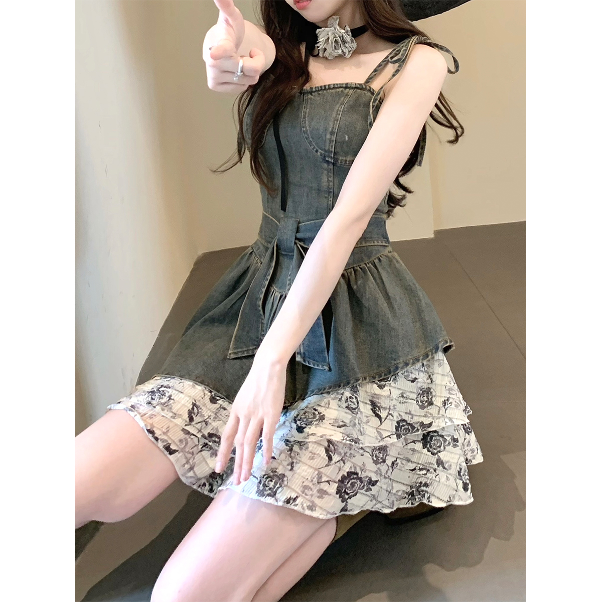 THETURE 原創玫瑰牛仔洋裝女夏季2023新款顯瘦辣妹吊帶裙高級感