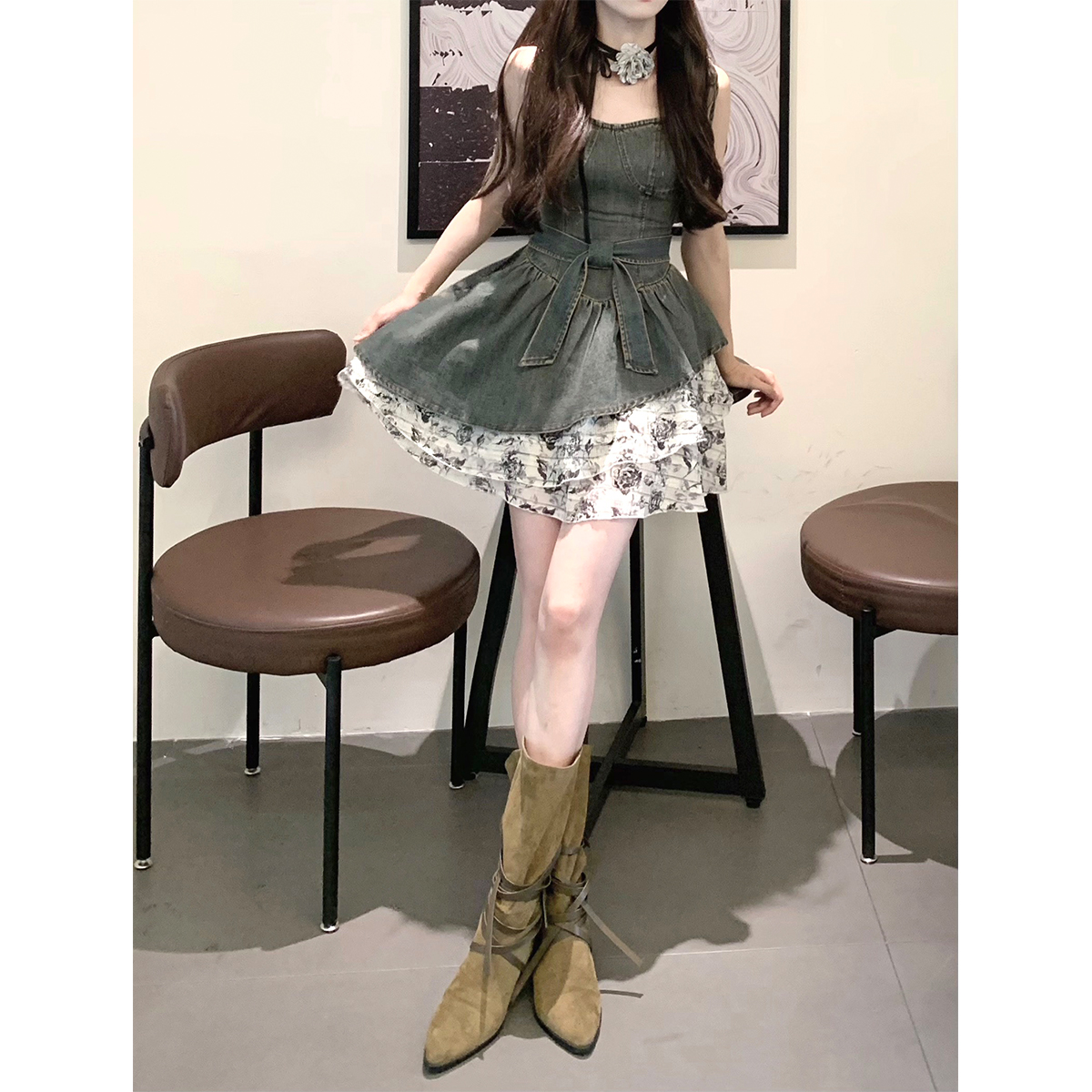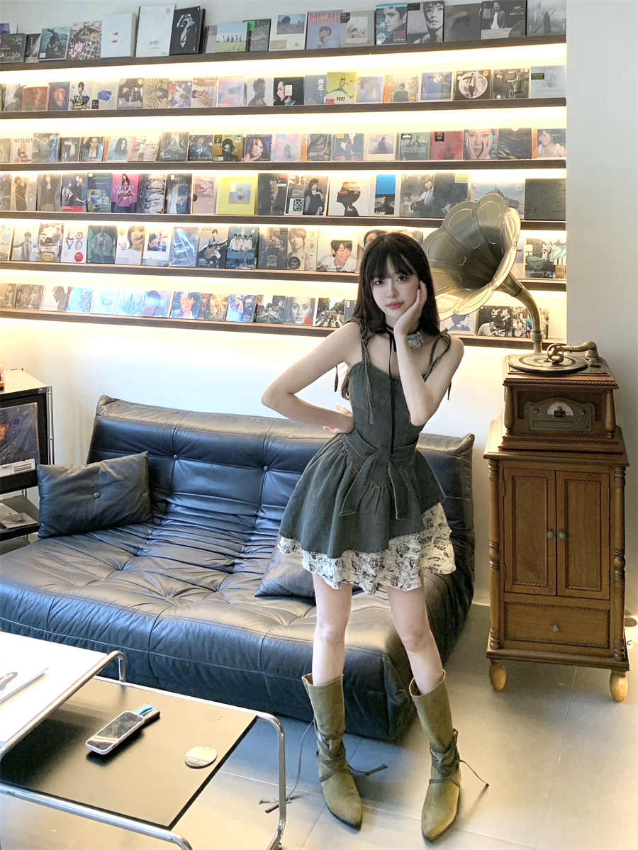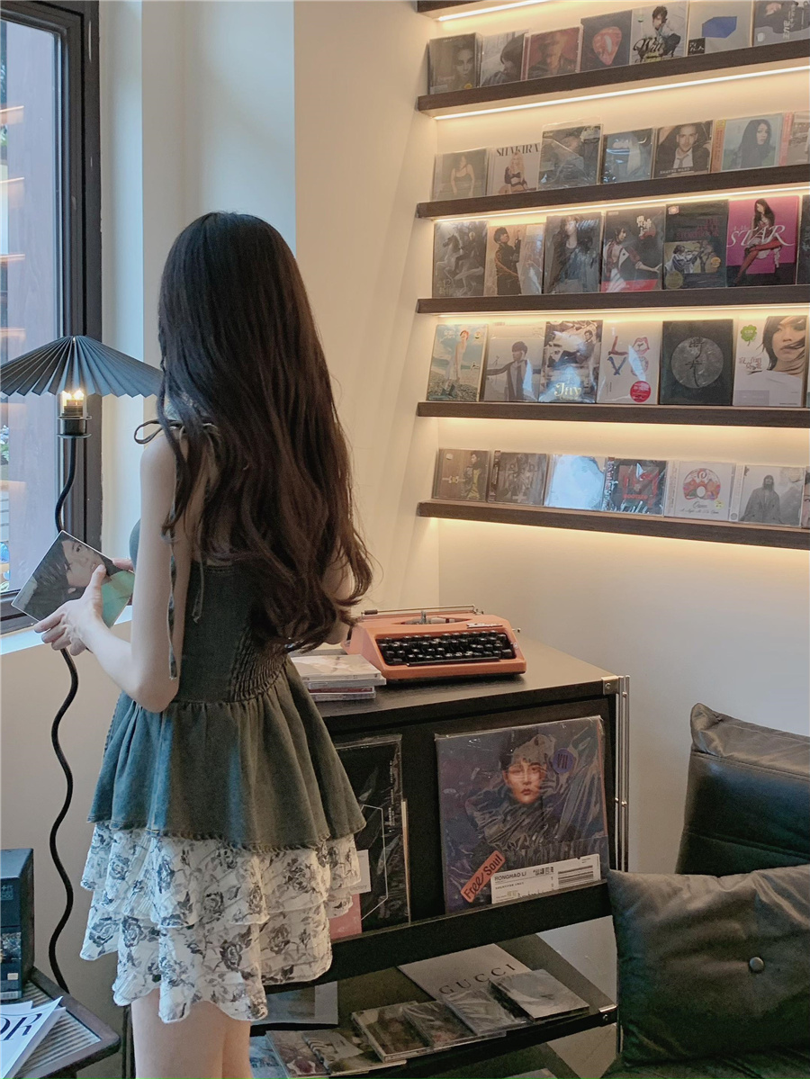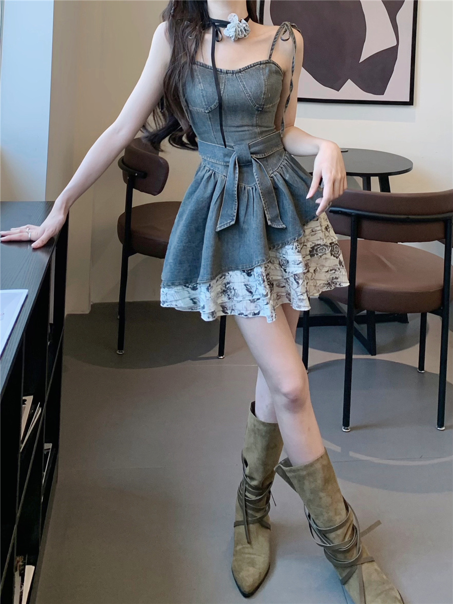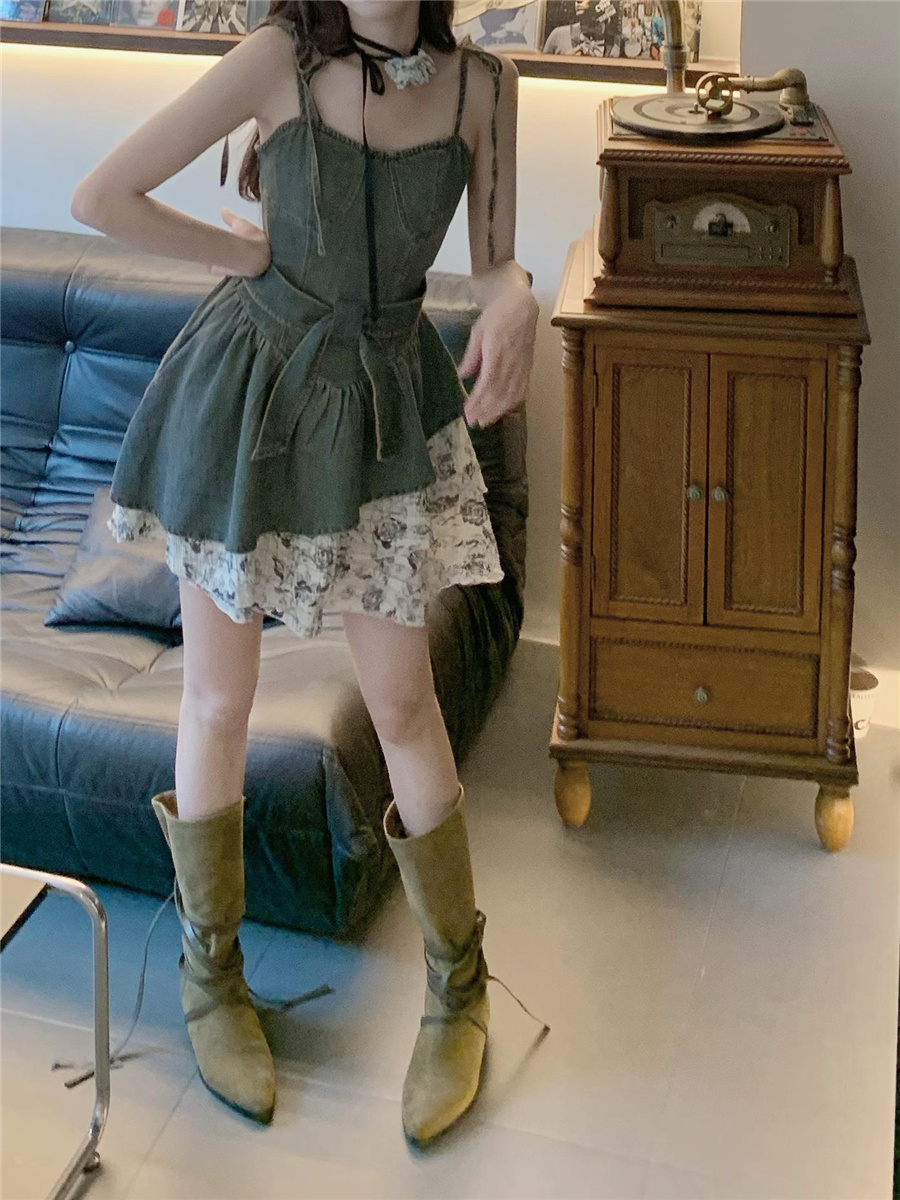 THETURE 原創玫瑰牛仔洋裝女夏季2023新款顯瘦辣妹吊帶裙高級感