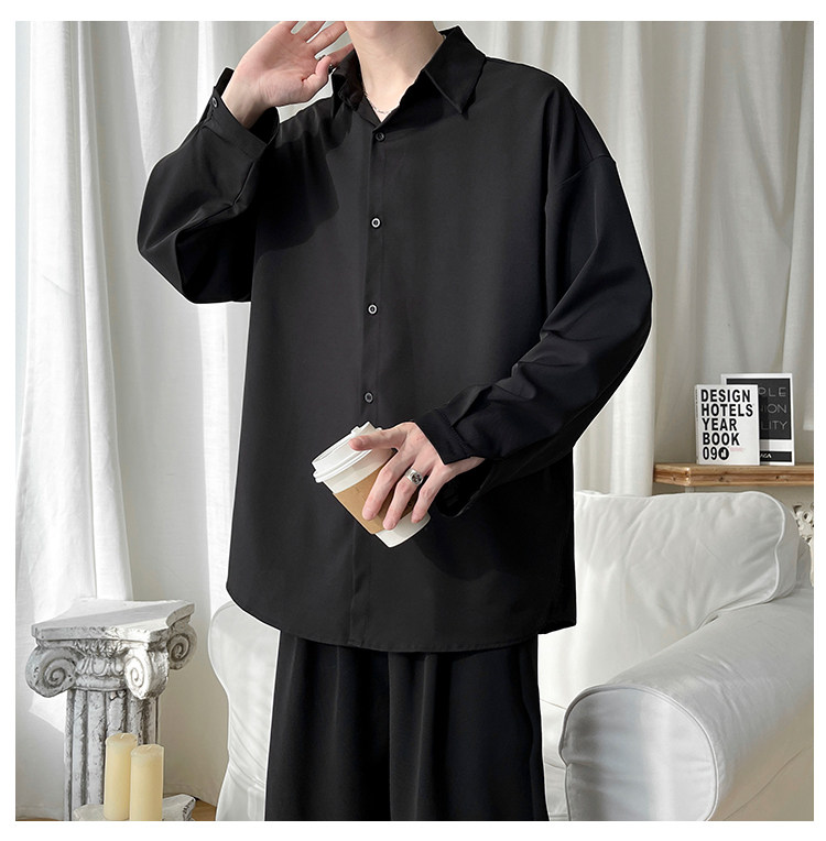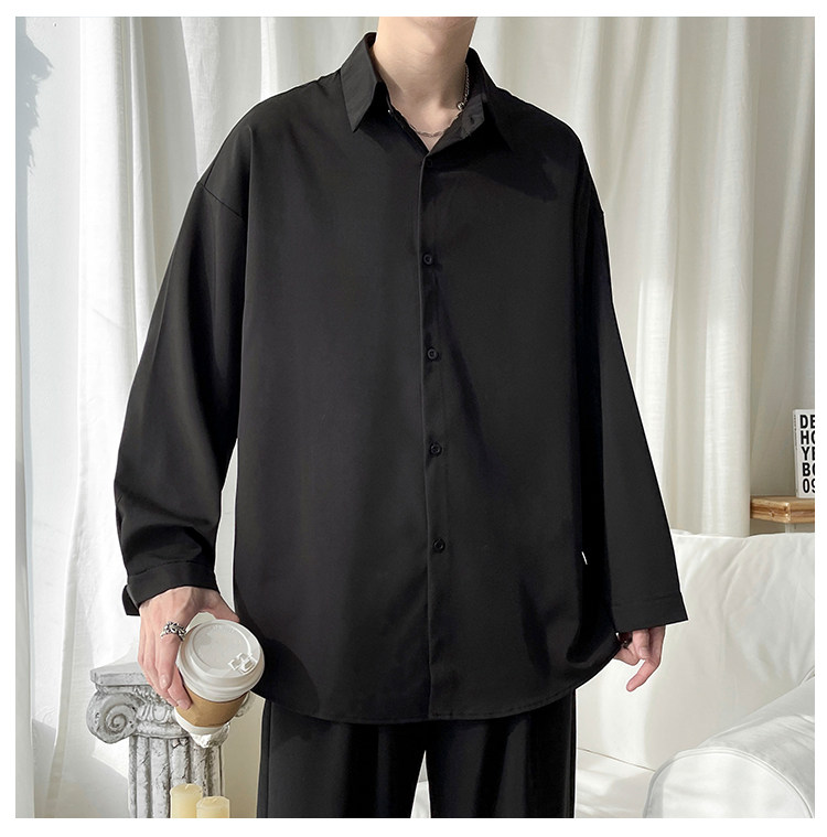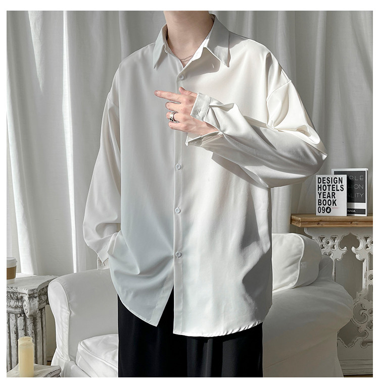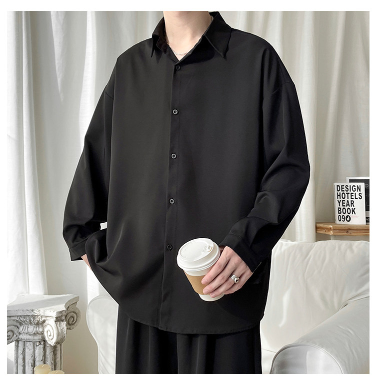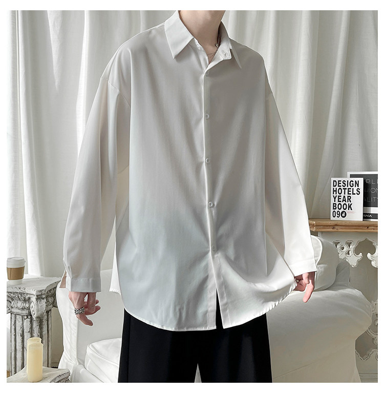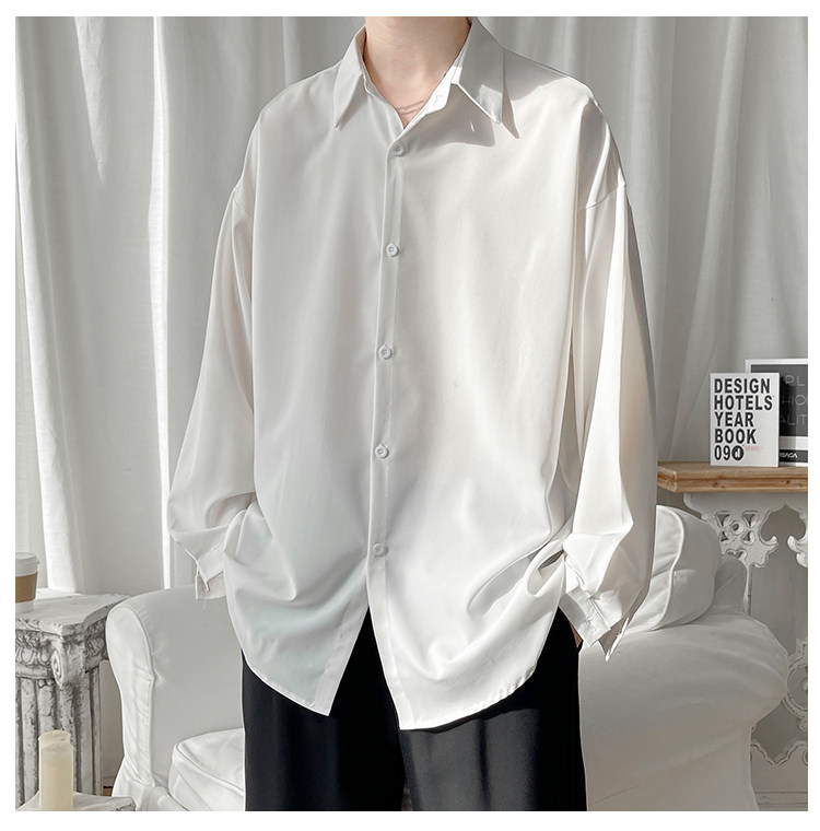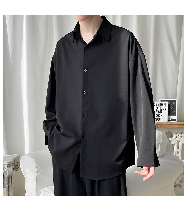黑色襯衫男長袖高級垂感痞帥潮流休閒寸衫夏季寬鬆大尺碼冰絲白襯衣