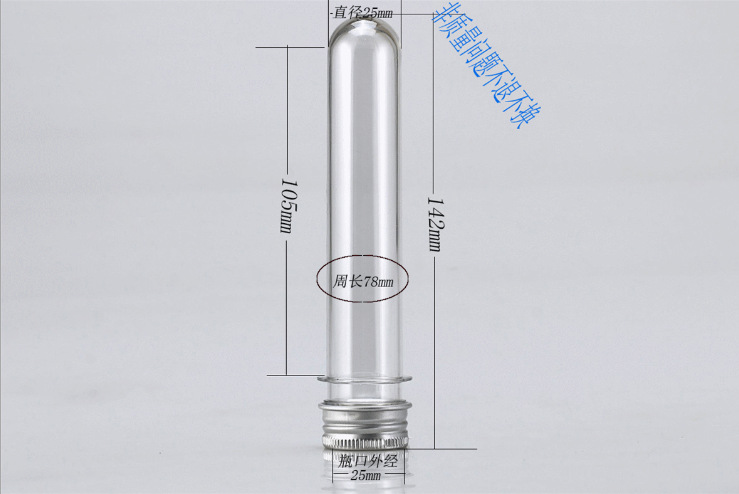 配盖高:142mm  直径:25MM   周长:78mm 口径:28MM 配套:透明管身+白色通用盖或者本色铝盖        可按要求定做各种颜色       PET塑料瓶性质表面平滑而有光泽。尺寸稳定性好,磨耗小而硬度高,具有热塑性塑料中最大的韧性;无毒、耐气候性、抗化学药品稳定性好,吸水率低,耐弱酸和有机溶剂。