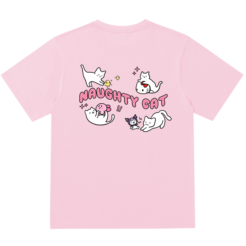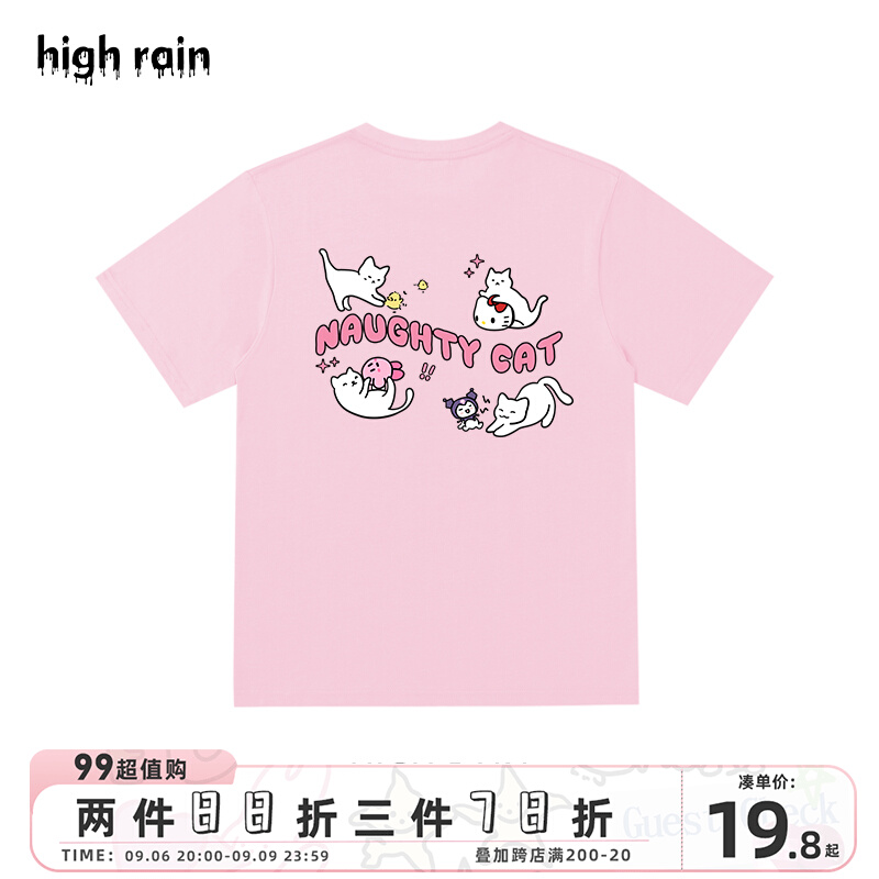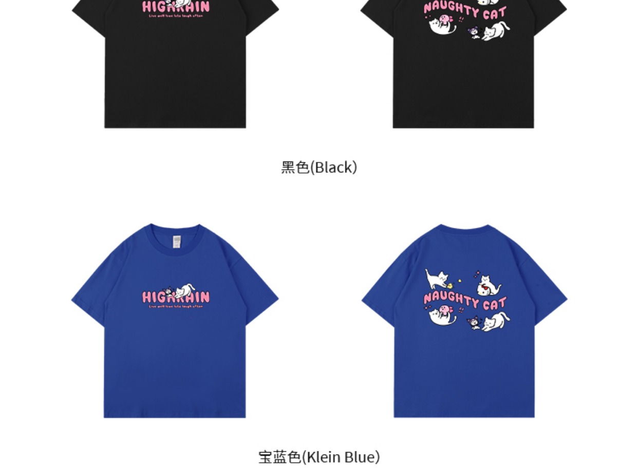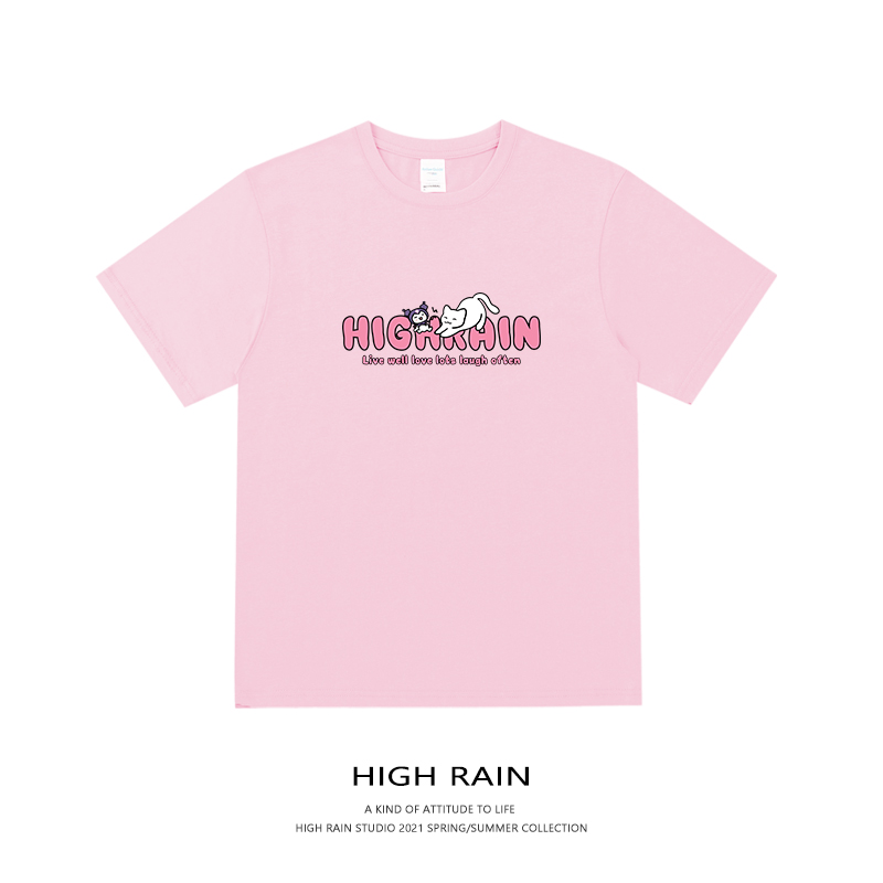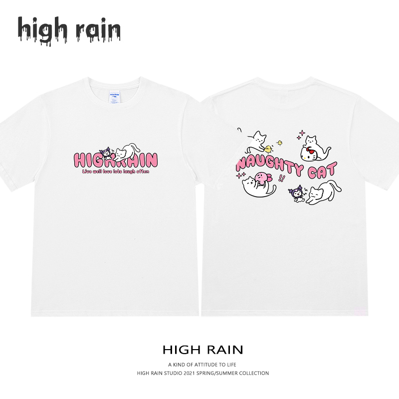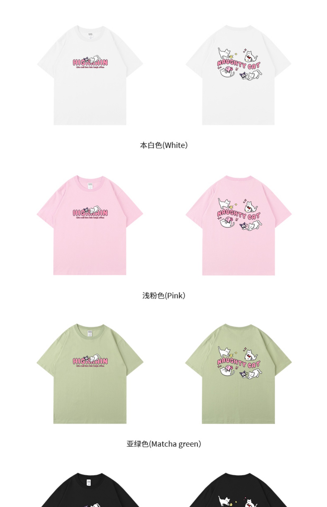 很潤工作室 潮牌夏季卡通貓咪印花短袖T恤男女甜美寬鬆情侶T恤