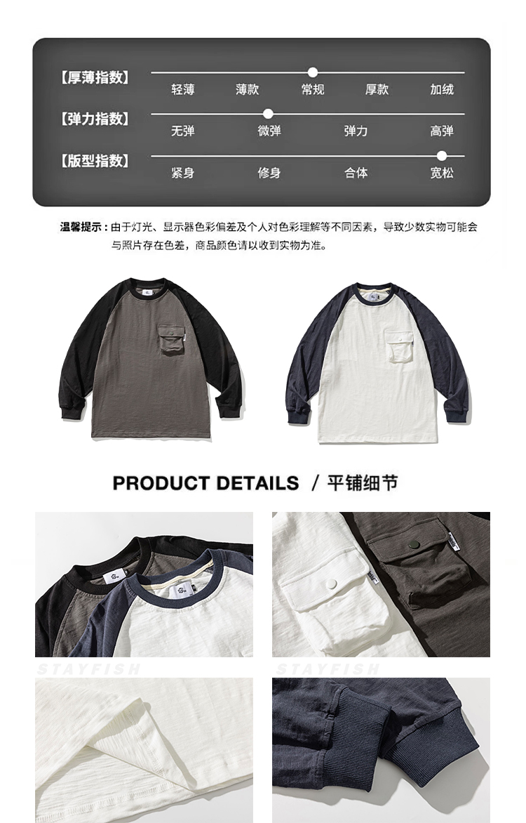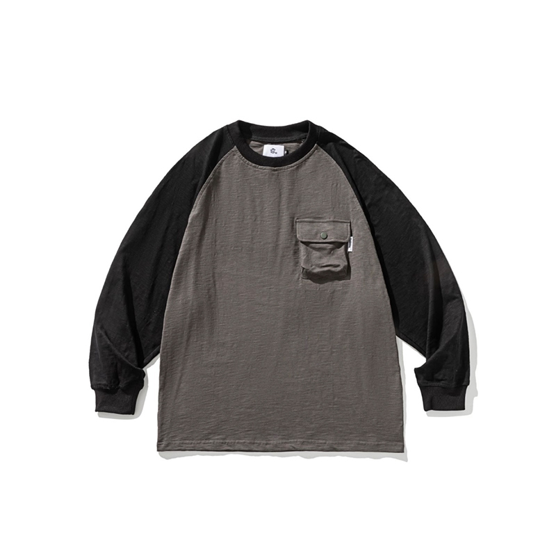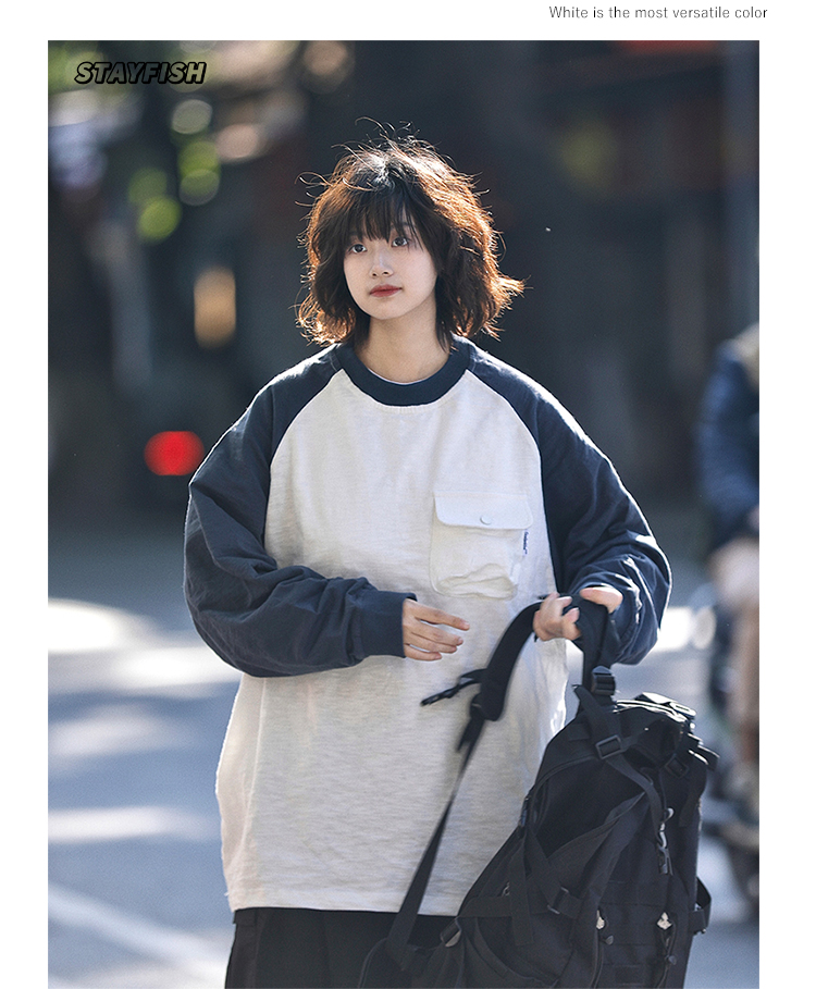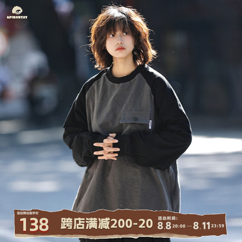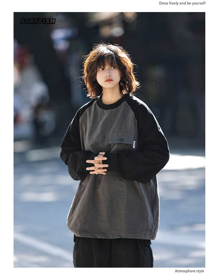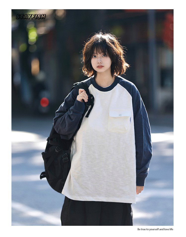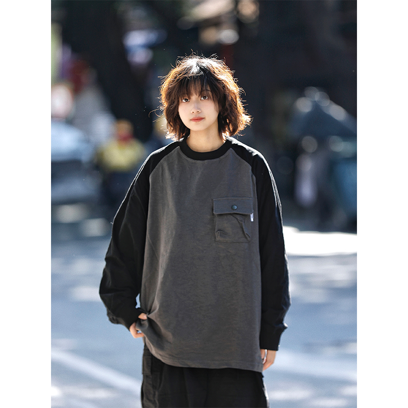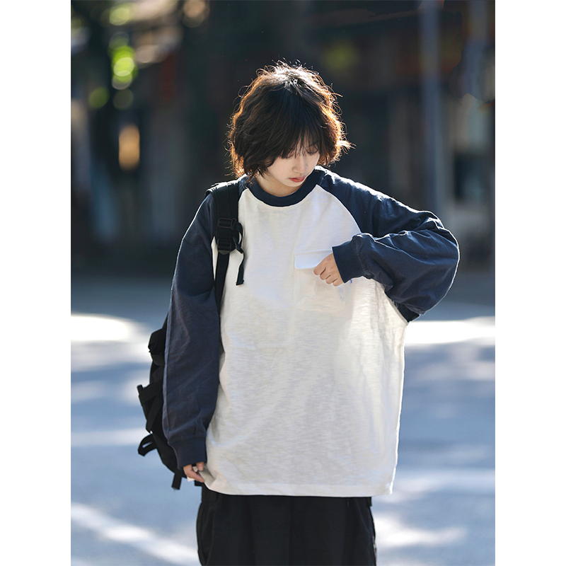 阿於呆日系拼色插肩袖T恤打底 男女簡約設計口袋休閒拼接長袖上衣