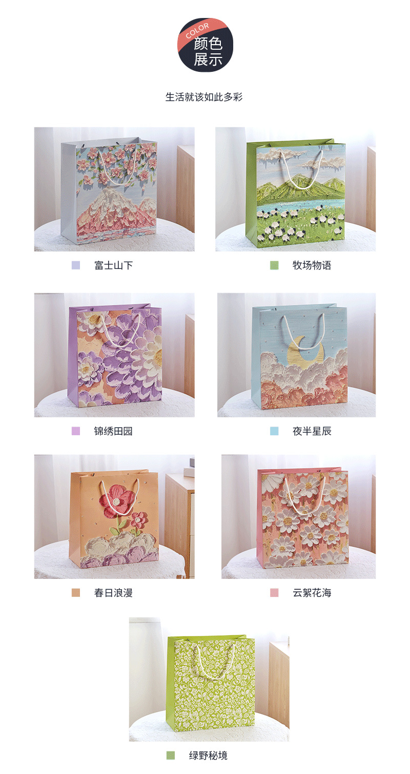 型号 富士山下,牧场物语,锦绣田园,夜半星辰,春日烂漫,云絮花海,柿柿如意(礼盒款),日进斗金(礼盒款),平安喜乐(礼盒款),蝴蝶兰,条纹爱心,至少见面上万次,礼物礼袋,生日快乐