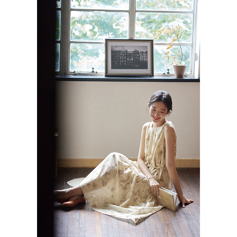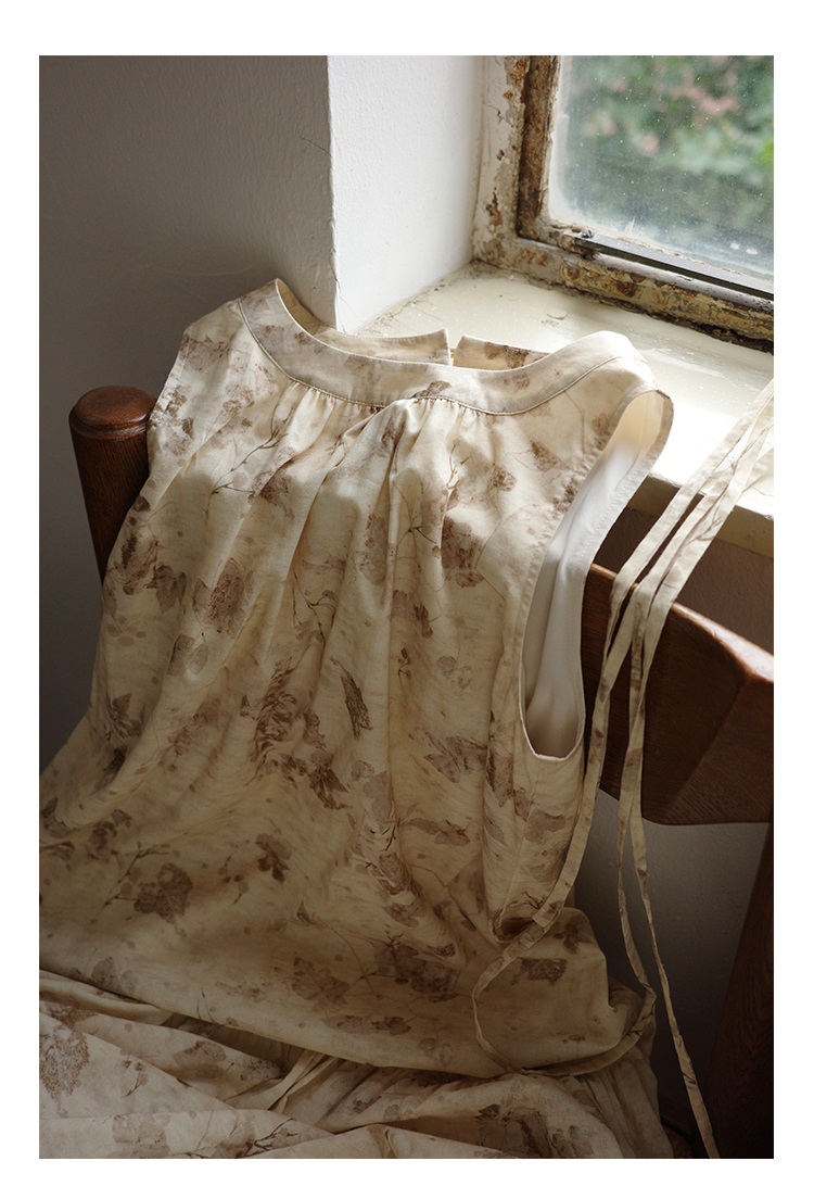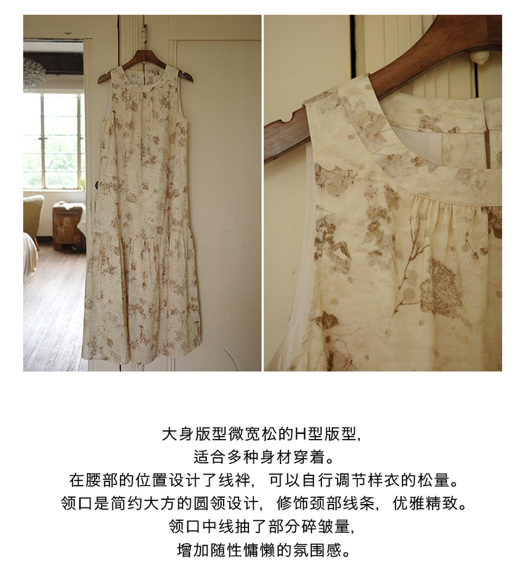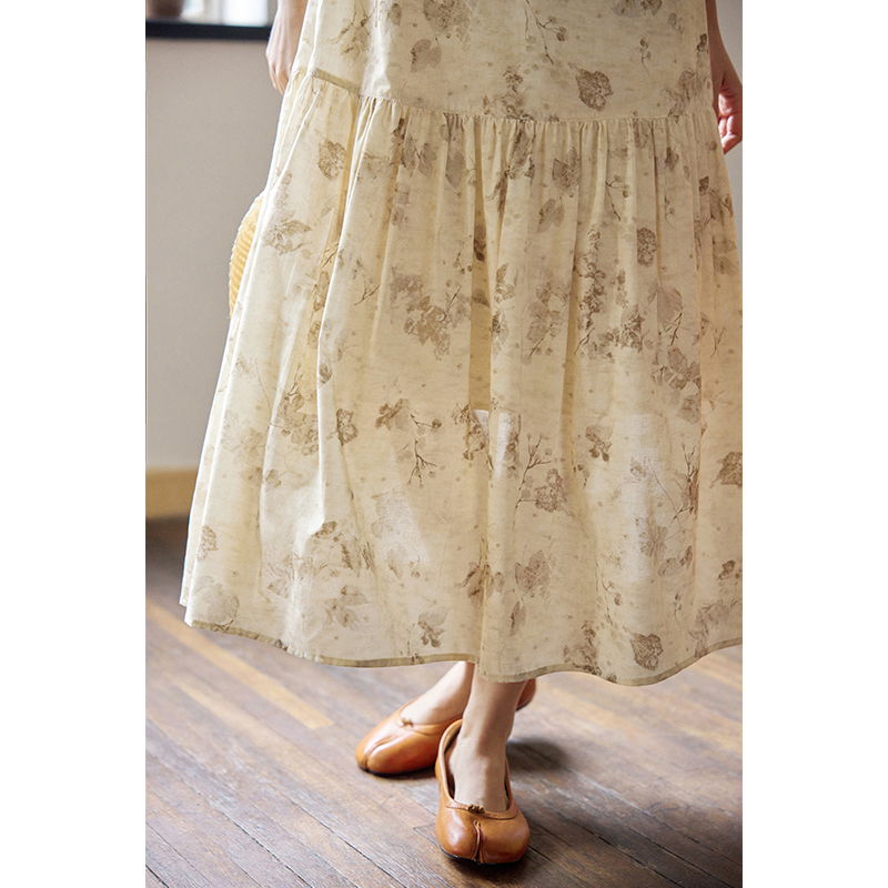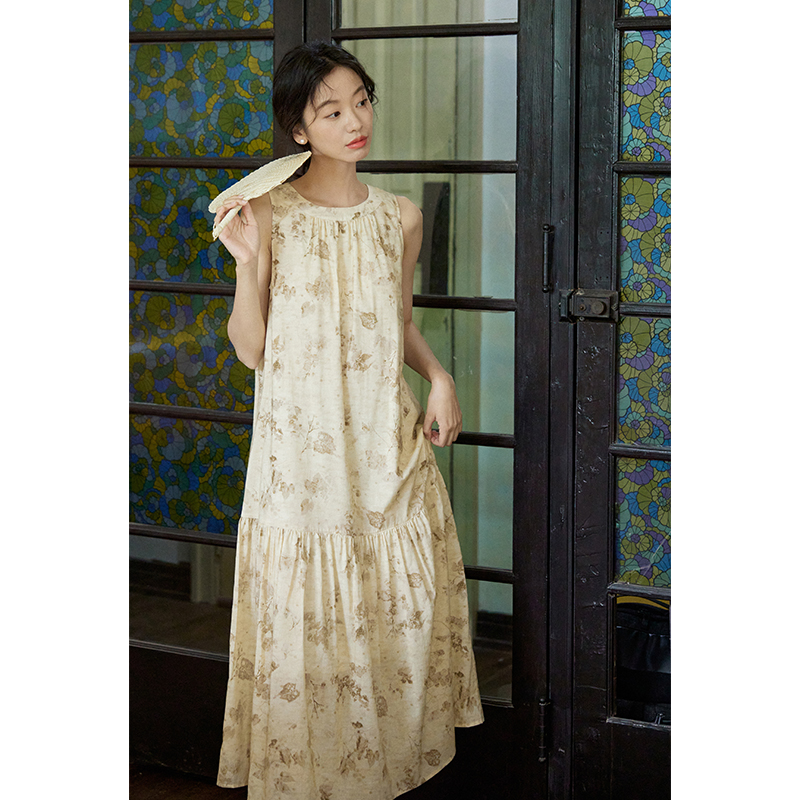 【限時88折】樹葉印花棉質吊帶洋裝女夏2023新款復古無袖中長裙