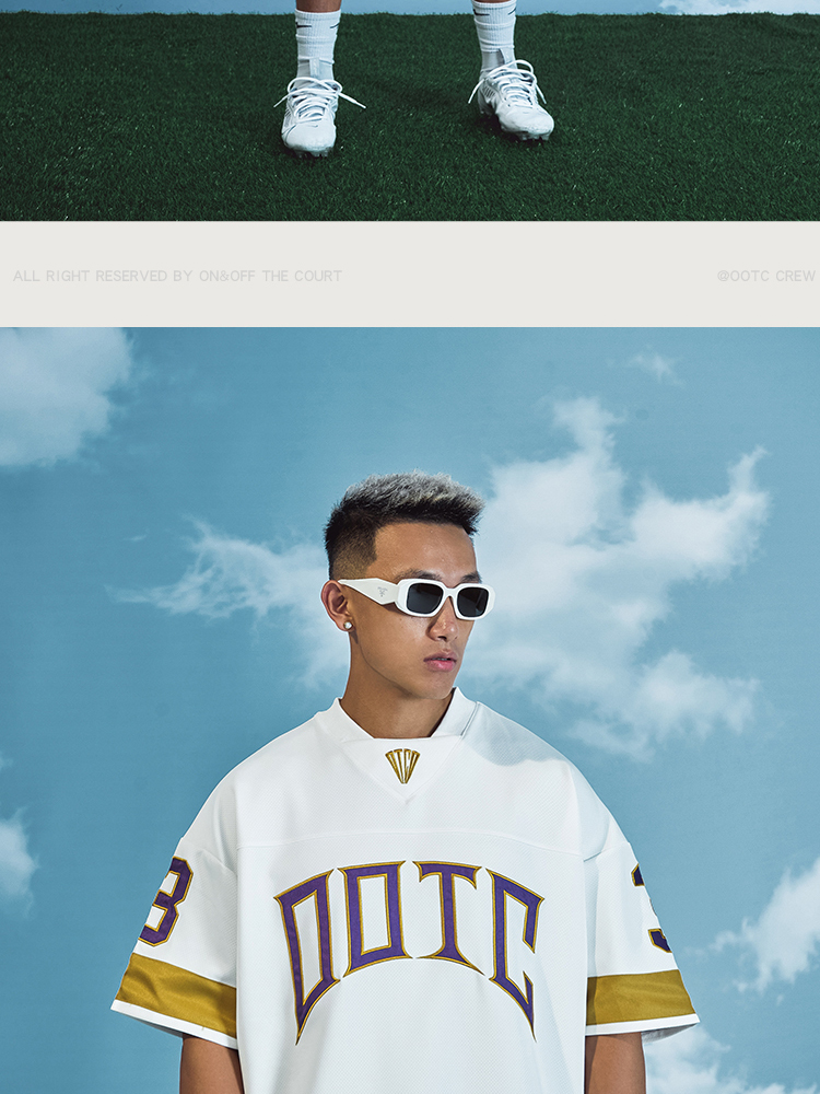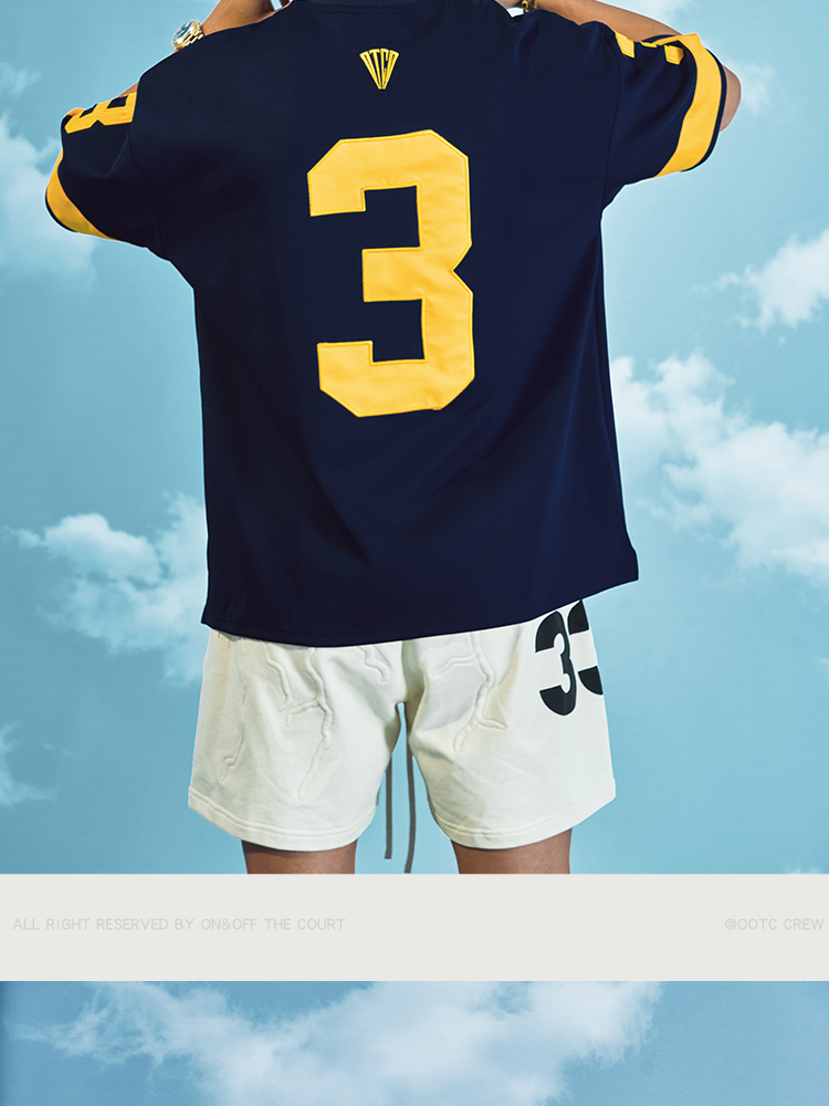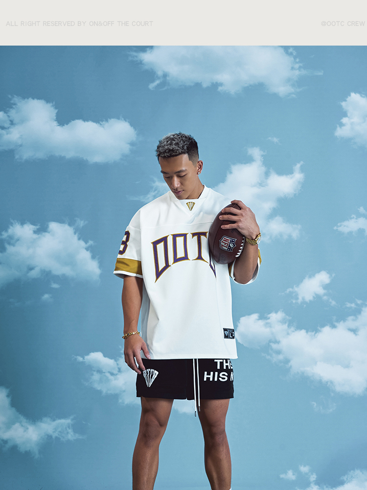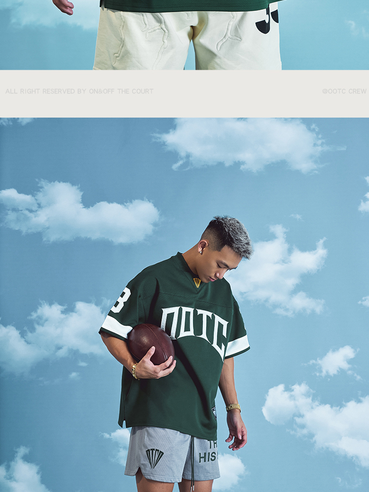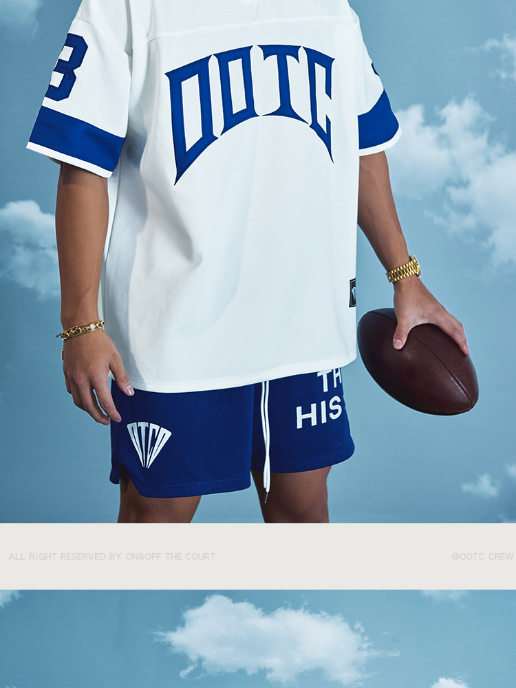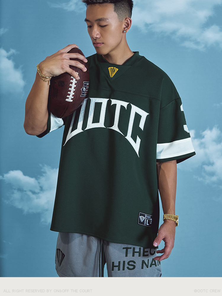 OOTC重磅美式復古街頭運動寬鬆網眼布貼繡橄欖球服短袖T恤男女ins