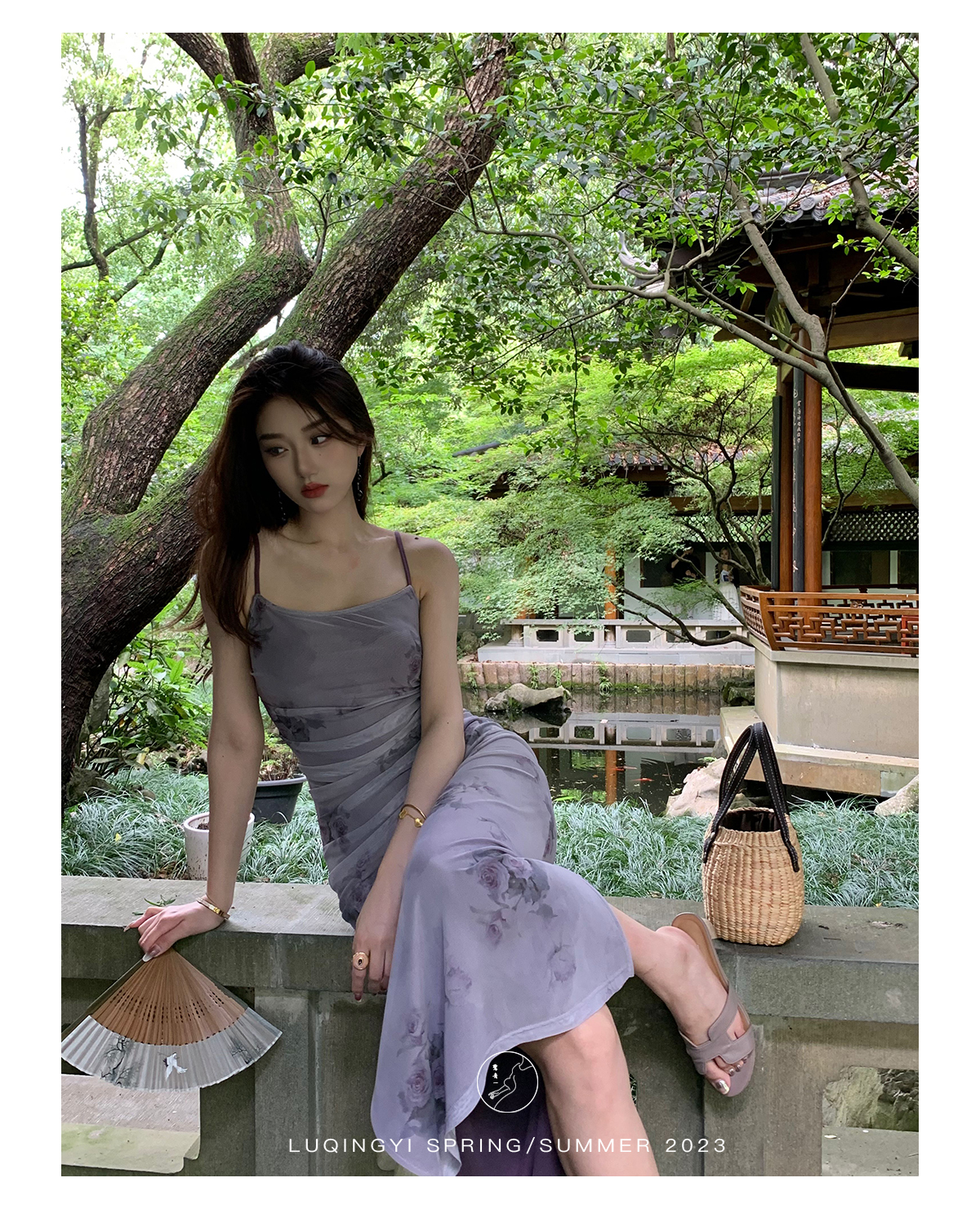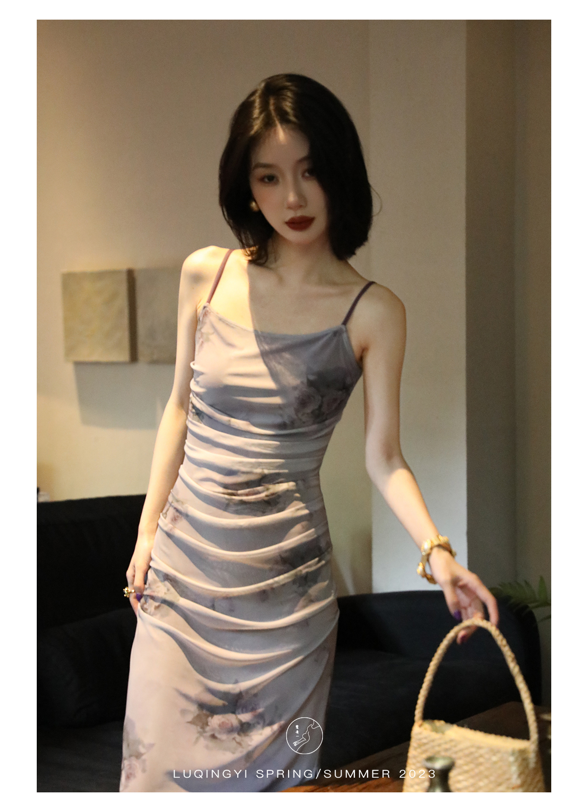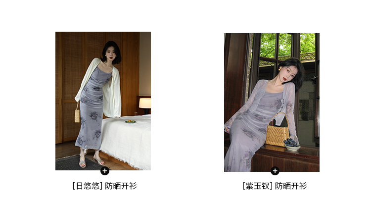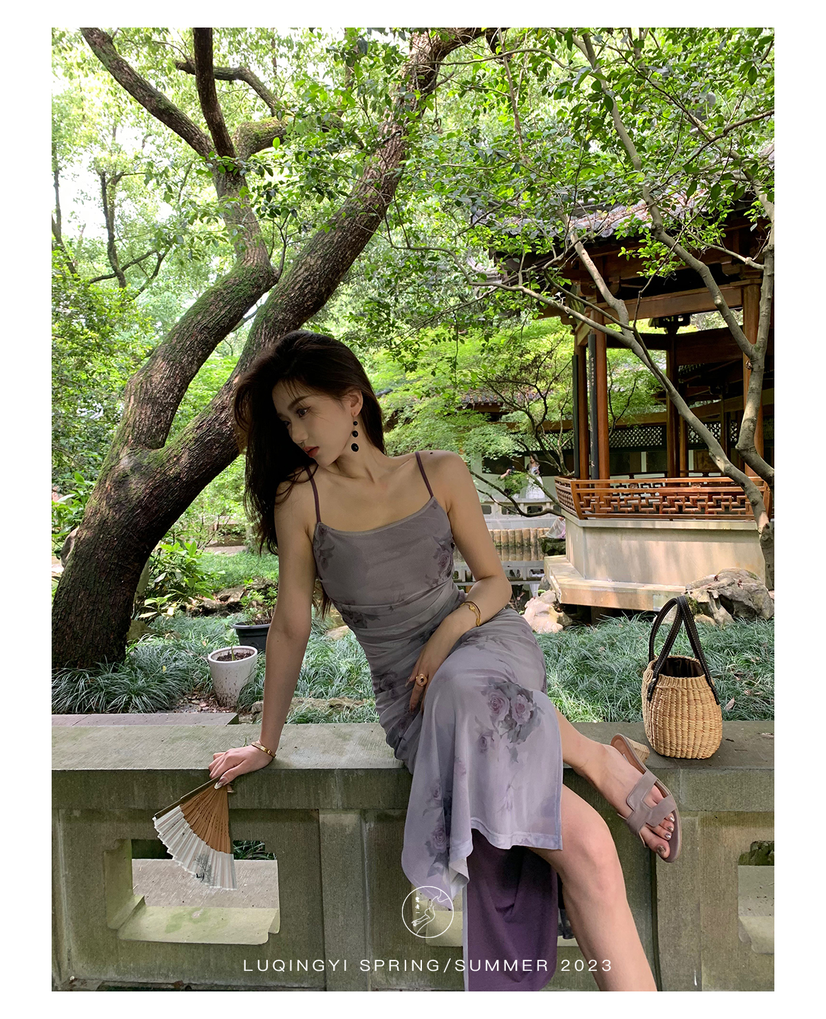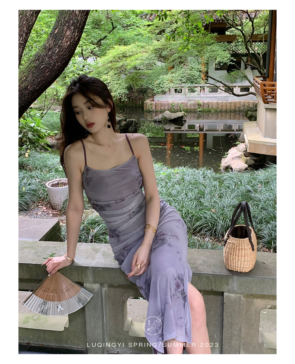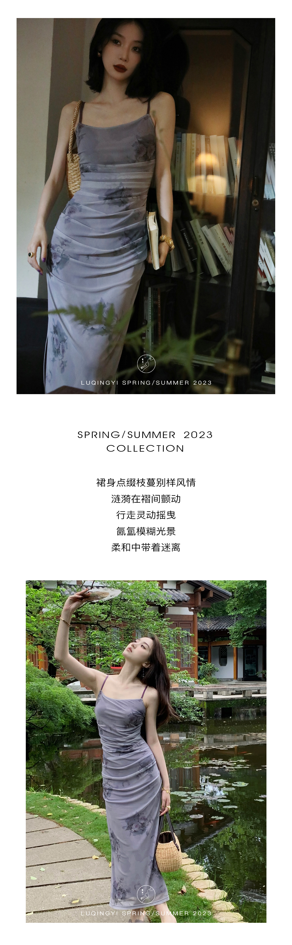 鷺青一【紫玉釵】玫瑰暈染吊帶裙女夏立體褶皺設計復古印花洋裝