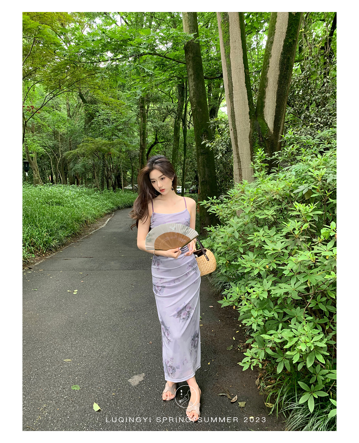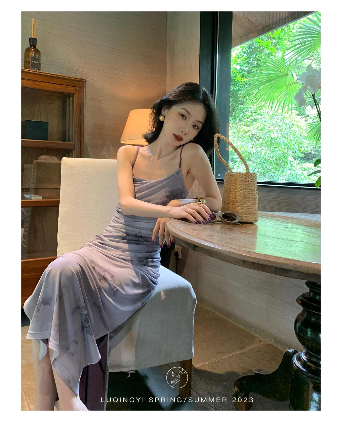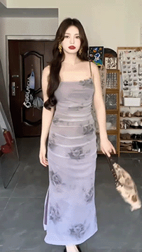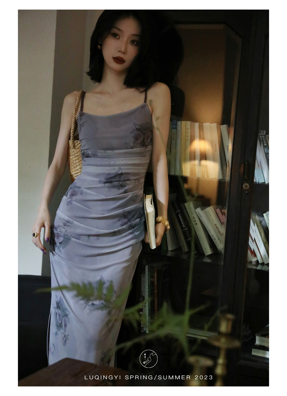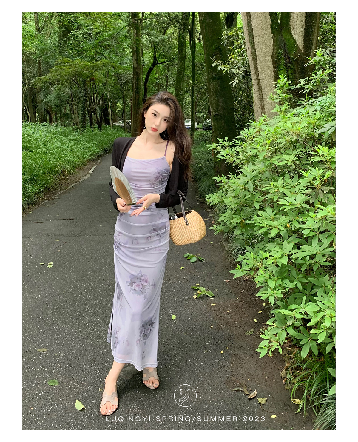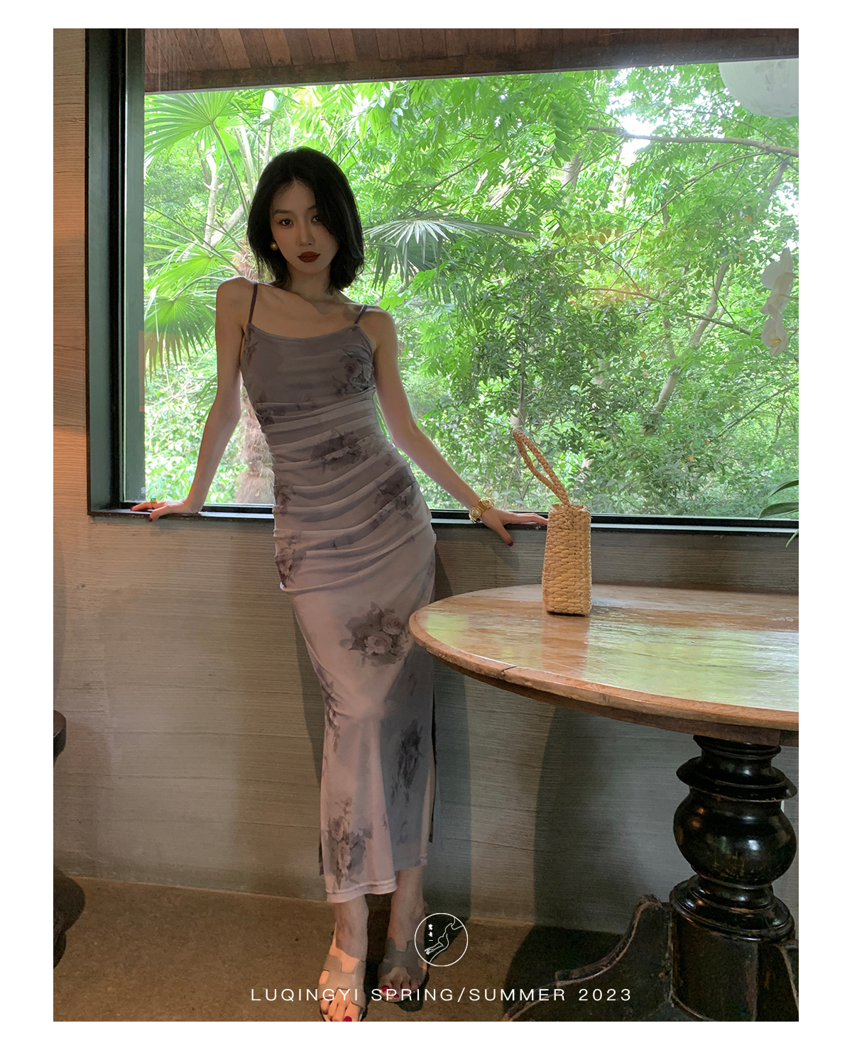 鷺青一【紫玉釵】玫瑰暈染吊帶裙女夏立體褶皺設計復古印花洋裝