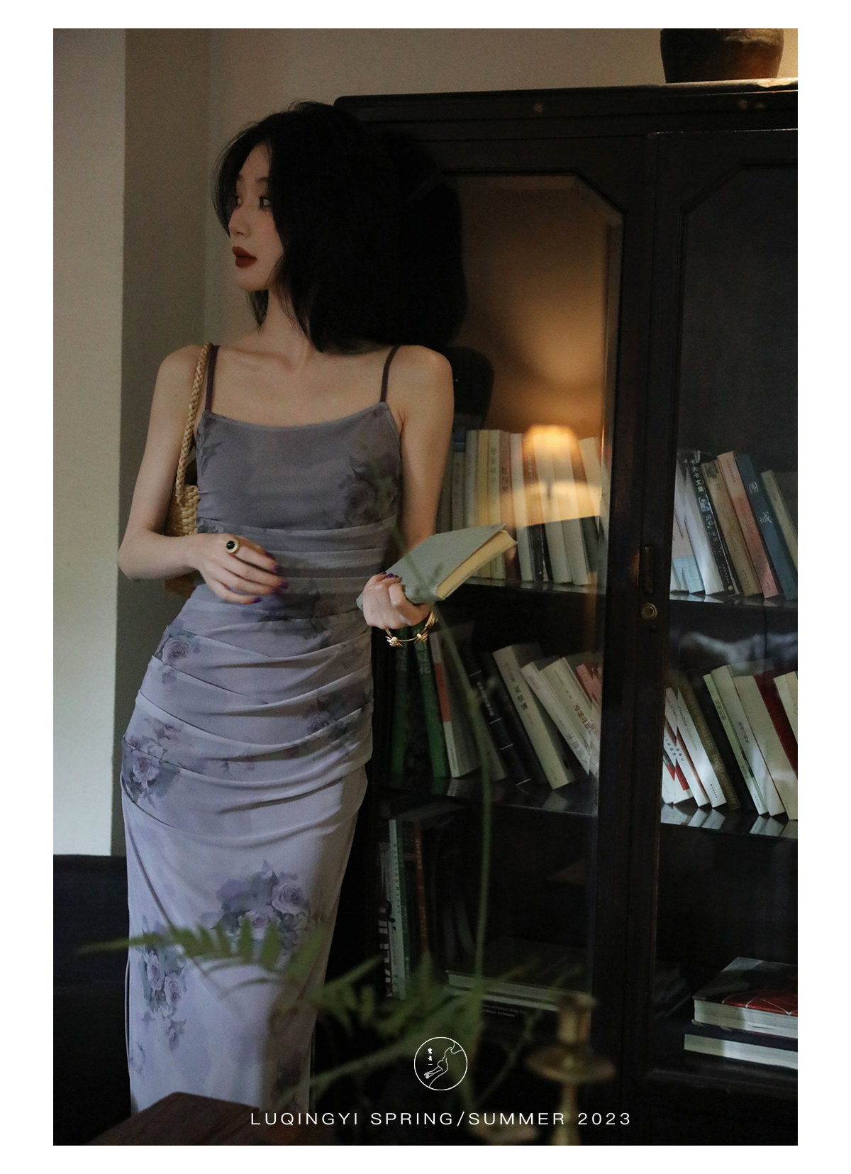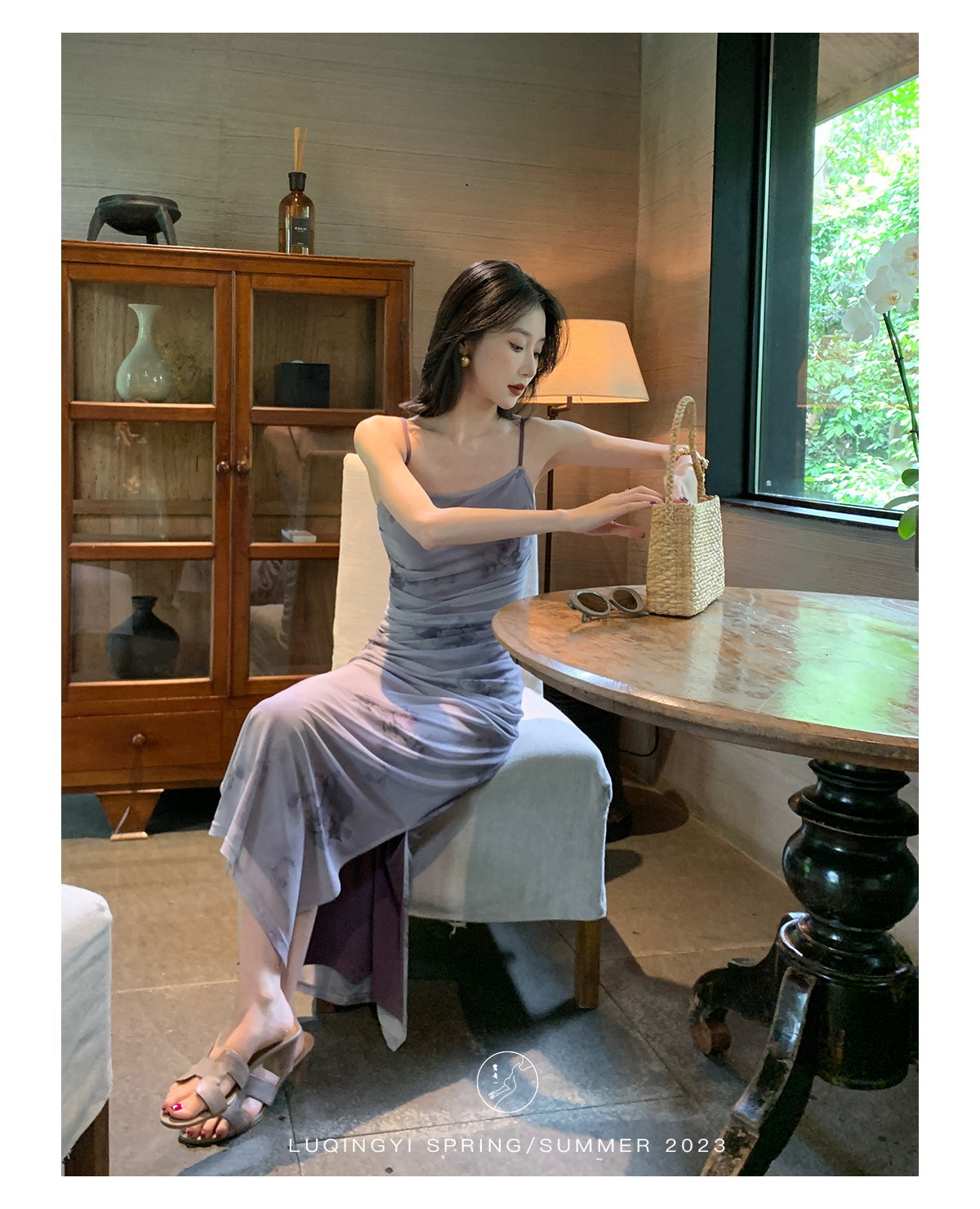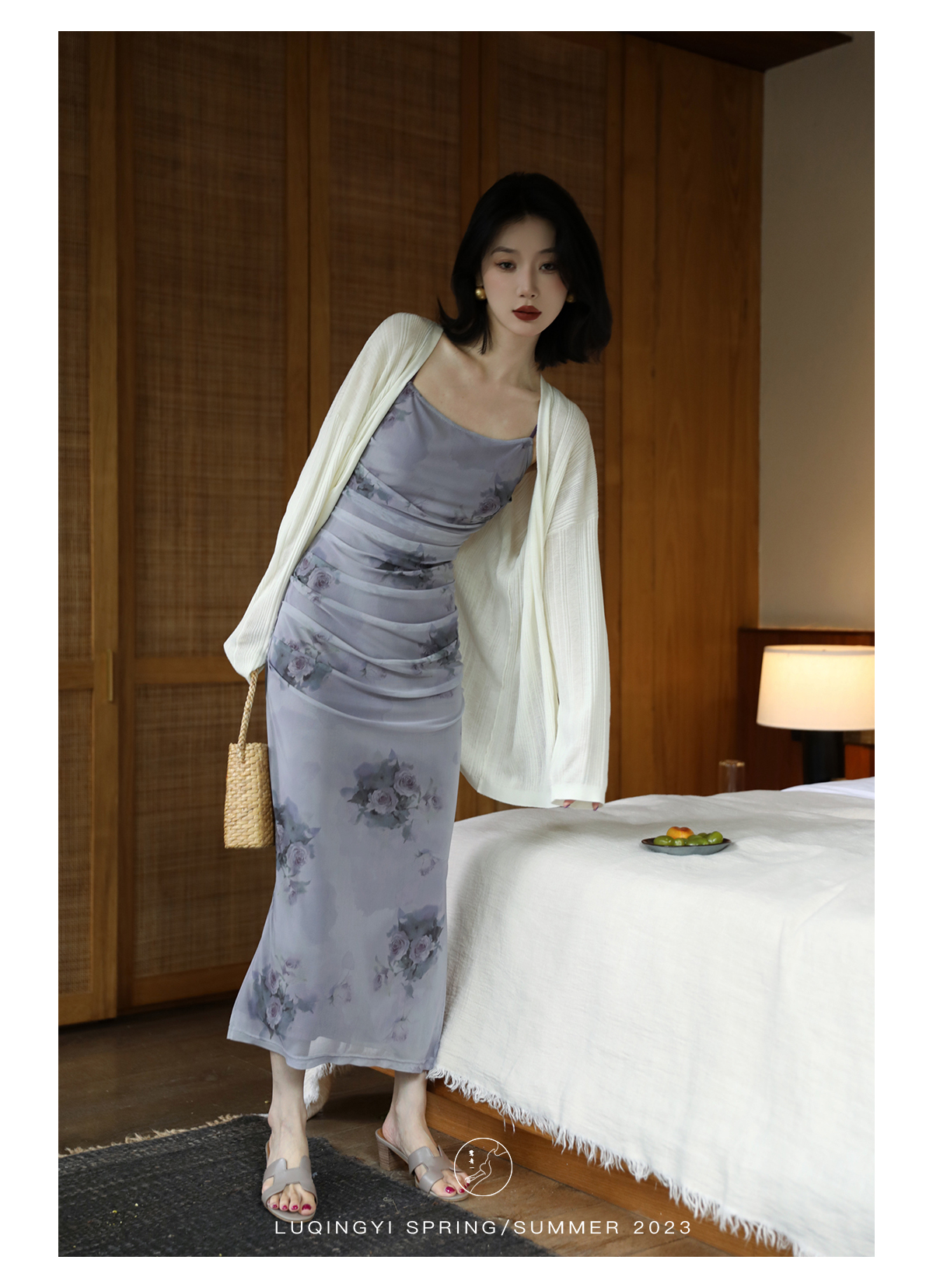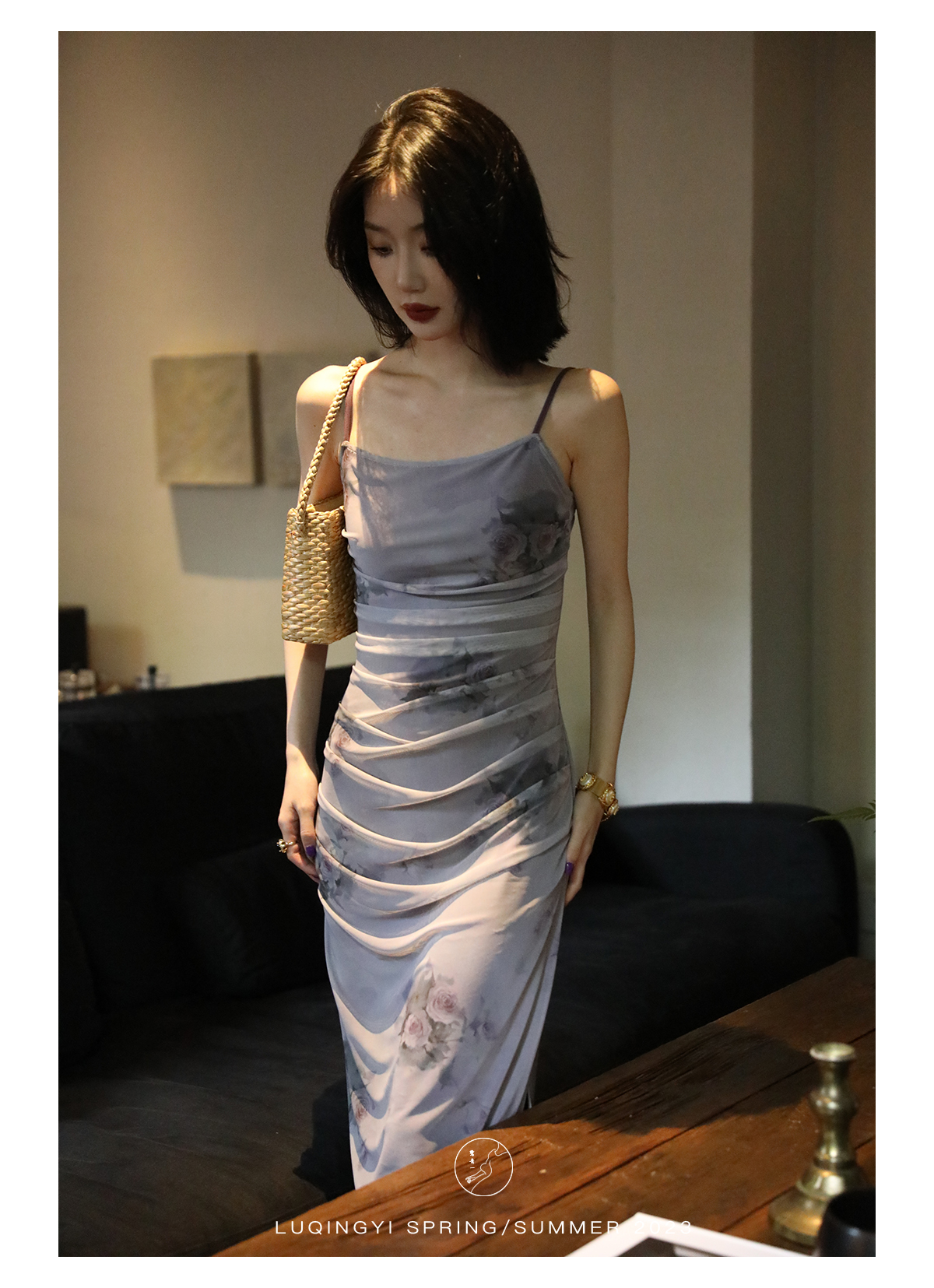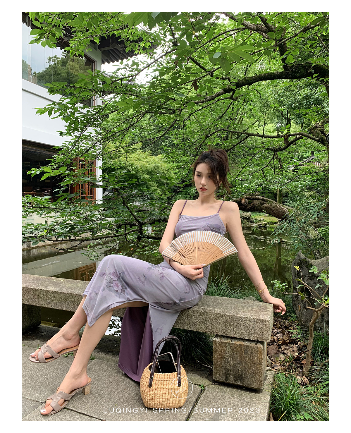 鷺青一【紫玉釵】玫瑰暈染吊帶裙女夏立體褶皺設計復古印花洋裝