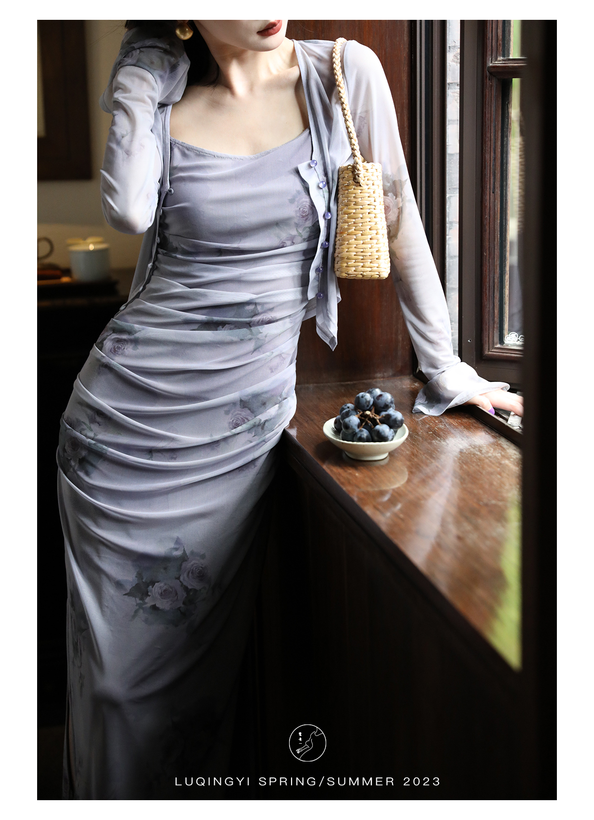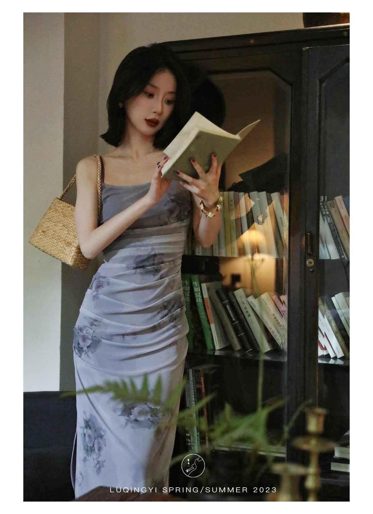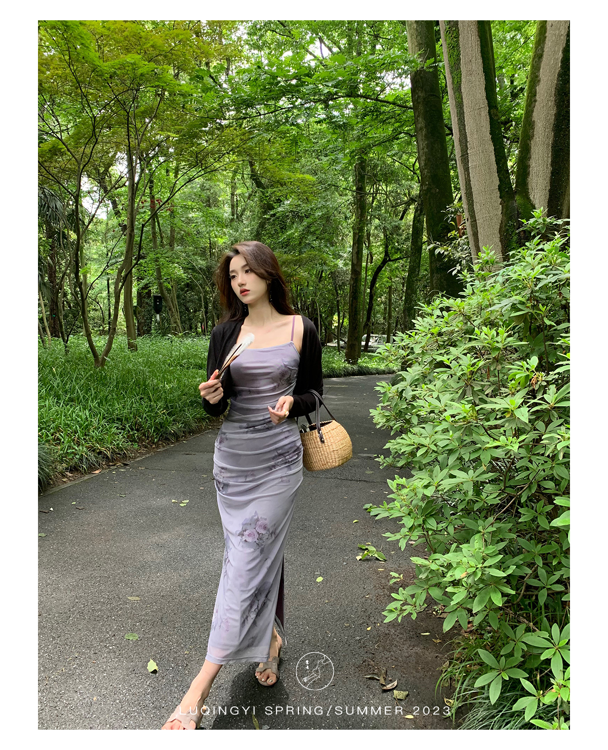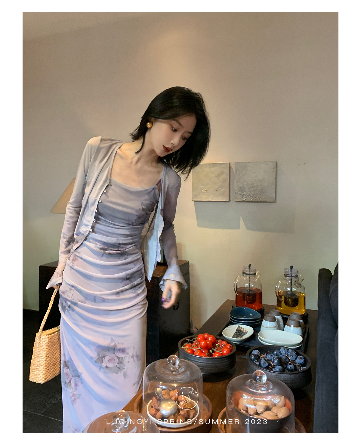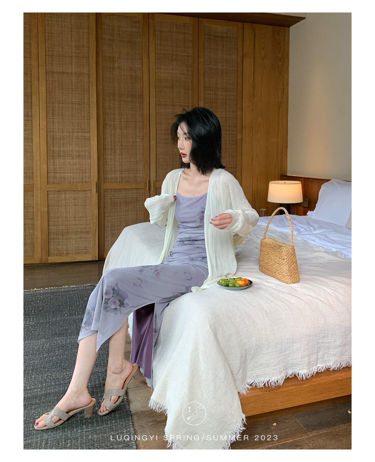 鷺青一【紫玉釵】玫瑰暈染吊帶裙女夏立體褶皺設計復古印花洋裝
