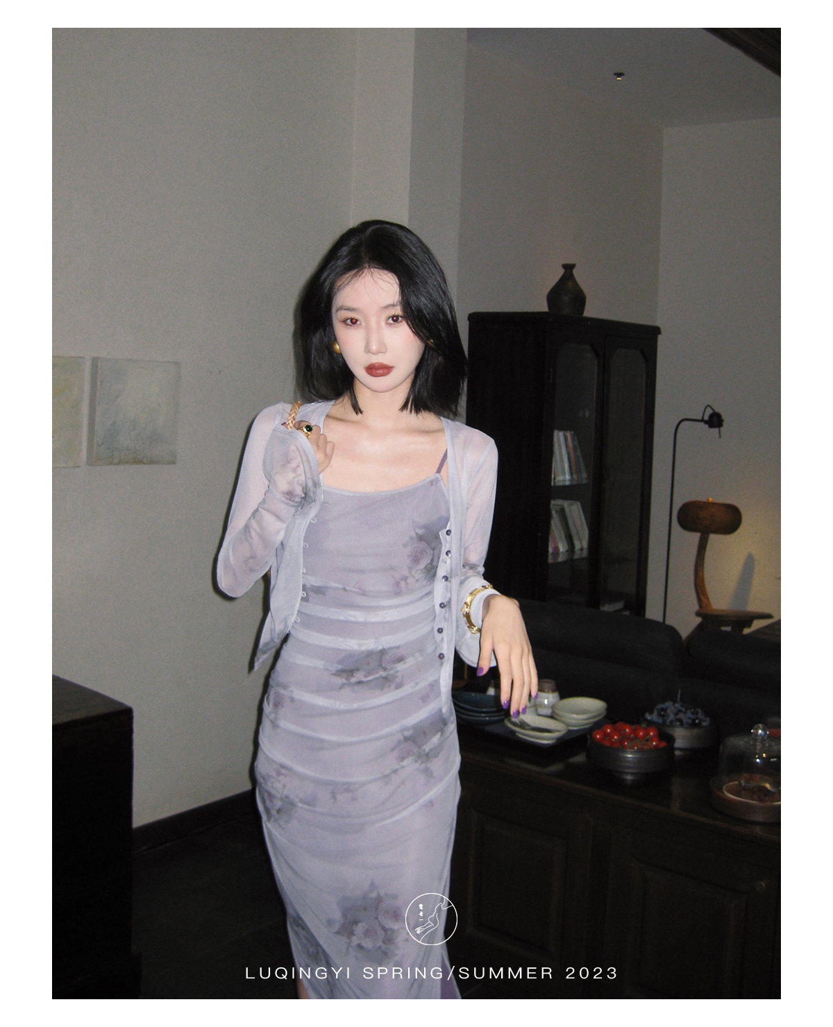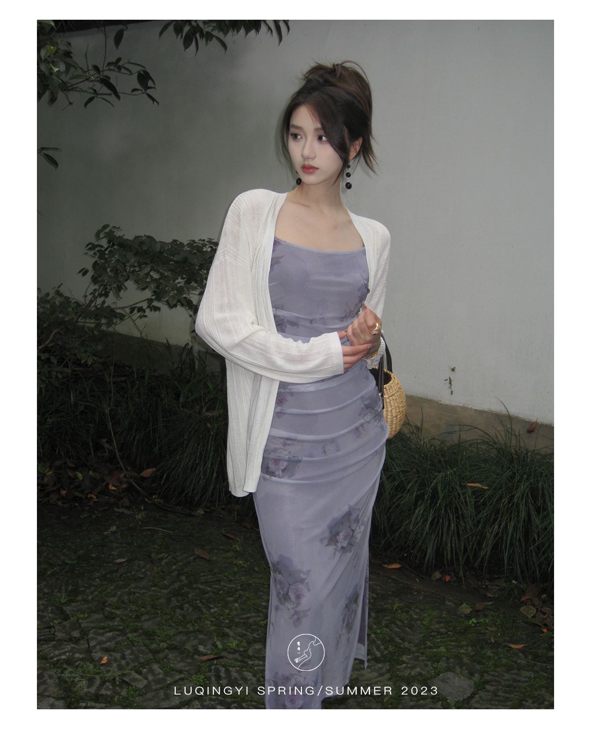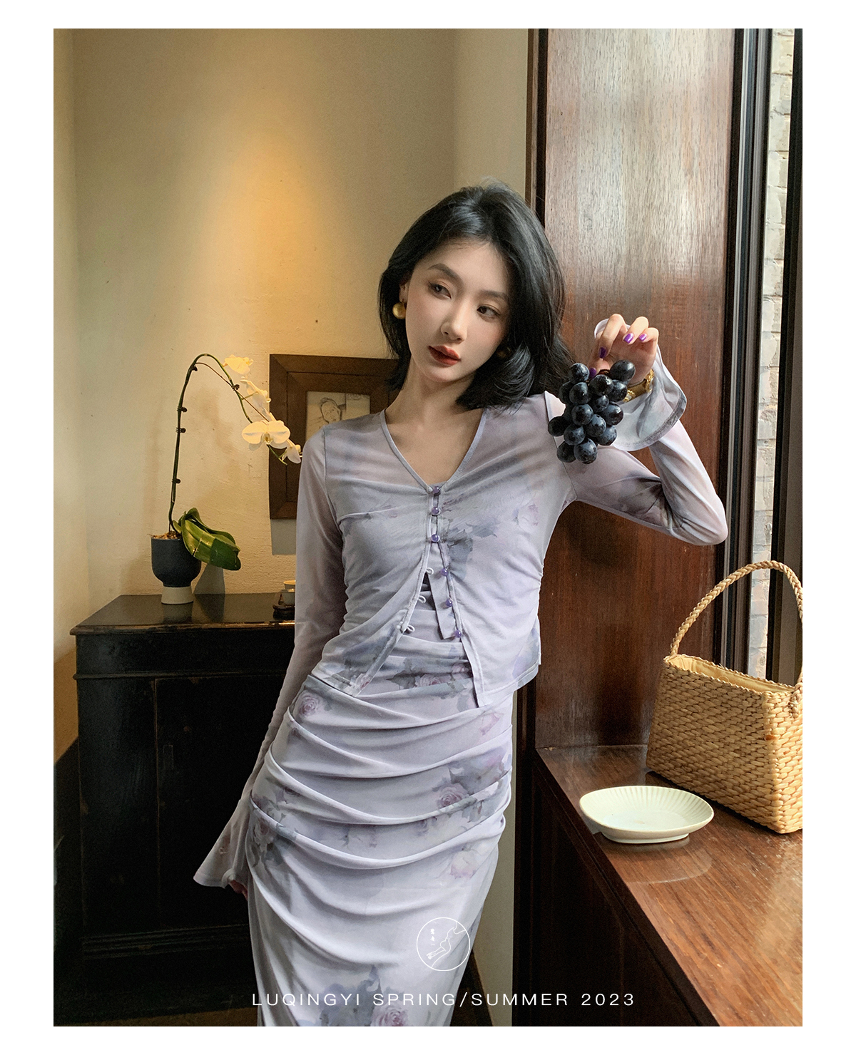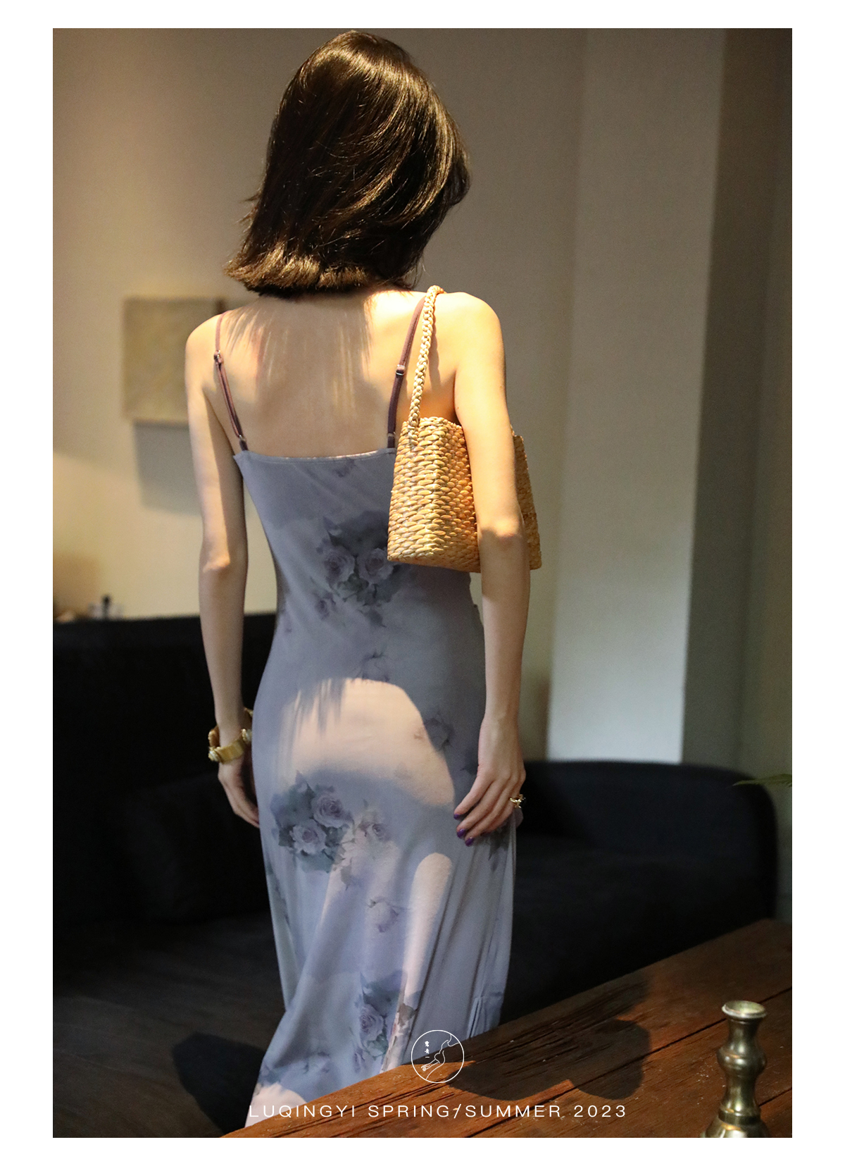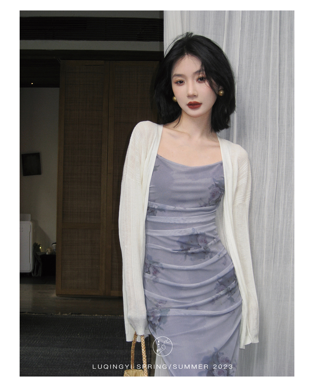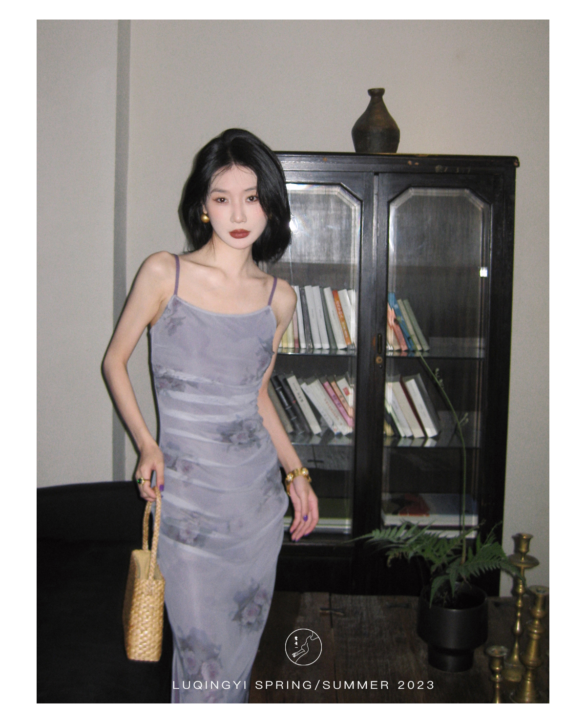 鷺青一【紫玉釵】玫瑰暈染吊帶裙女夏立體褶皺設計復古印花洋裝