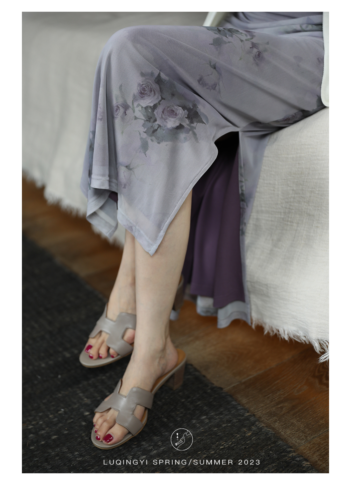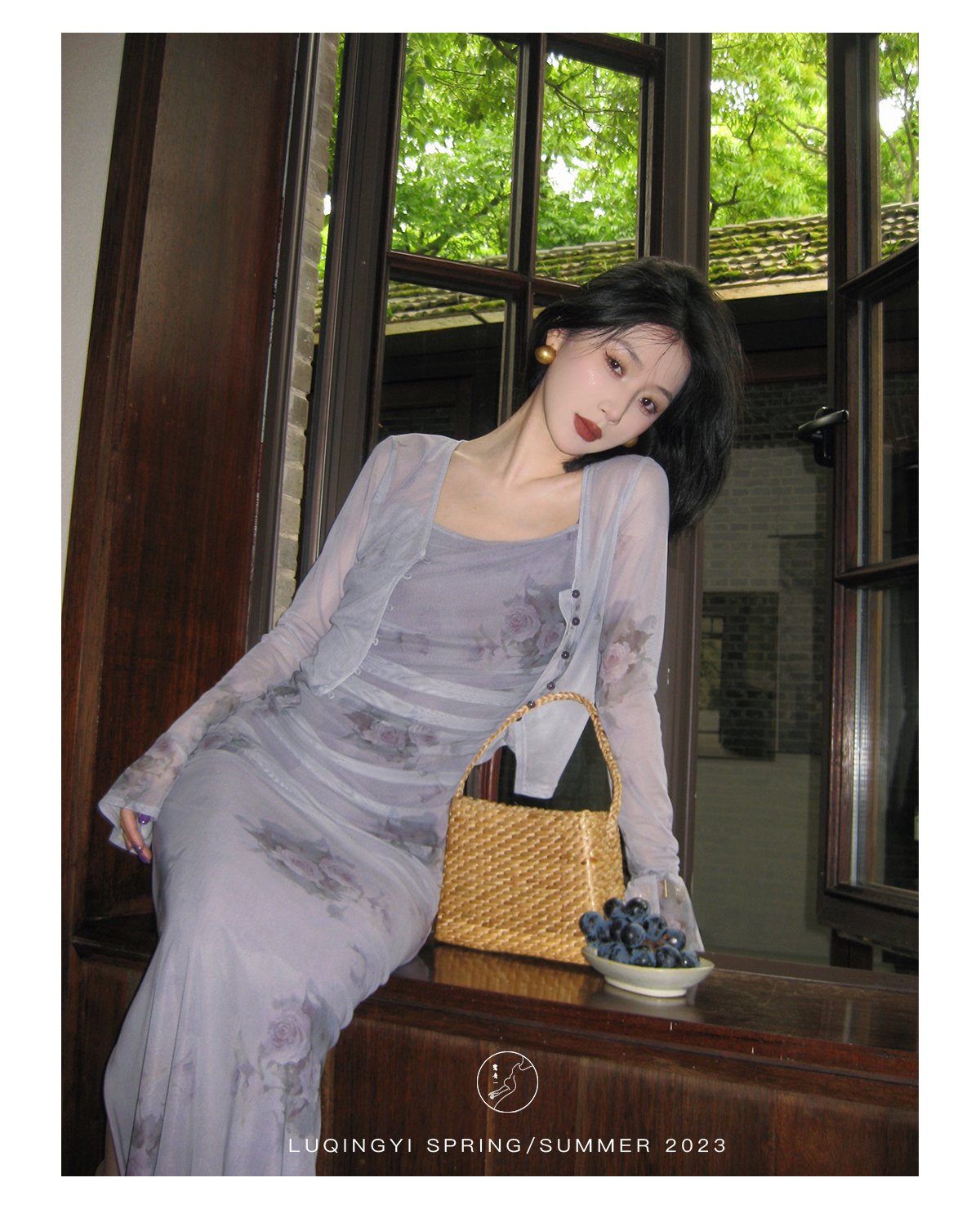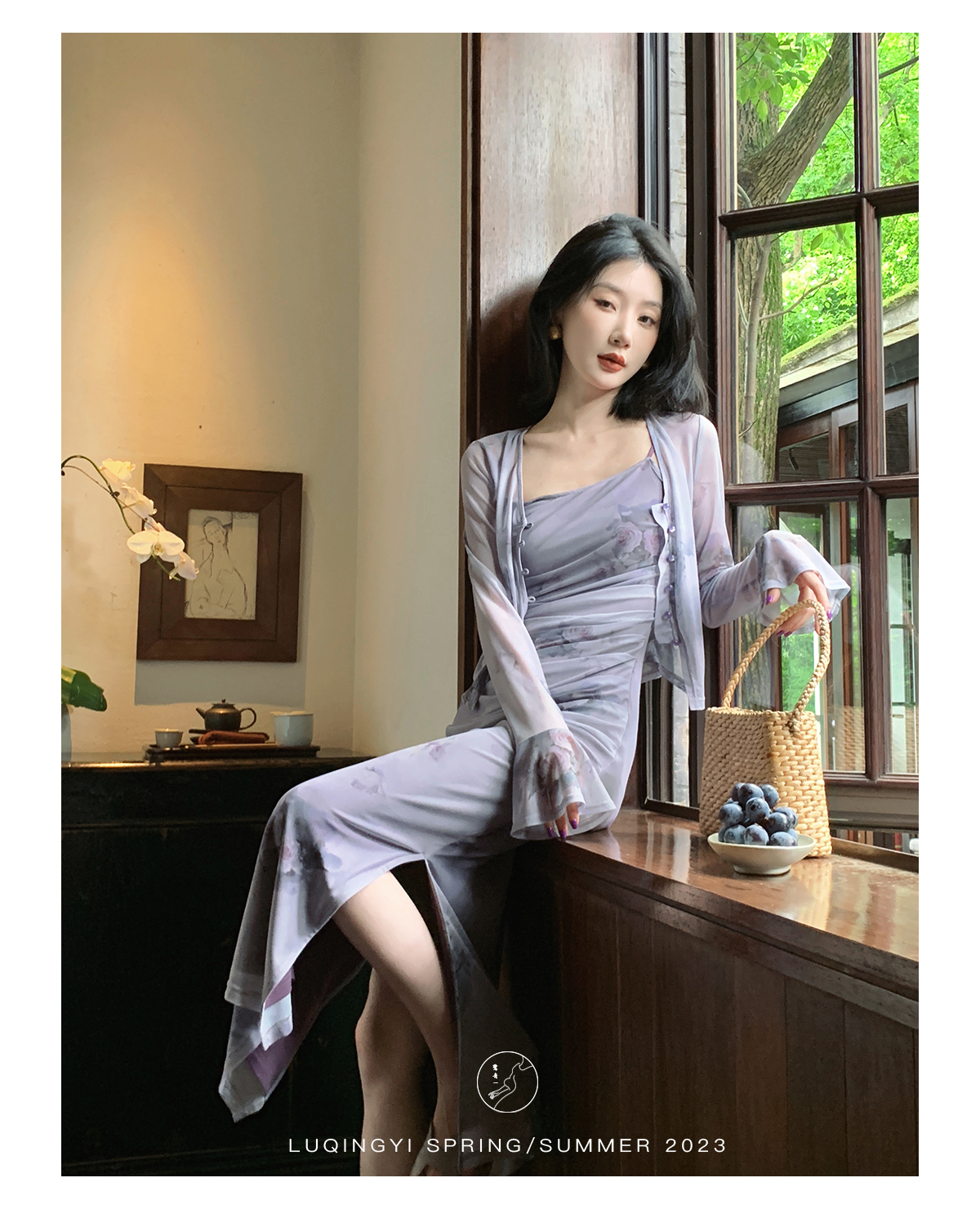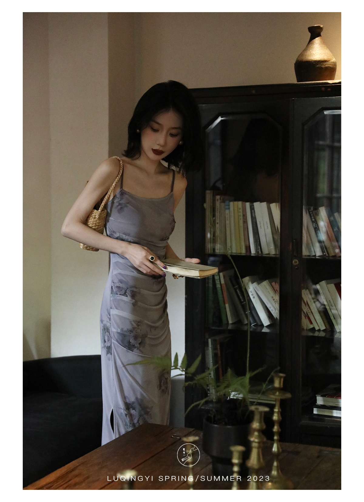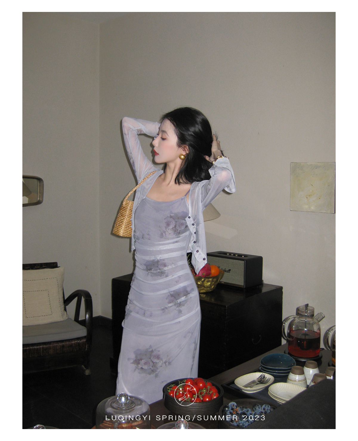 鷺青一【紫玉釵】玫瑰暈染吊帶裙女夏立體褶皺設計復古印花洋裝