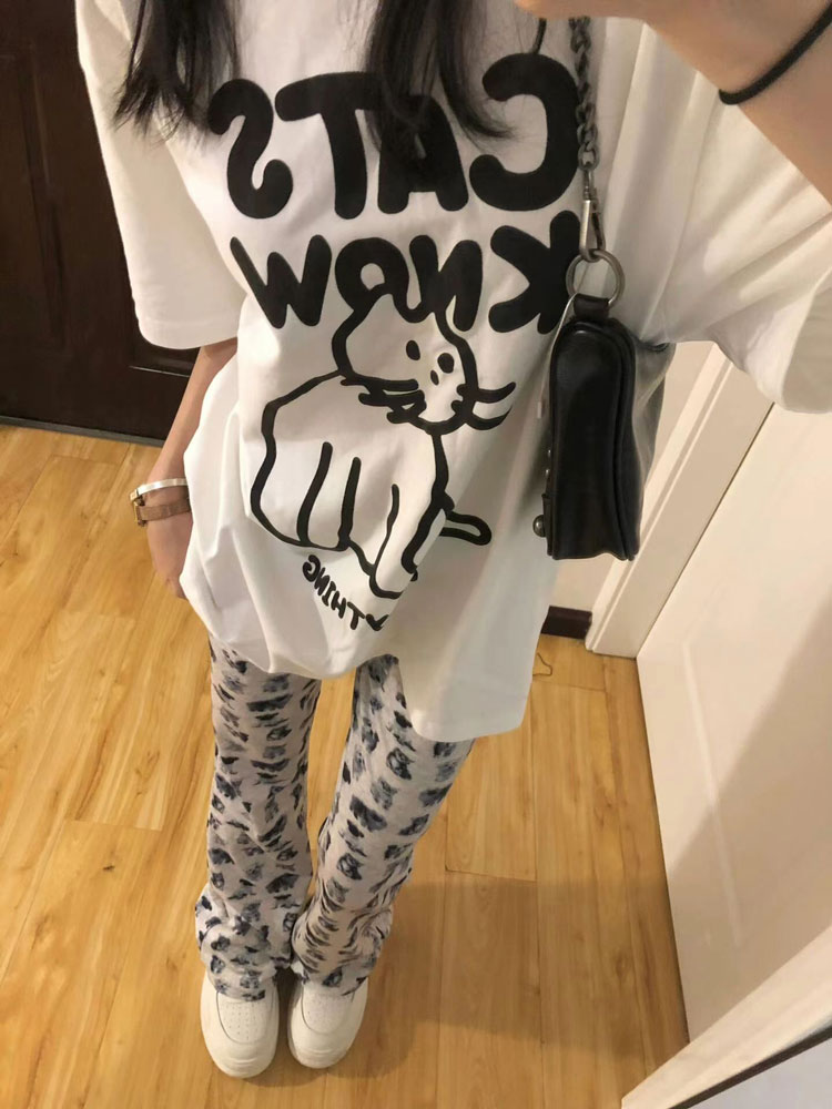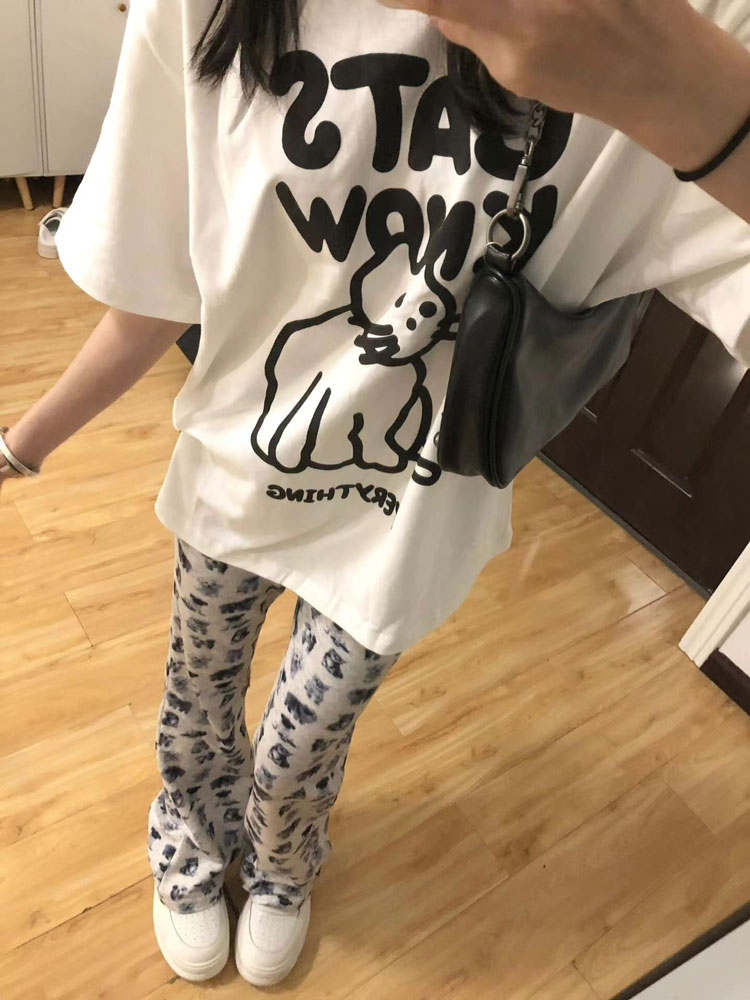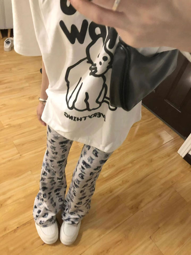 春秋小狗印花微喇叭褲女夏季2023新款休閒褲子高腰顯瘦修身馬蹄褲