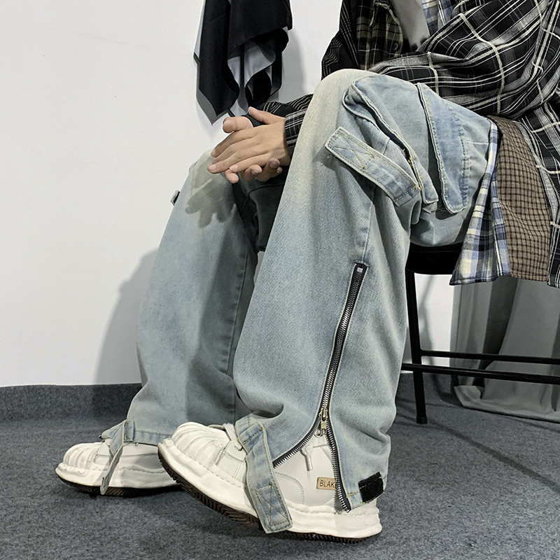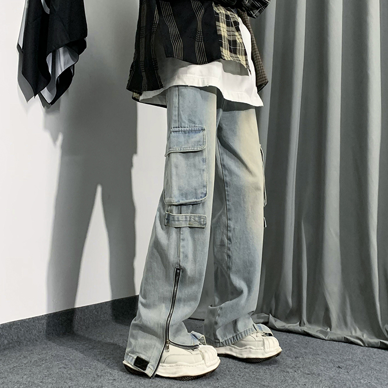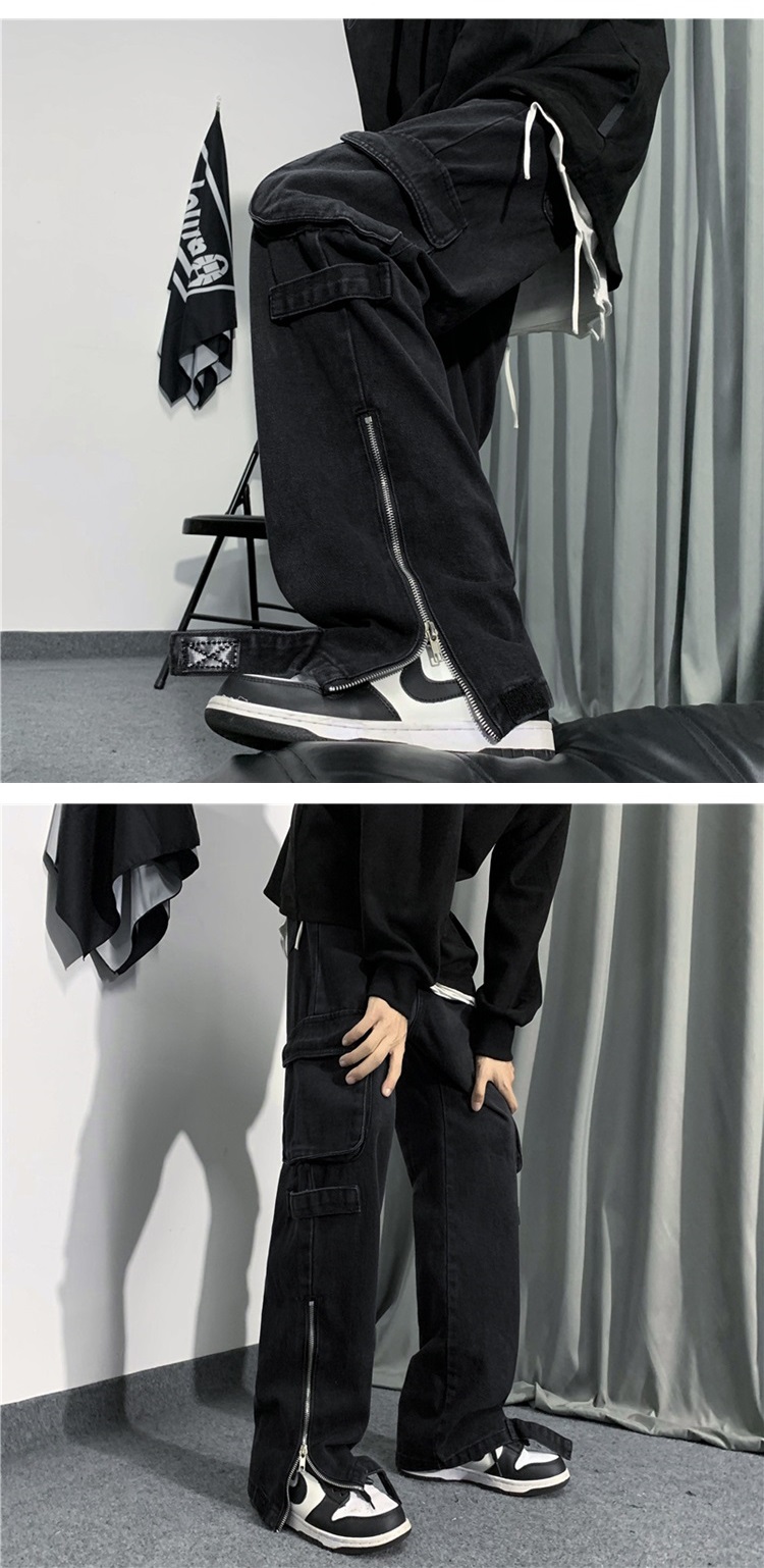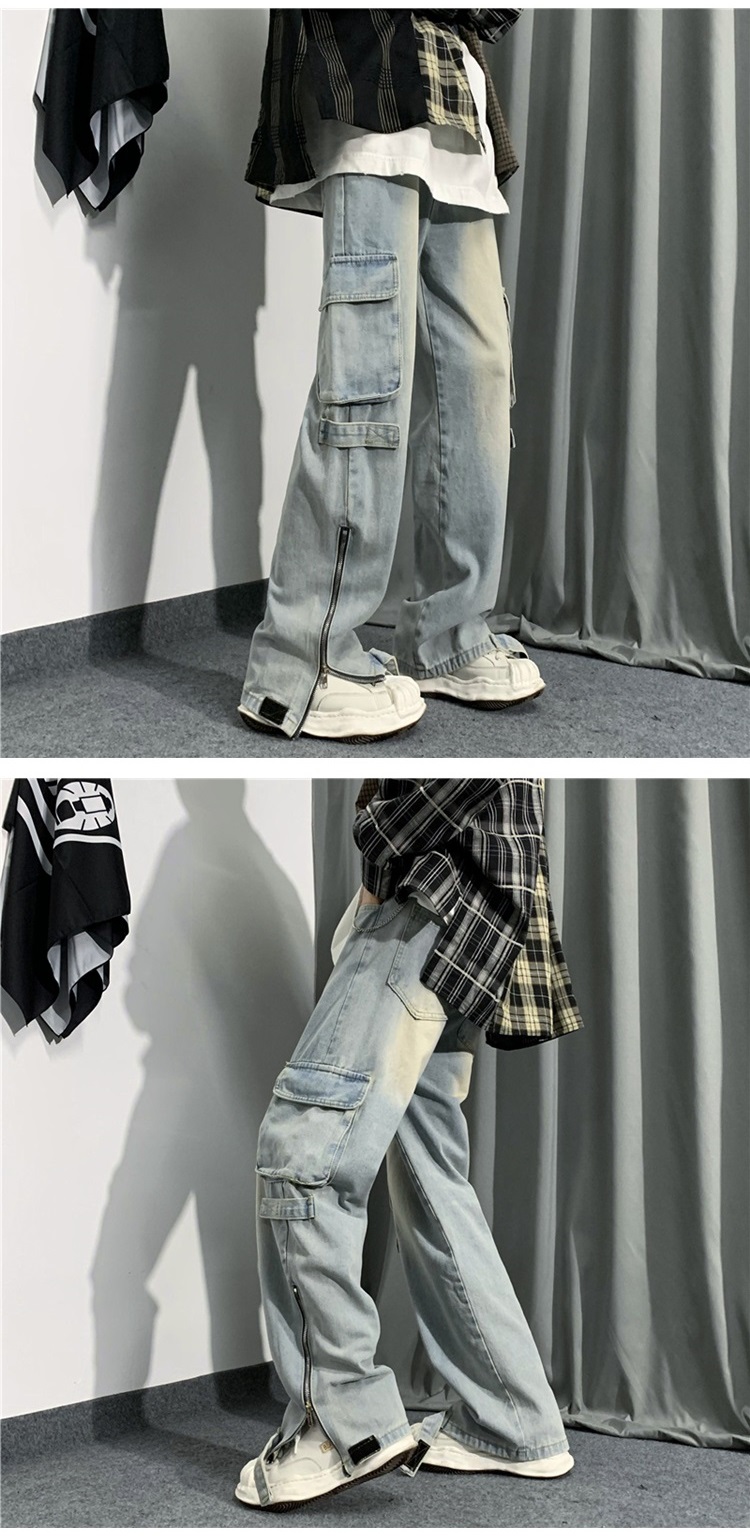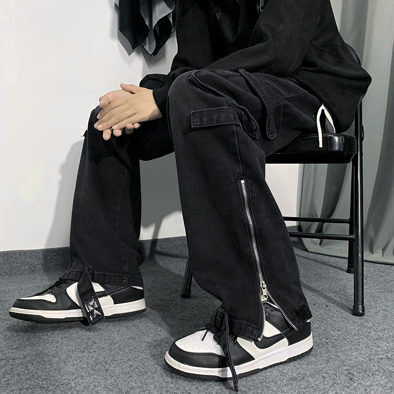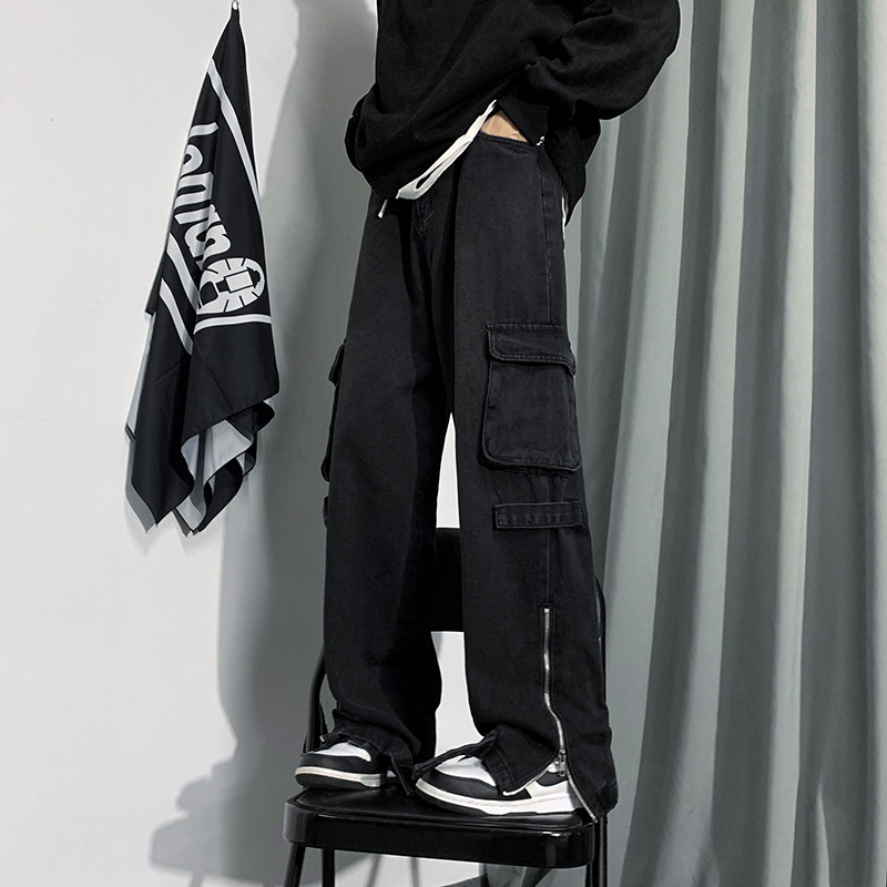 美式hiphop工裝褲高街潮牌大口袋水洗牛仔褲直筒寬鬆褲腳拉鍊開叉