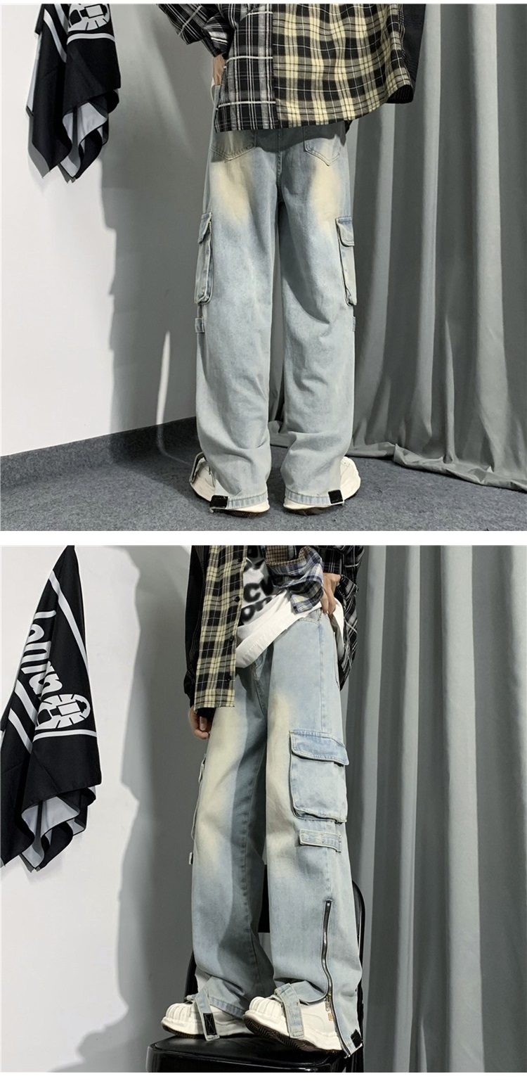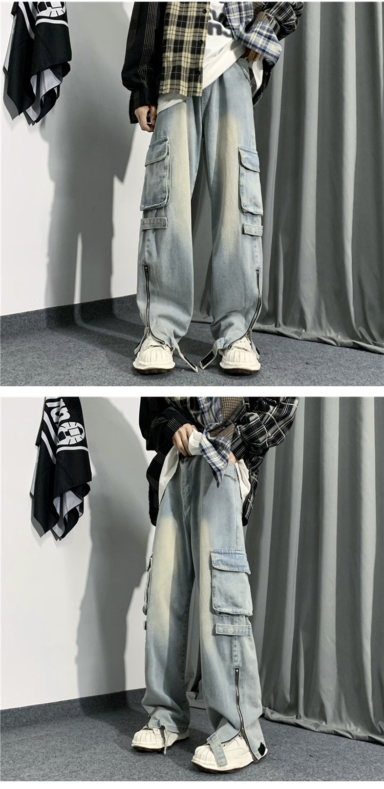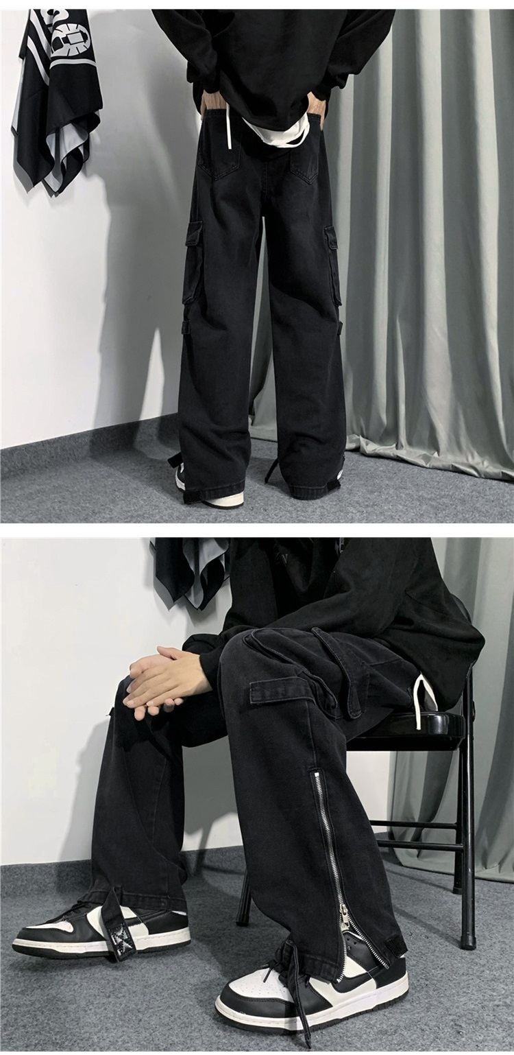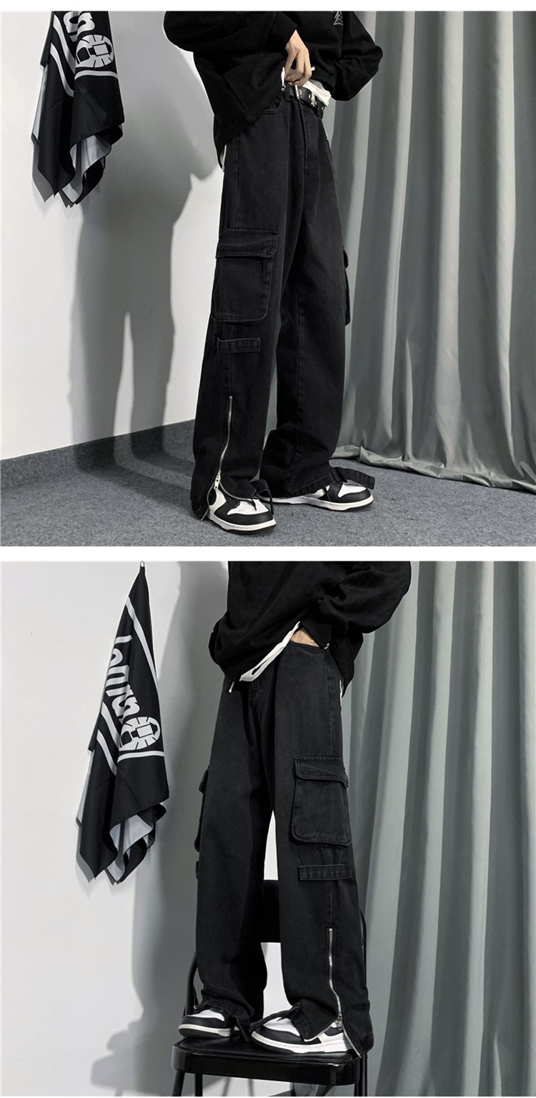 美式hiphop工裝褲高街潮牌大口袋水洗牛仔褲直筒寬鬆褲腳拉鍊開叉