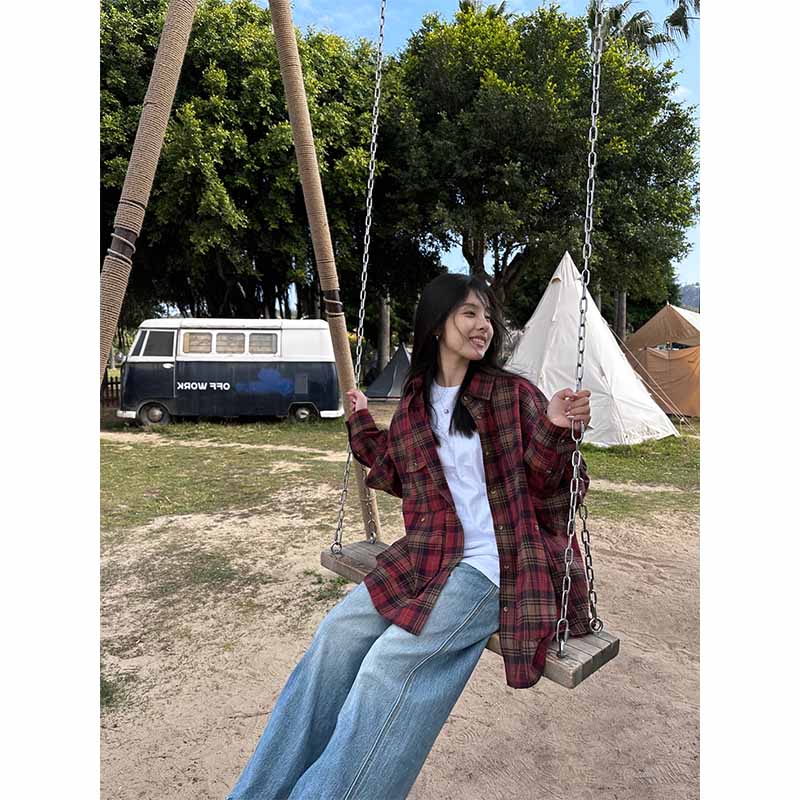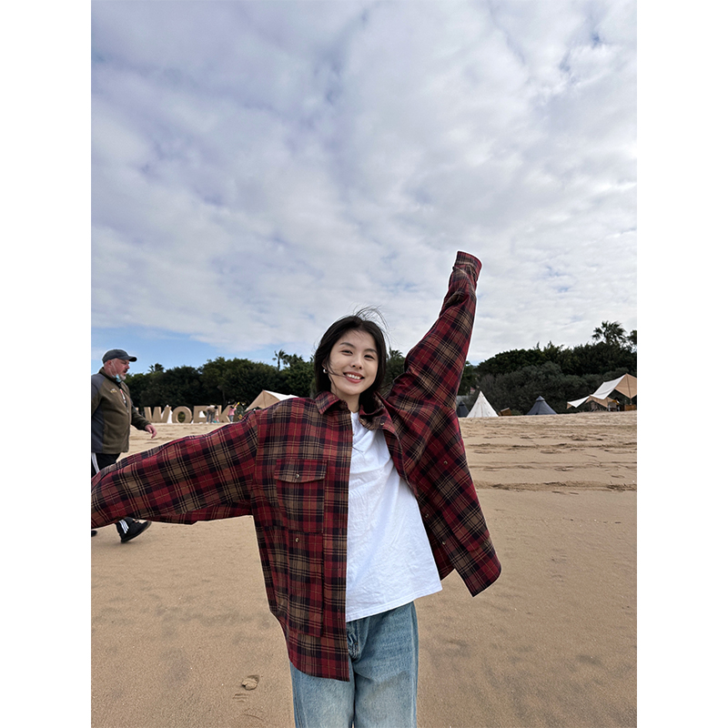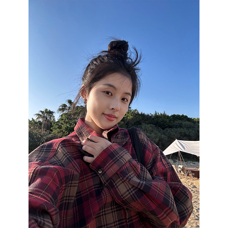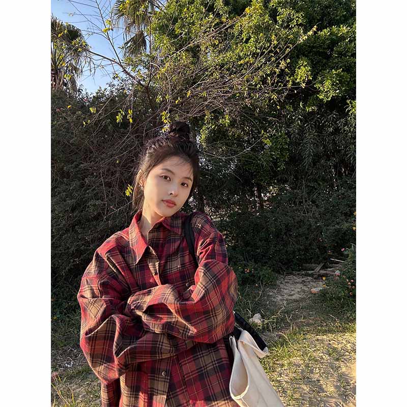 陳小腿~Turn left 紅格紋撞色復古襯衫女春夏設計感小眾寬鬆上衣